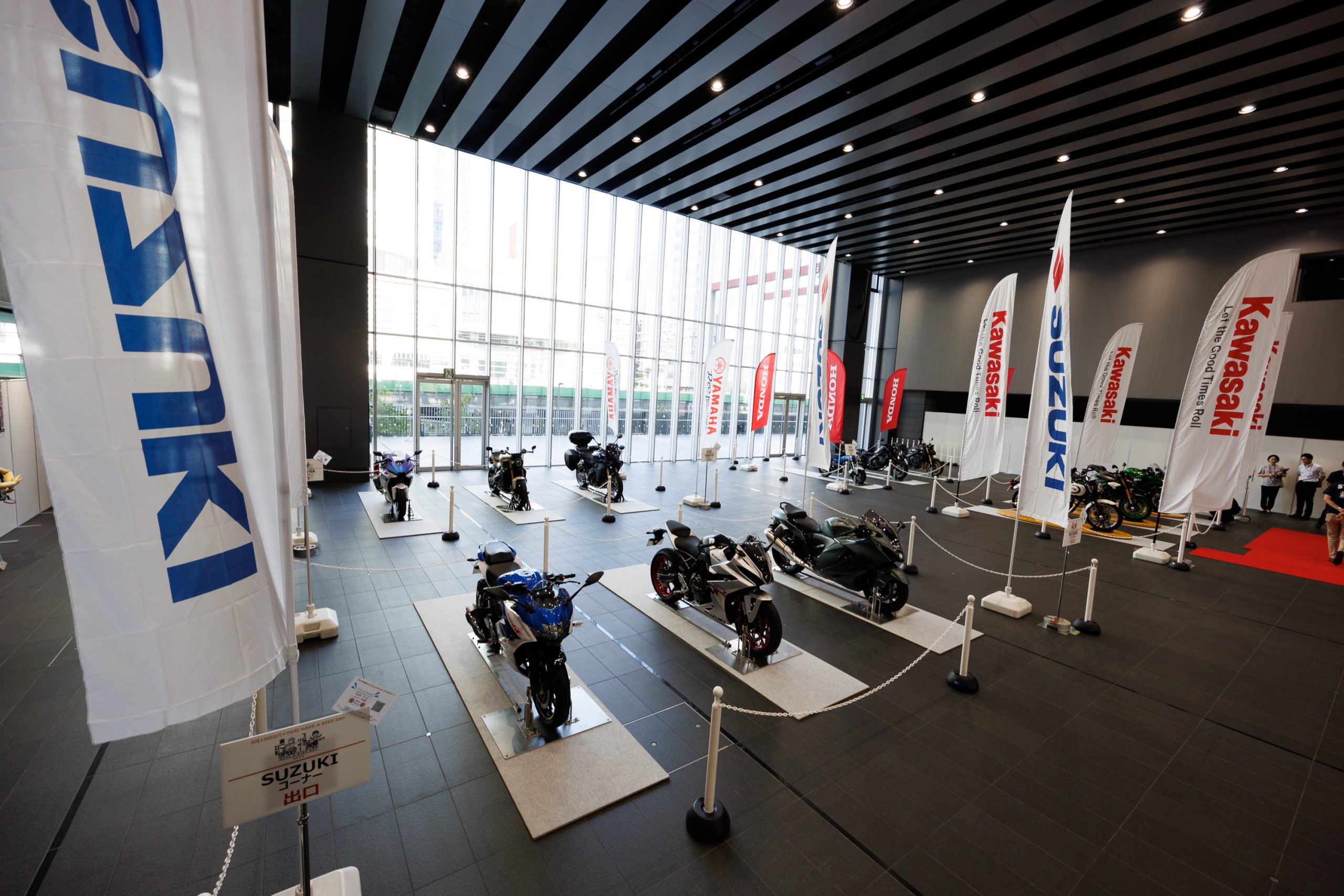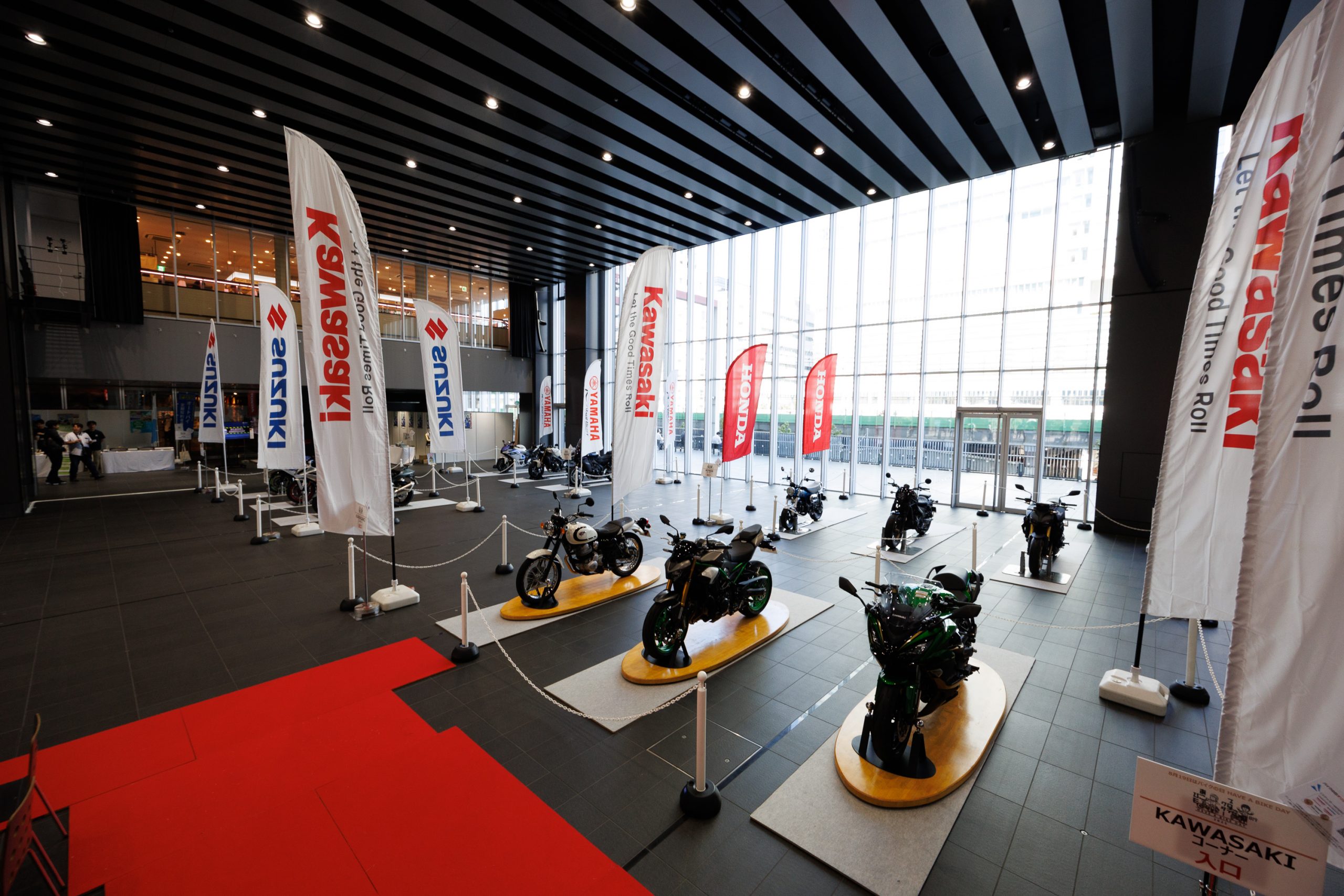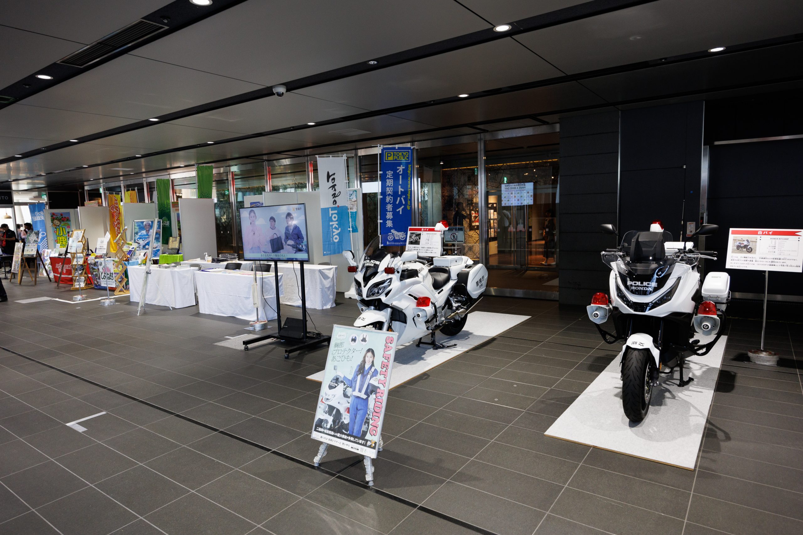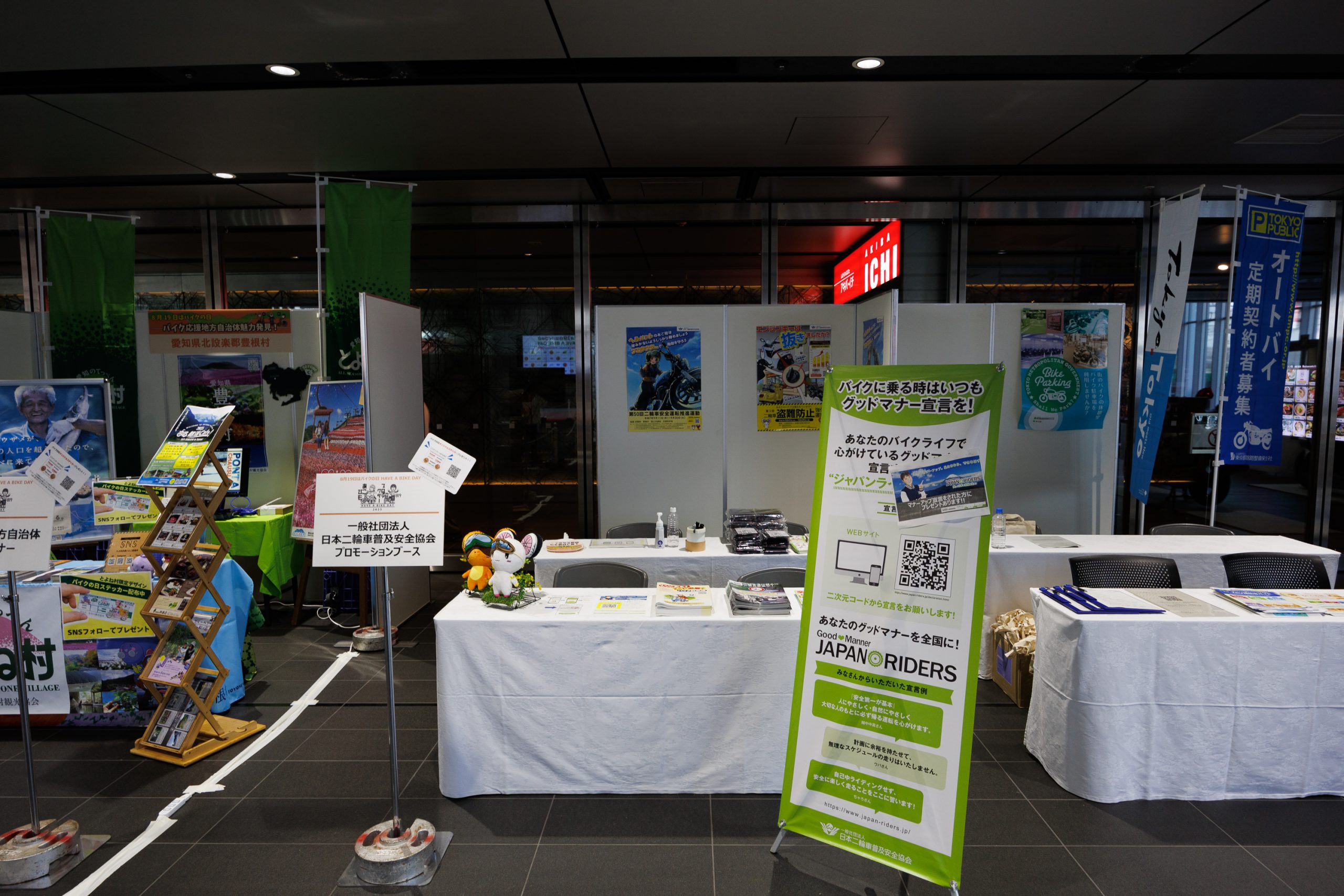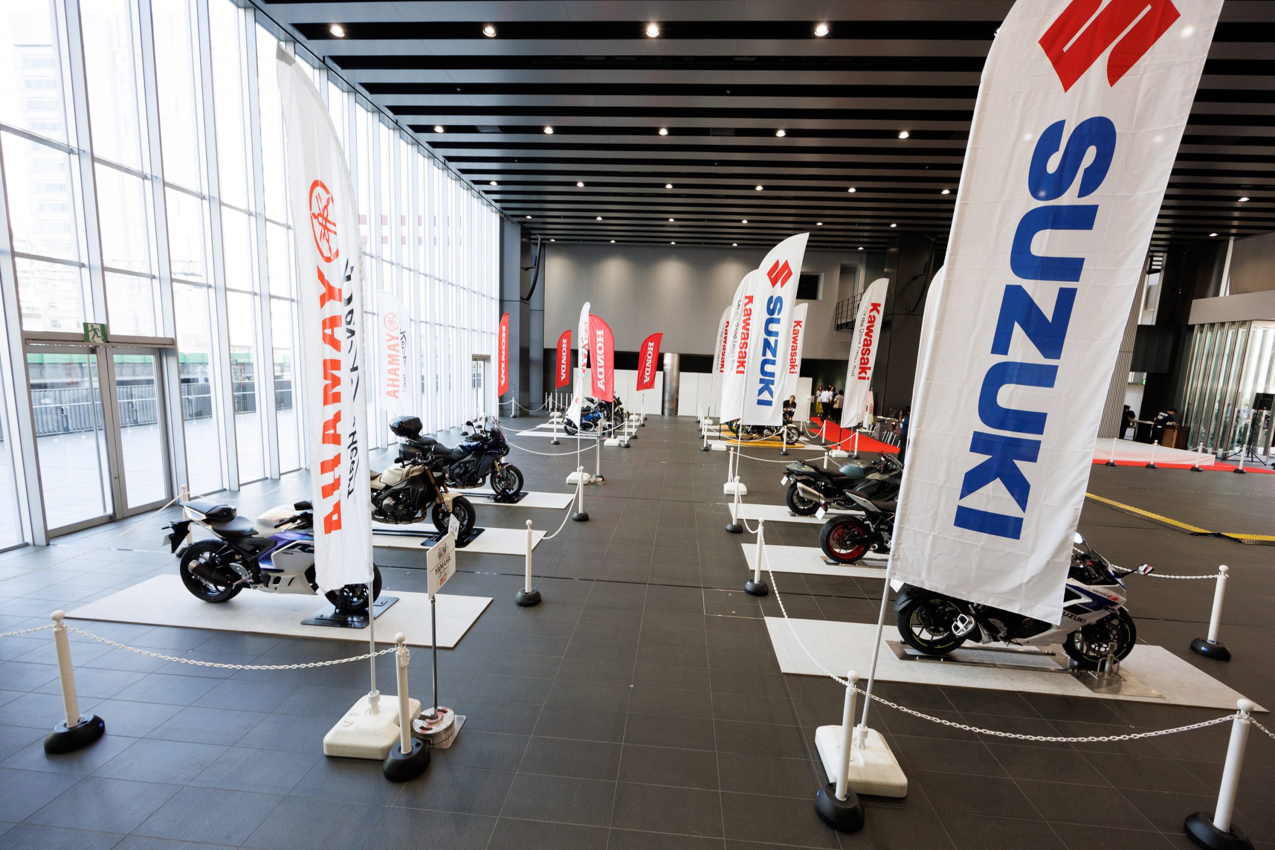 ステージのほかに国内4メーカーの新型モデル、レースマシンの展示や警視庁のご協力をいただき白バイの展示並びに東京都さまによる二輪駐車場のご紹介や地方自治体の皆さまのブースもございます。