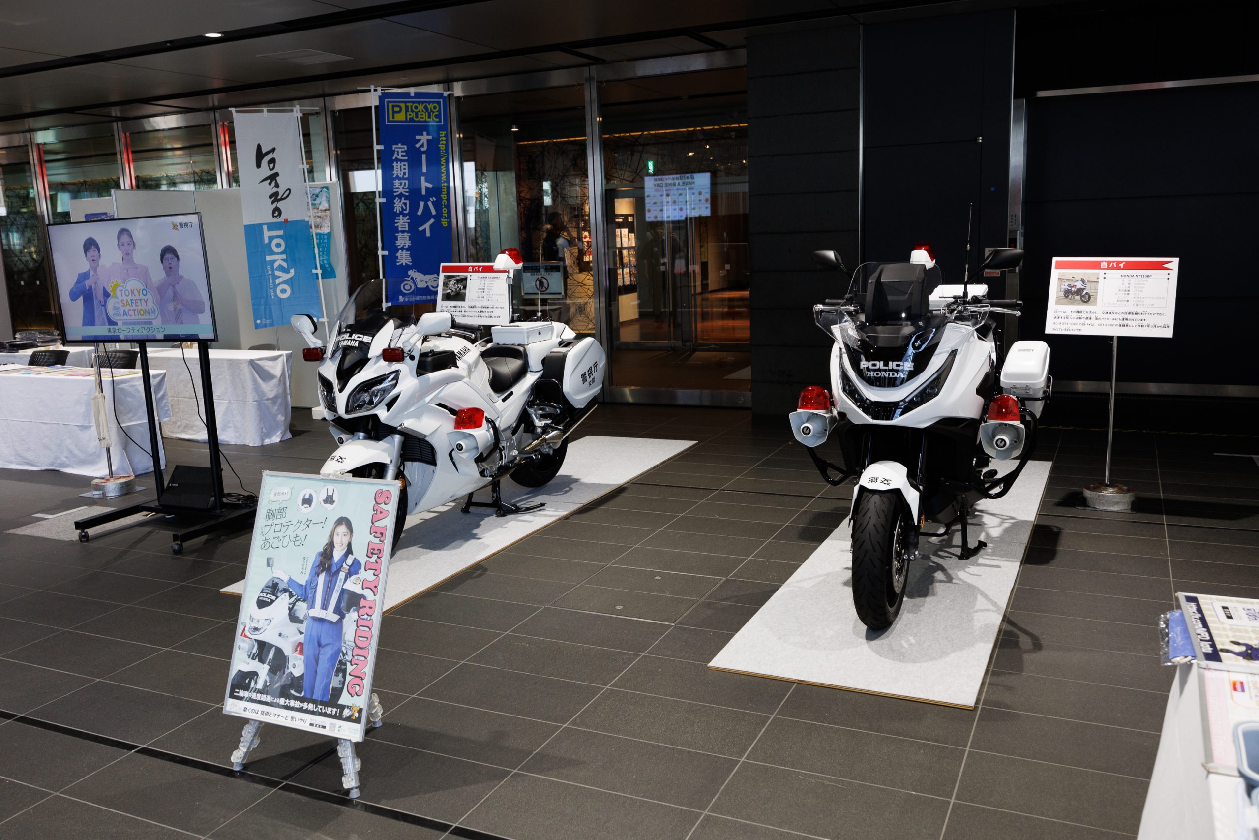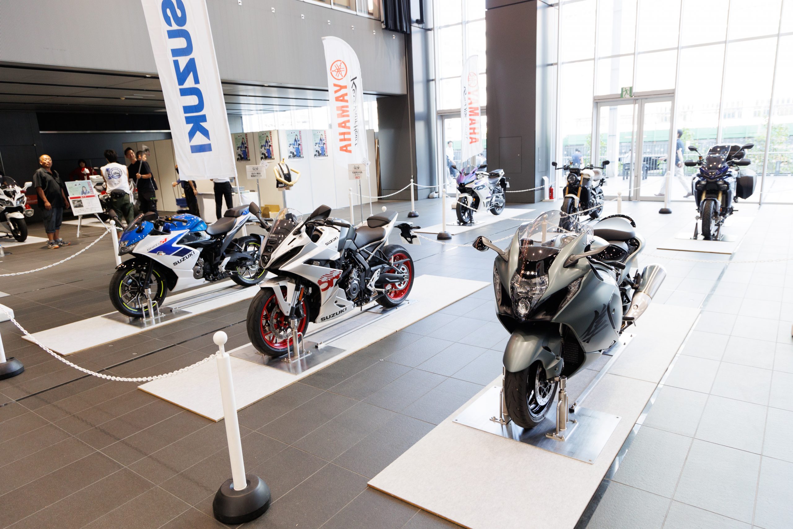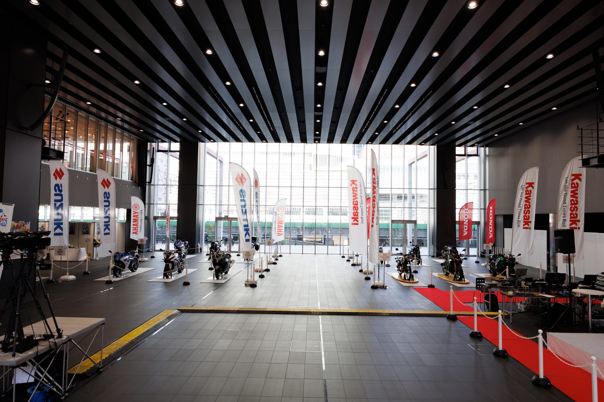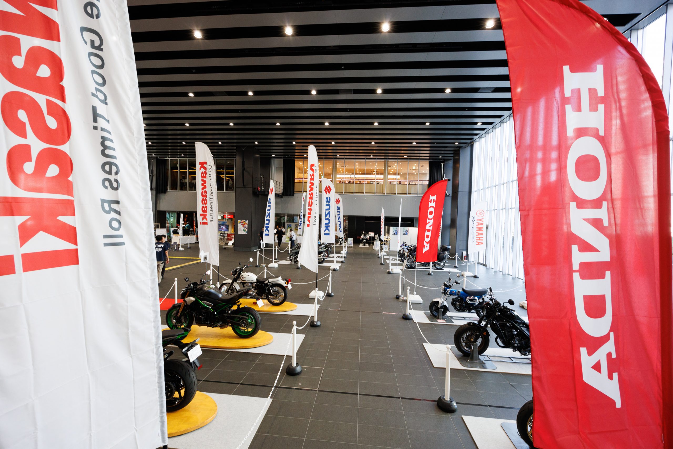 ステージのほかに国内4メーカーの新型モデル、レースマシンの展示や警視庁のご協力をいただき白バイの展示並びに東京都さまによる二輪駐車場のご紹介や地方自治体の皆さまのブースもございます。