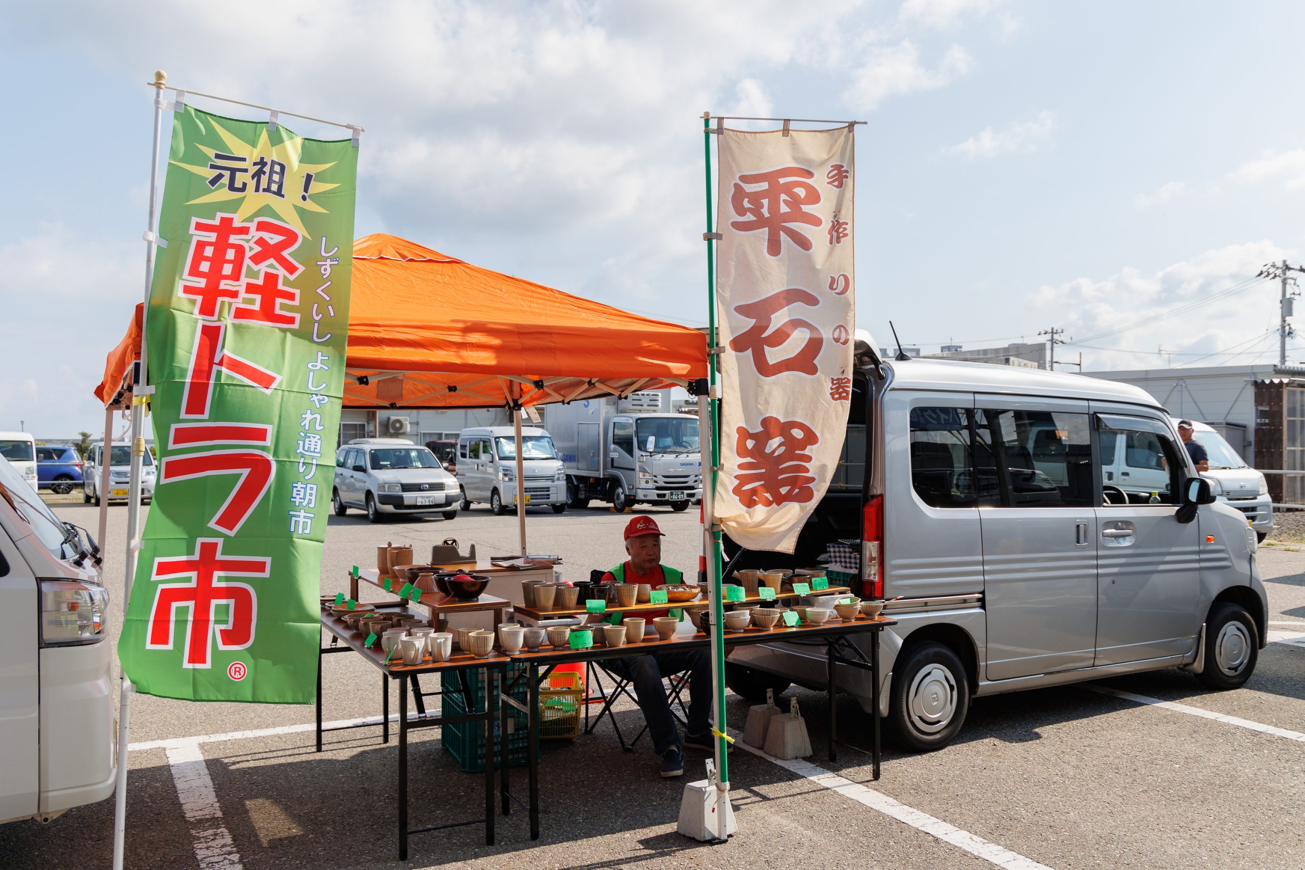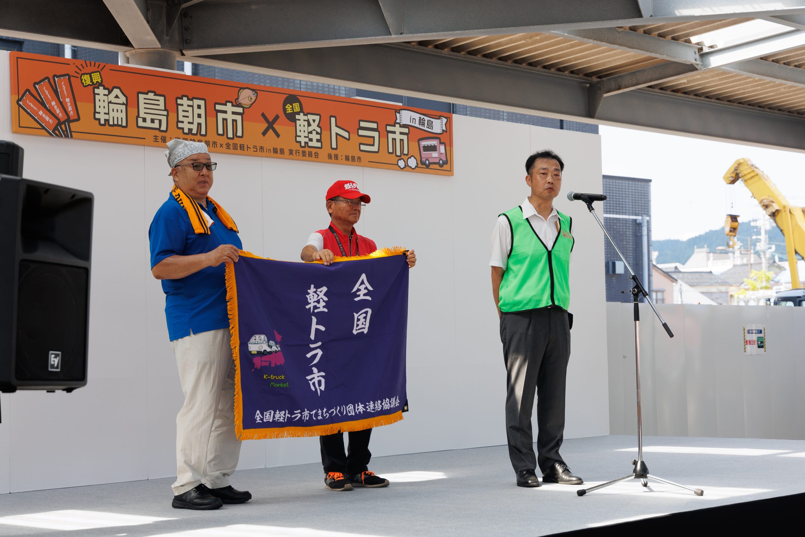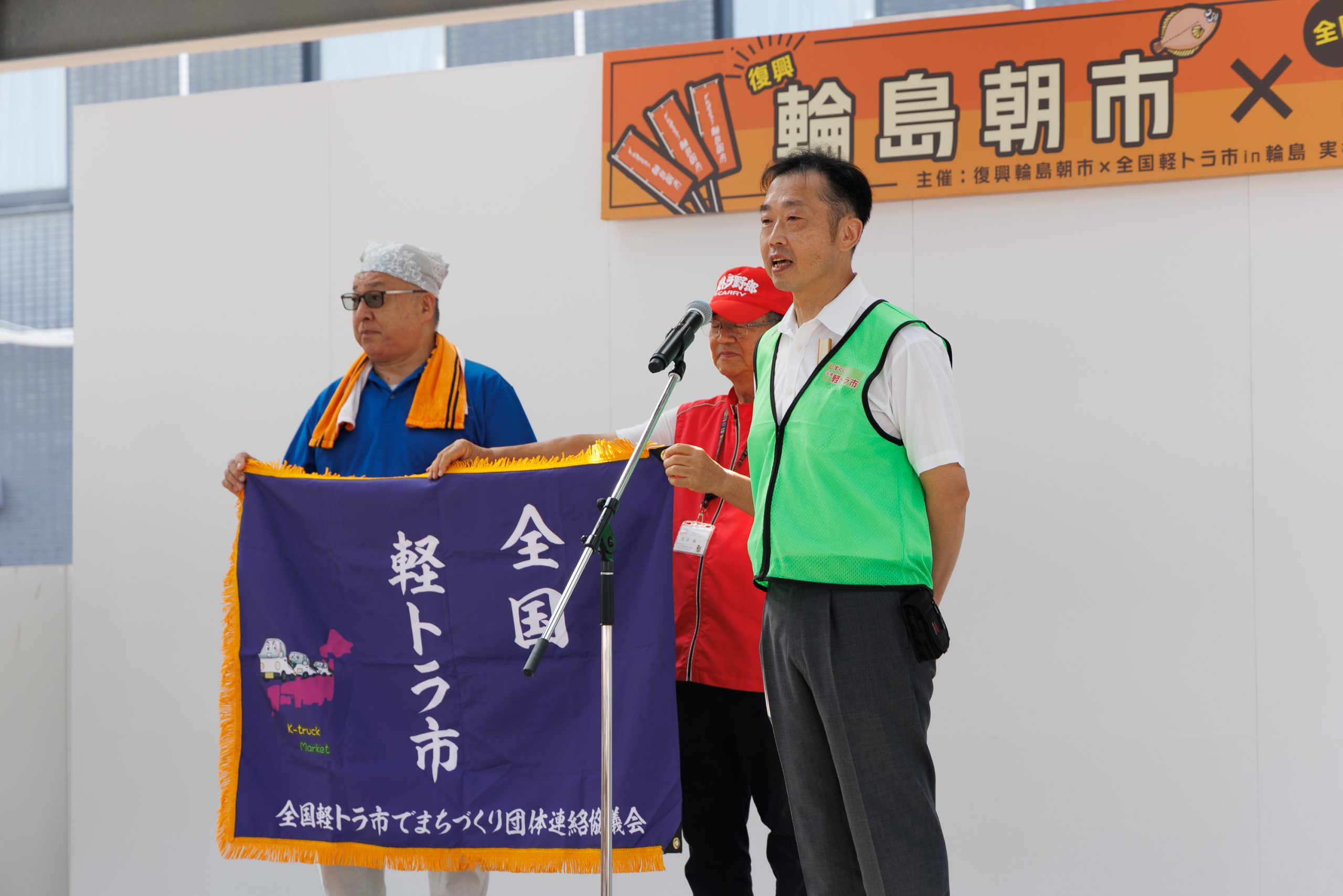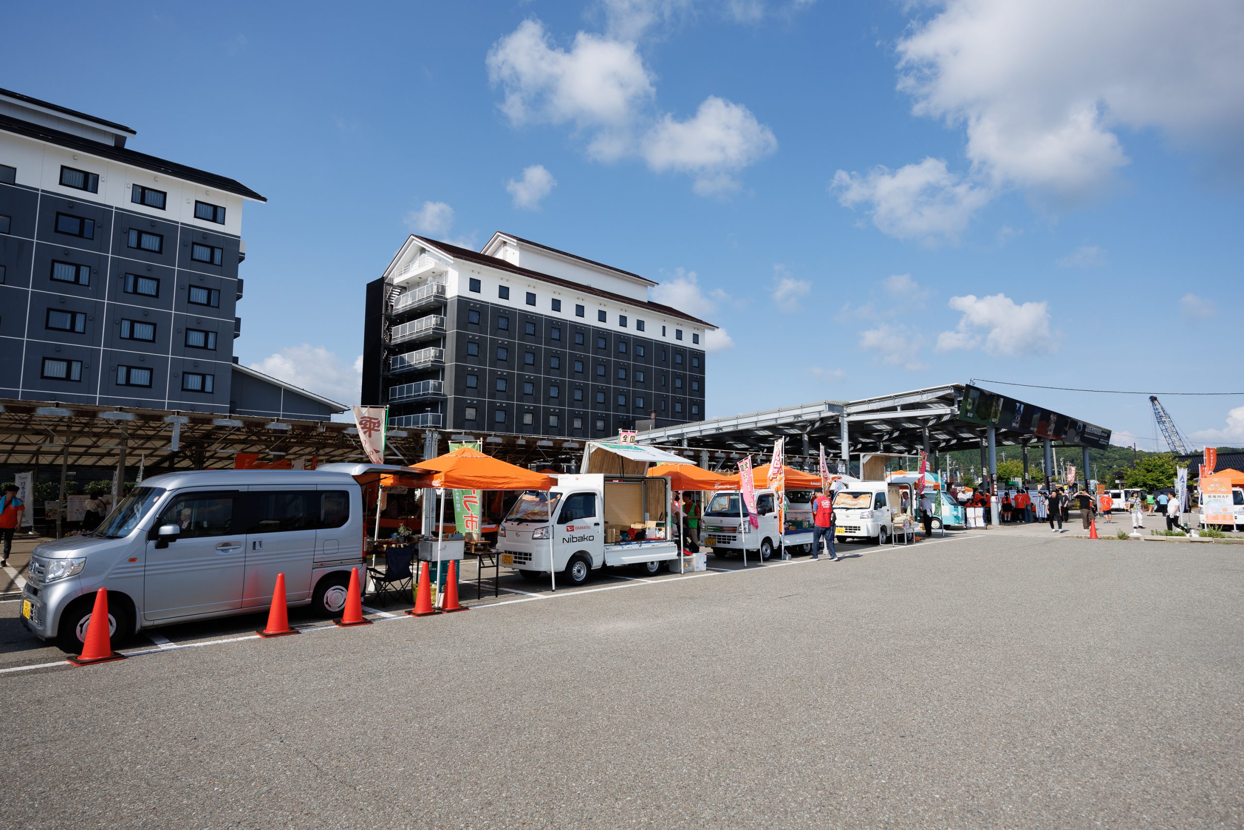 朝市通りの復興はまだ完了していませんが、輪島朝市の1,200年の歴史を守ろうと地元の「輪島市朝市組合」が行っているのが「出張輪島朝市」です。出張輪島朝市では、輪島朝市の皆さんが、輪島市内だけでなく全国各地に出向いて、伝統工芸品や特産物等を販売を行う取り組みで、今回は輪島市内の特設会場にて全国軽トラ市団体連合会とともに、「復興輪島朝市×全国軽トラ市in輪島」として、輪島朝市の約30店と全国各地の軽トラ市からの17台によるイベントを開催しました。