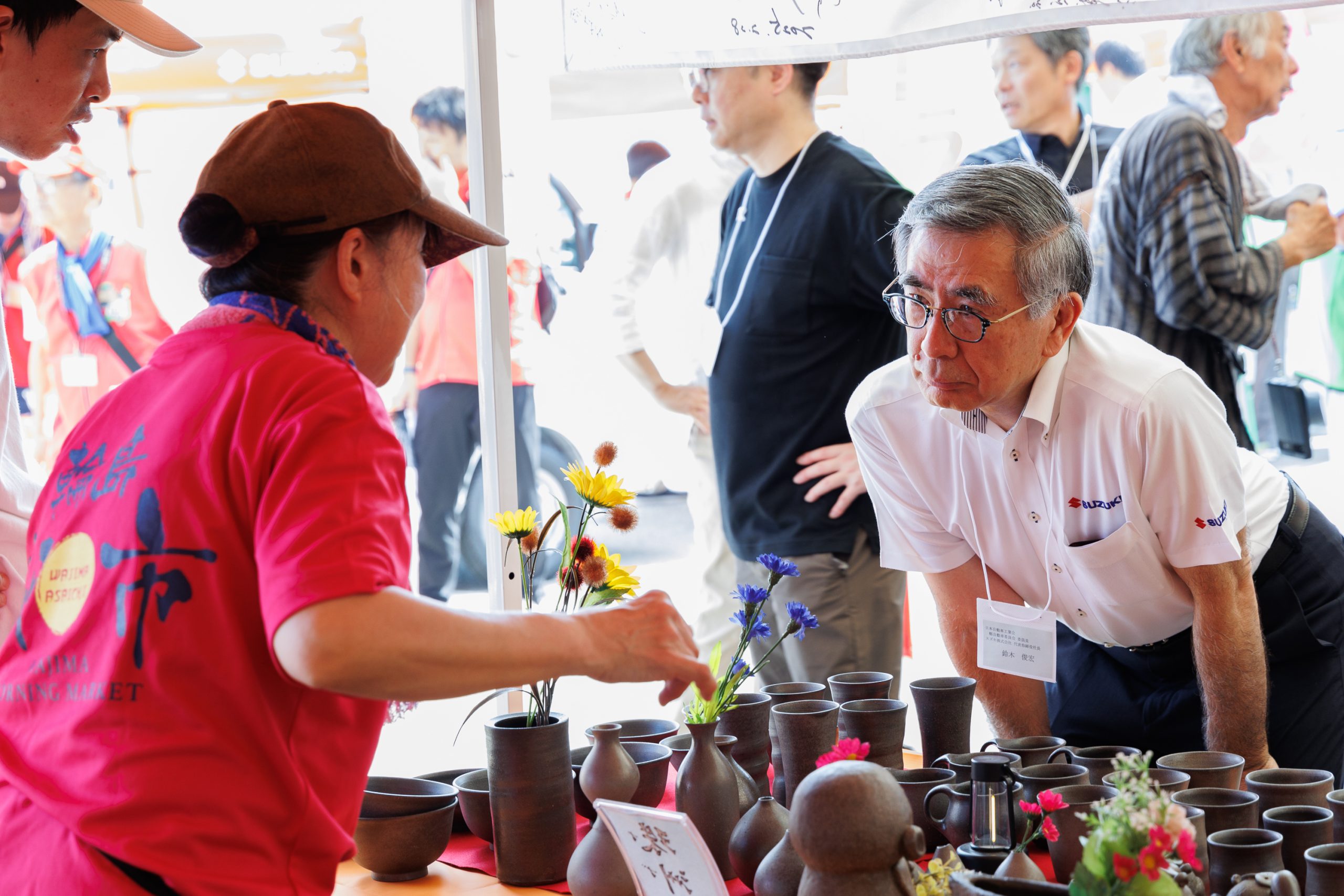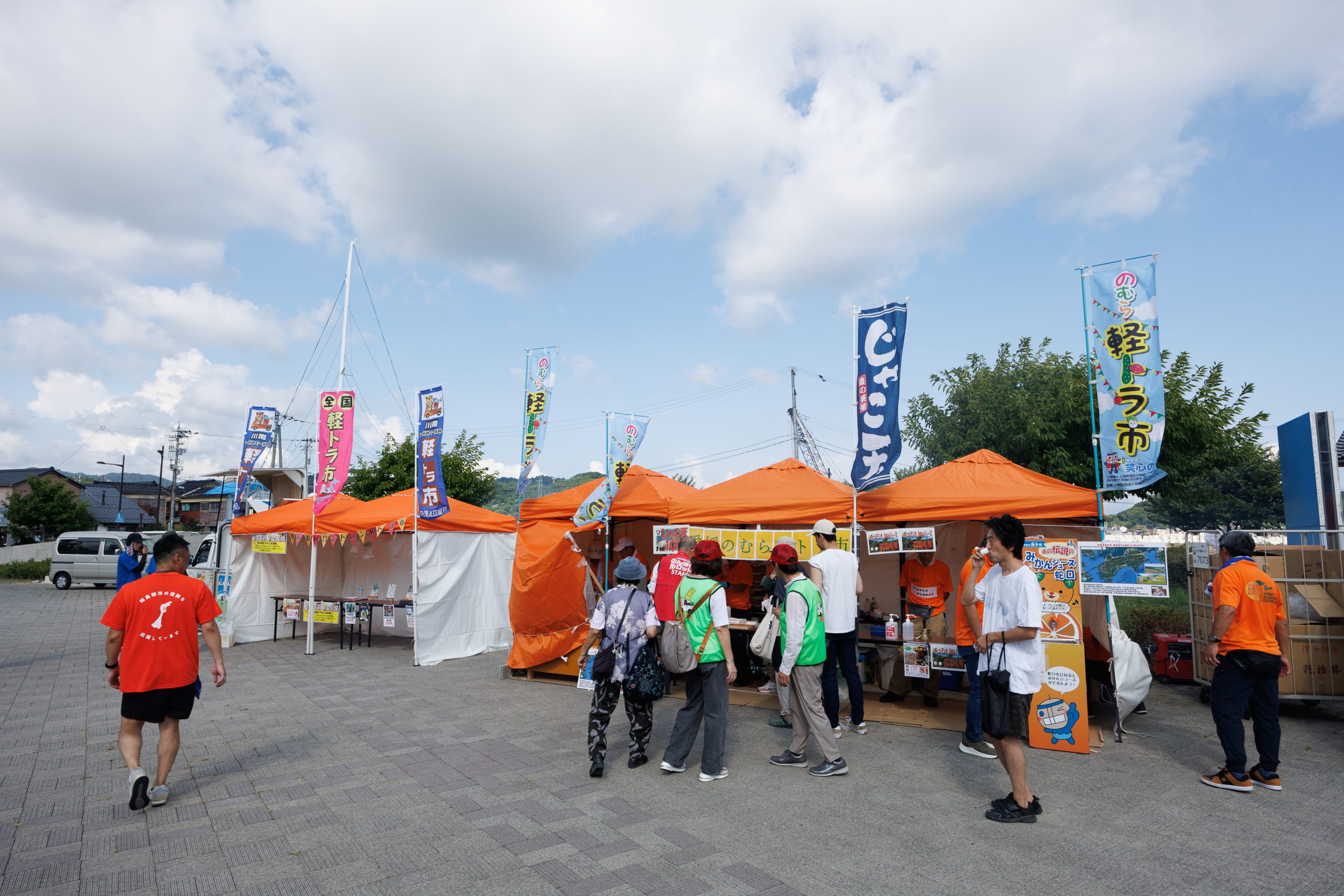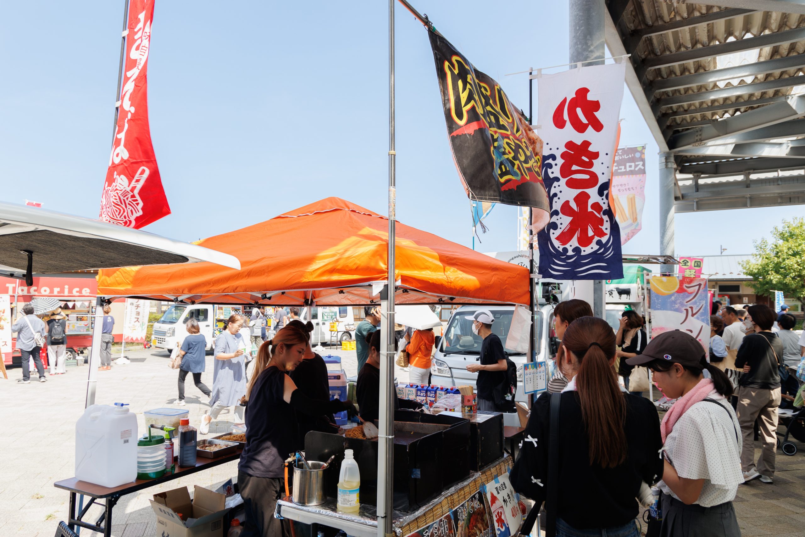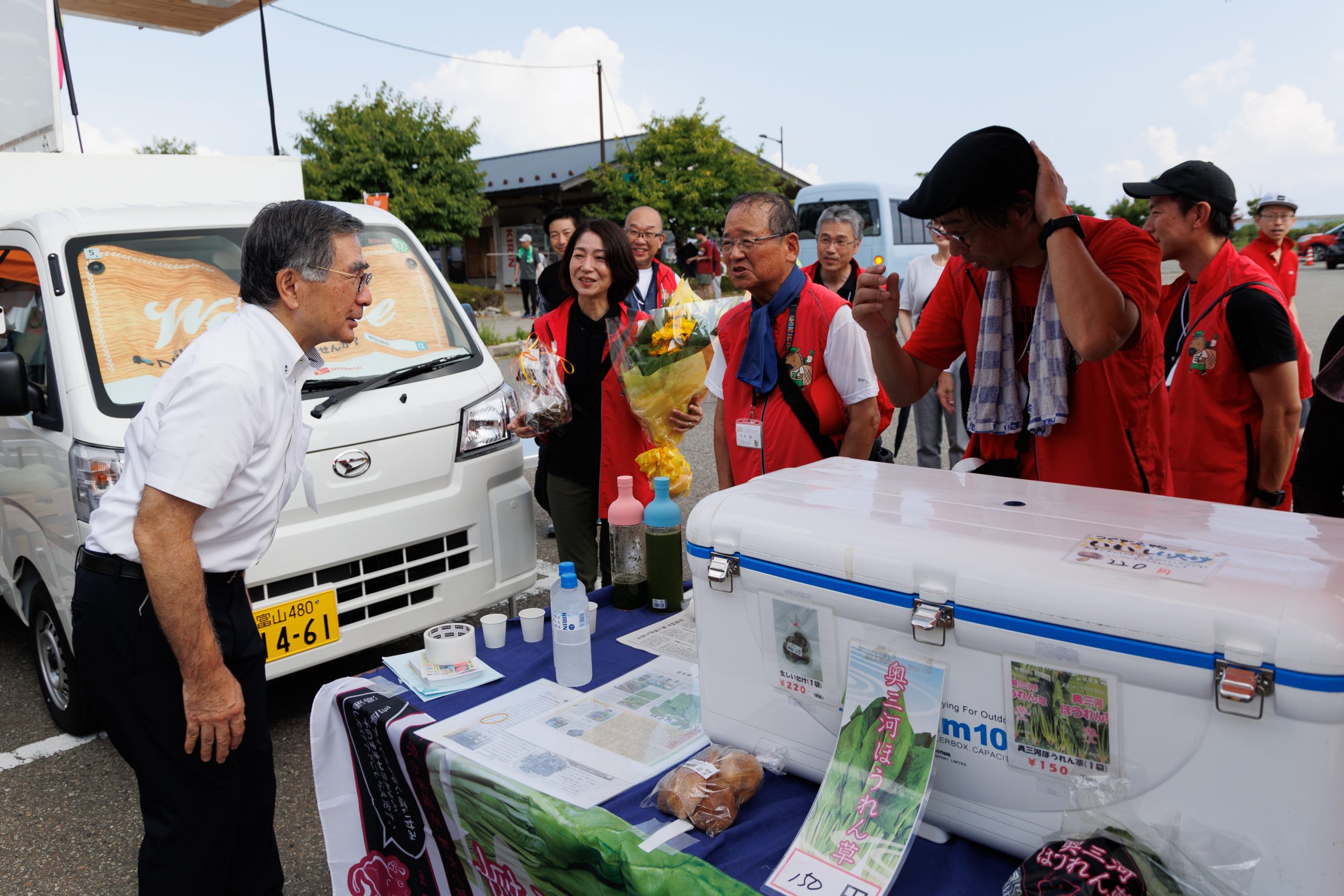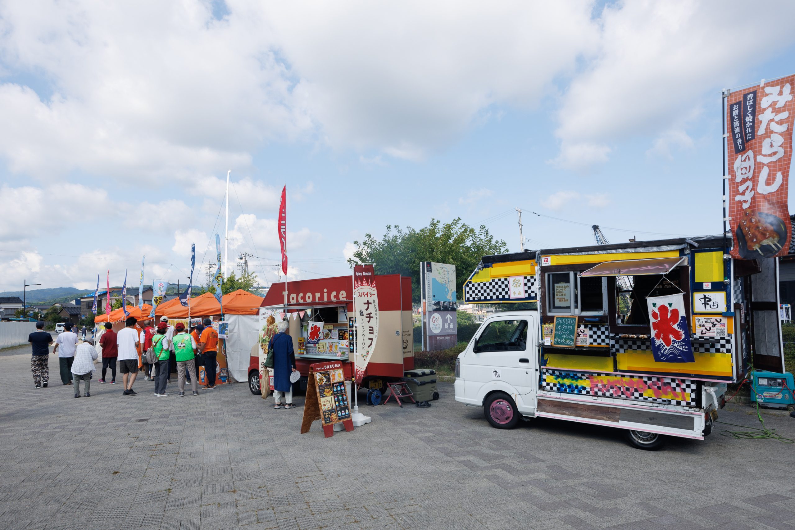 朝市通りの復興はまだ完了していませんが、輪島朝市の1,200年の歴史を守ろうと地元の「輪島市朝市組合」が行っているのが「出張輪島朝市」です。出張輪島朝市では、輪島朝市の皆さんが、輪島市内だけでなく全国各地に出向いて、伝統工芸品や特産物等を販売を行う取り組みで、今回は輪島市内の特設会場にて全国軽トラ市団体連合会とともに、「復興輪島朝市×全国軽トラ市in輪島」として、輪島朝市の約30店と全国各地の軽トラ市からの17台によるイベントを開催しました。