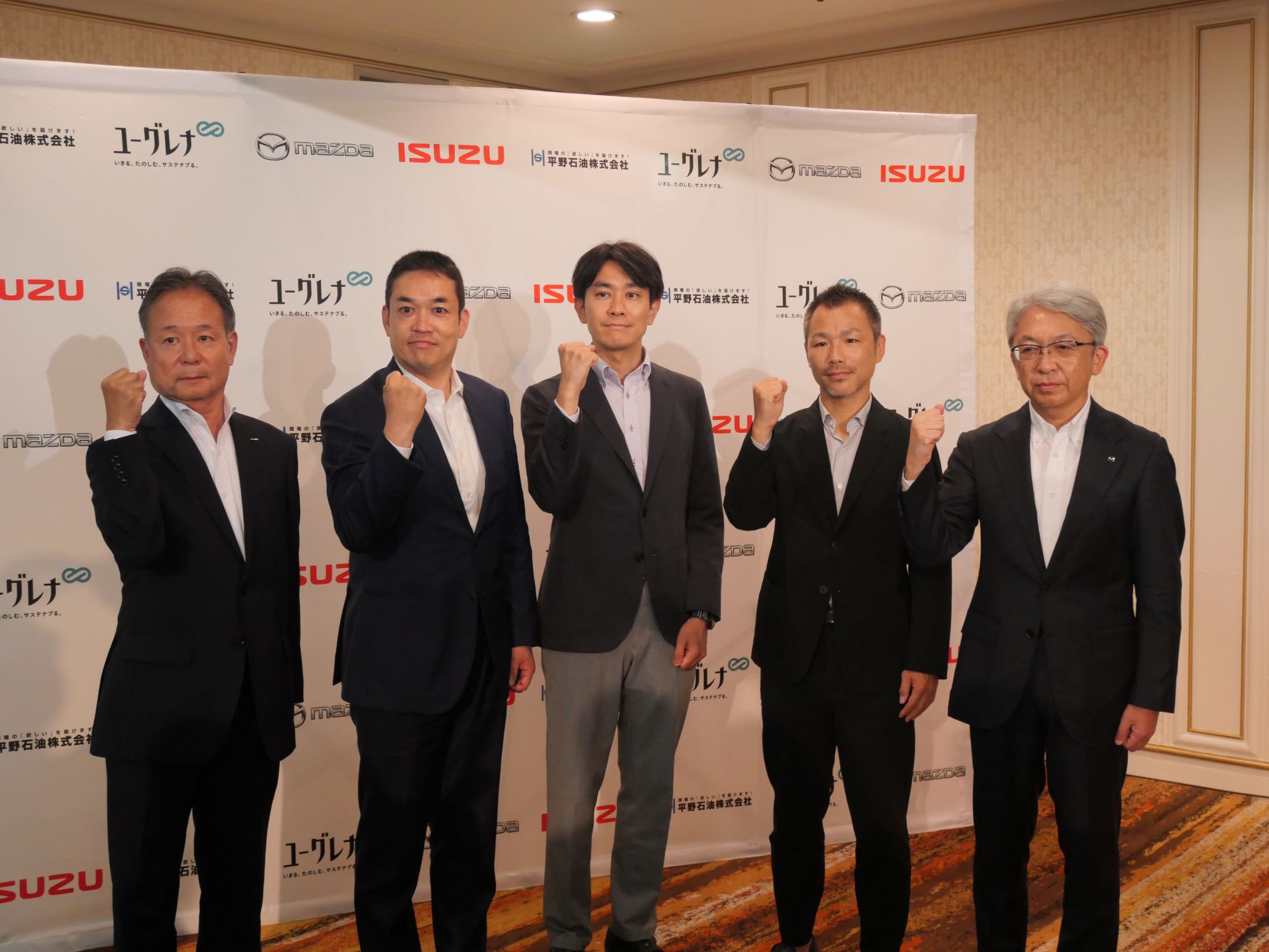 8月22日、「次世代バイオディーゼル体験会~Next Gen. Bio-Diesel Trial Session~」が東京都内で開催されました。植物由来の食用油などから作るバイオ燃料を軽油と混合したバイオディーゼル燃料はカーボンニュートラル(CN)につながる液体燃料として期待されています。この体験会はバイオディーゼル燃料への理解を深め、且つその燃料を利用して、脱炭素化社会の実現に向けた取り組みがすでに市場実装されていることを紹介し、企業や自治体、法人企業に対し、バイオディーゼル燃料の利用を提案することが目的です。ディーゼルエンジン車を生産・販売するマツダ、いすゞ自動車のほか、バイオディーゼル燃料を供給するユーグレナ、燃料の輸送を手掛ける平野石油の4社が主催しました。