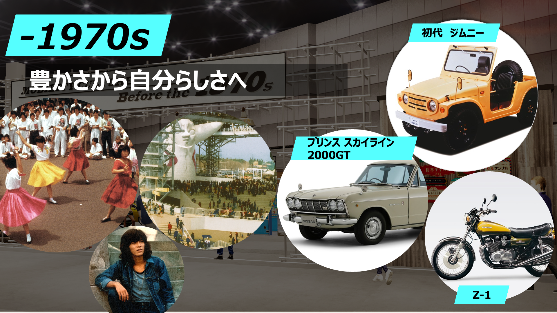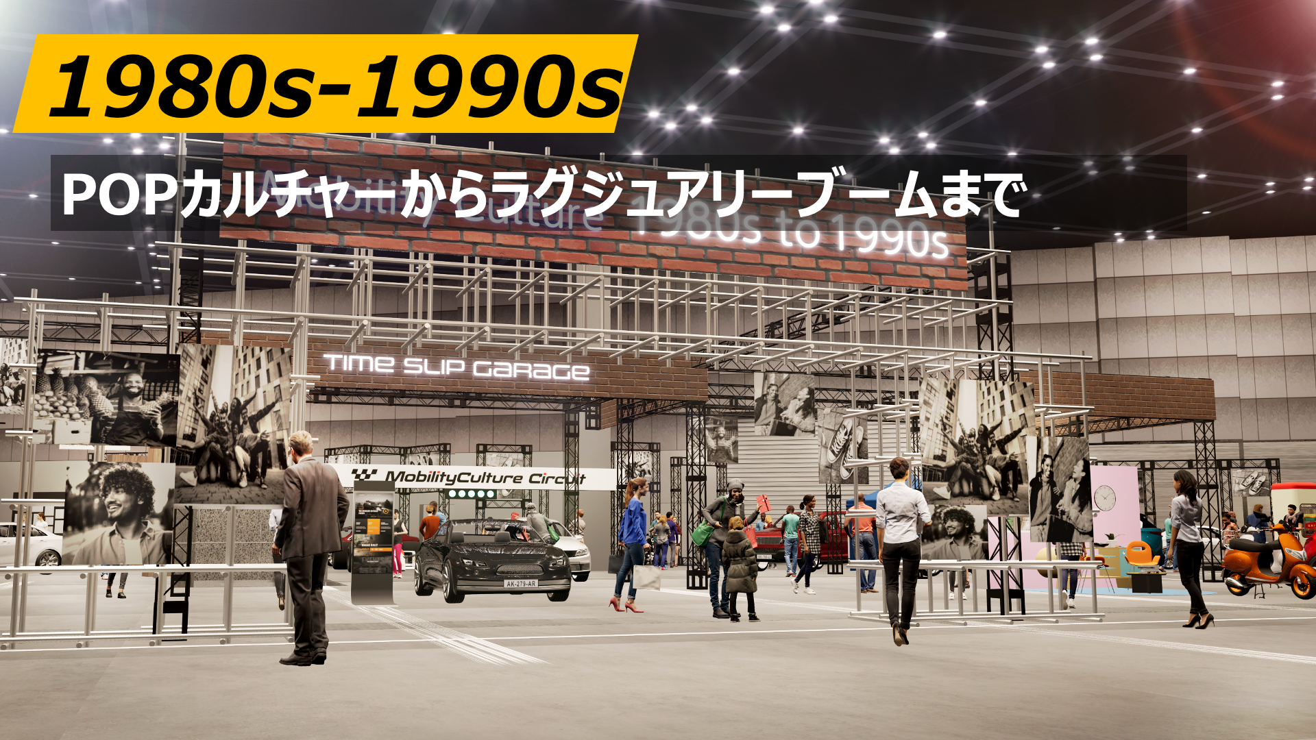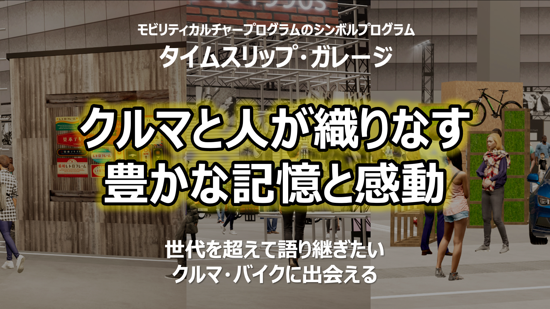 はじめにご紹介するのは、自動車メーカー合同で行う「タイムスリップ・ガレージ」です。「タイムスリップ・ガレージ」は、単なる自動車の合同展示ではなく、戦後から現代まで、様々なモビリティが如何に社会と響き合い、ライフスタイルや、感性を形づくってきたか、当時の情景とともに、大きく3つの年代でお届けする展示プログラムです。