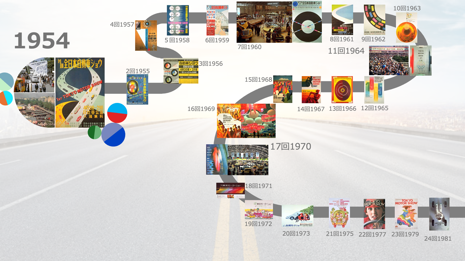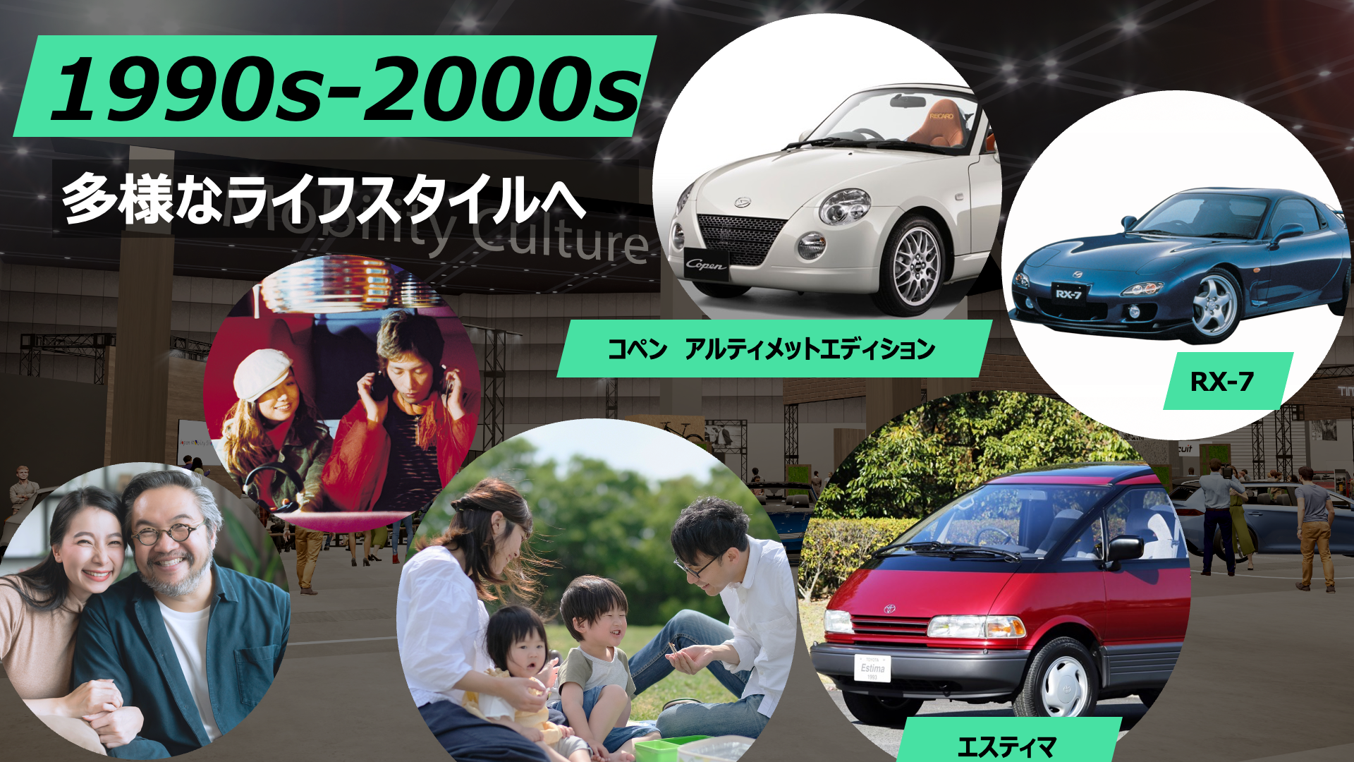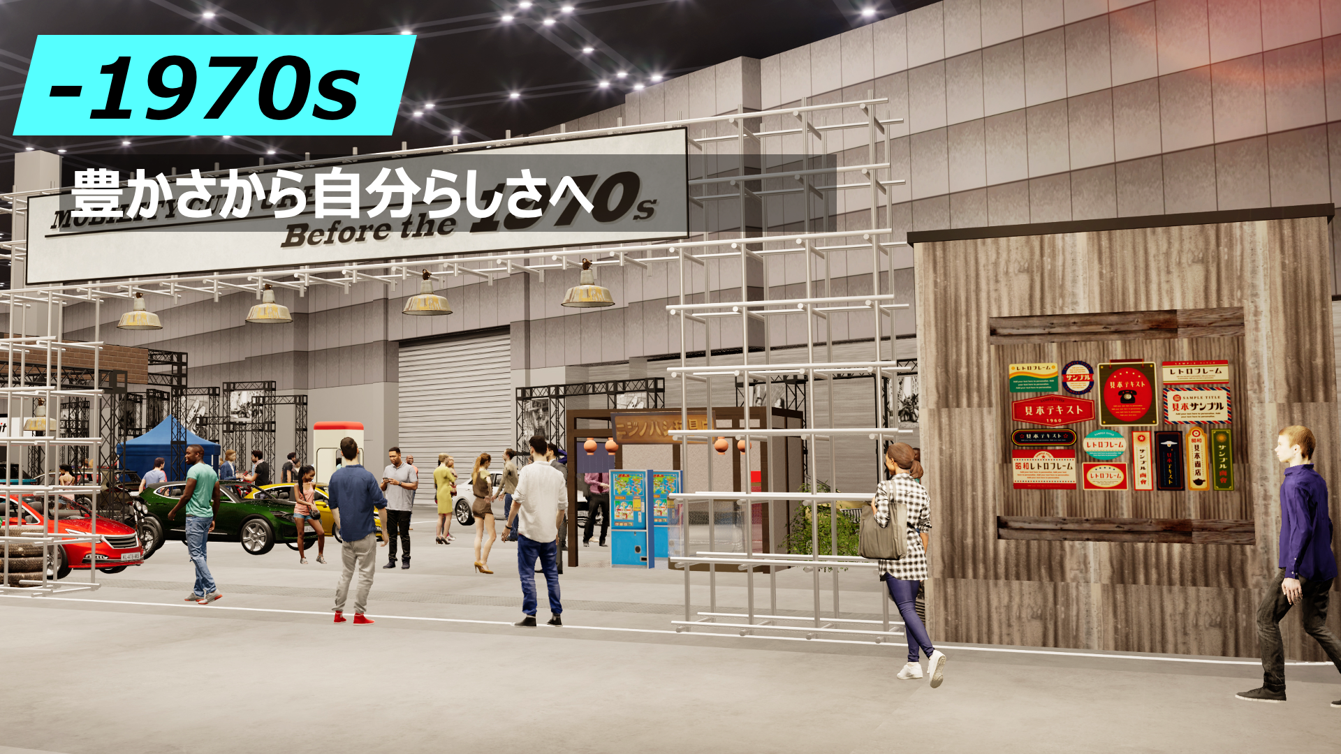 はじめにご紹介するのは、自動車メーカー合同で行う「タイムスリップ・ガレージ」です。「タイムスリップ・ガレージ」は、単なる自動車の合同展示ではなく、戦後から現代まで、様々なモビリティが如何に社会と響き合い、ライフスタイルや、感性を形づくってきたか、当時の情景とともに、大きく3つの年代でお届けする展示プログラムです。