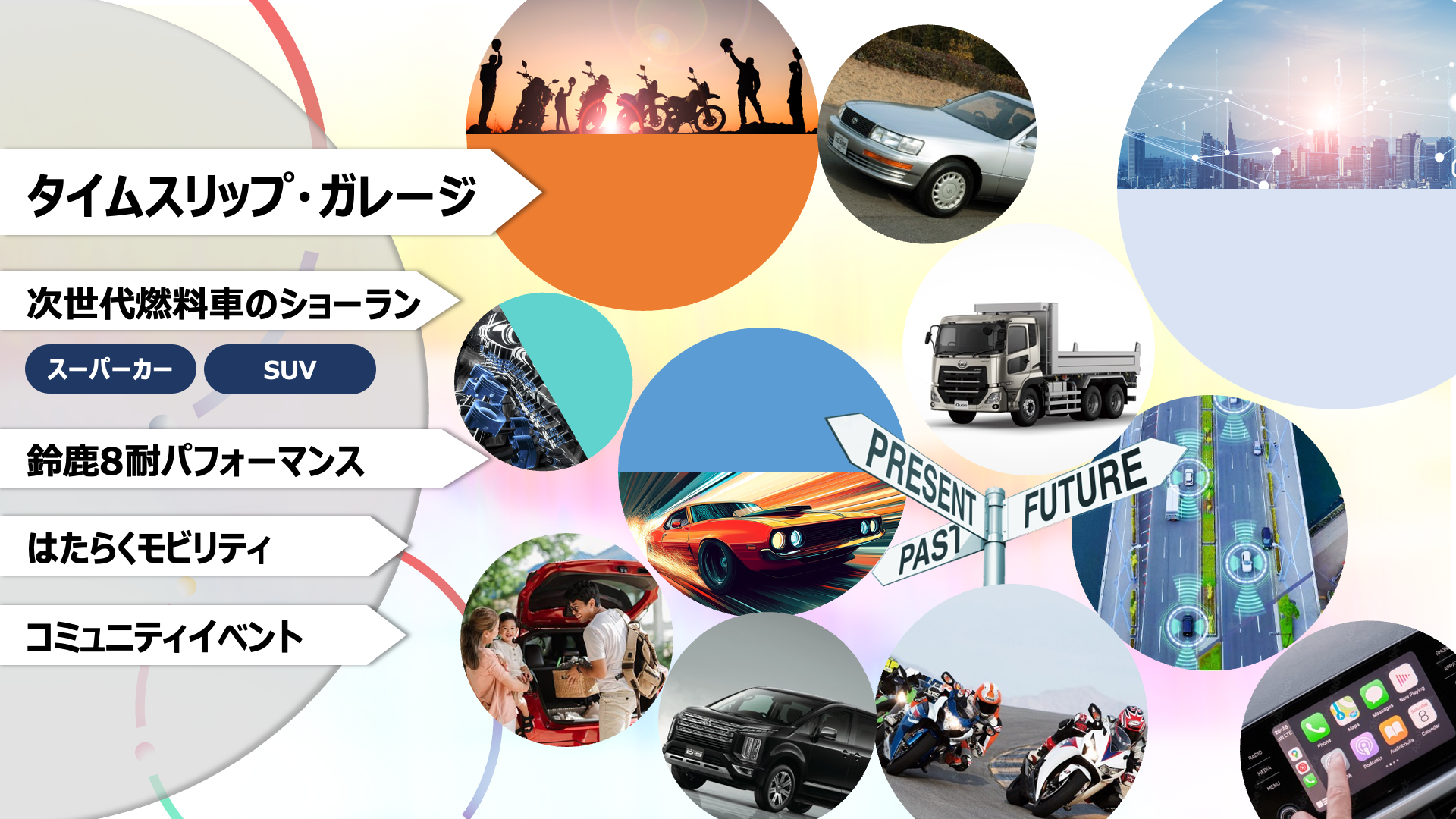 また、モビリティの展示だけでなく、クルマ・バイクのファンイベントも開催します。コーヒー⽚⼿に情報交換をしたり、愛車への熱い想いを共有したり、誰でも気軽に参加でき、新しい仲間に出会える場として、今まさに、クルマやバイクを思いきり楽しんでいる人たちの輪が、ここから拡がっていくことでしょう。