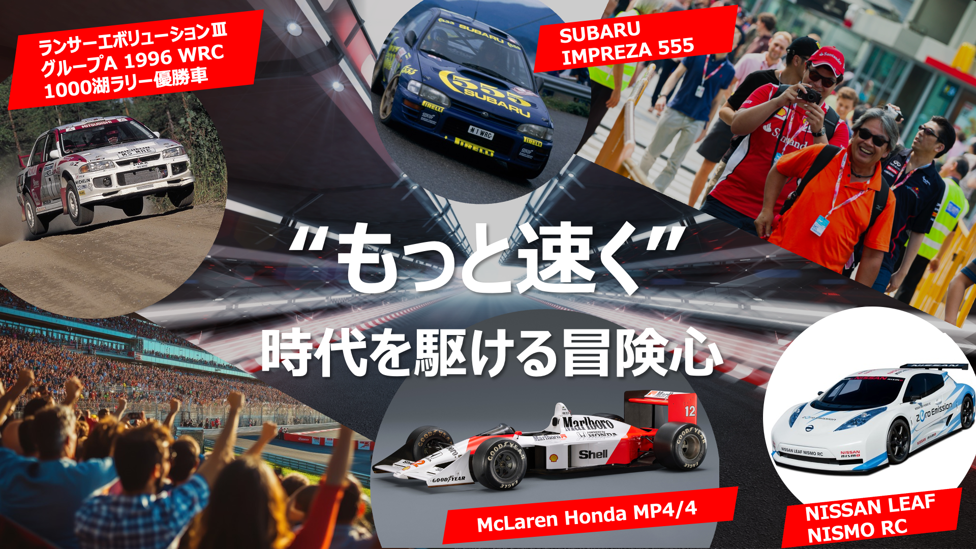 そして、どの時代にも通じるのが、「もっと速く」という「速さへの追求」です。モータースポーツの熱狂はもちろん、そこで培った技術や感性は、その時代に合わせて、市販車へも還元されていきました。速さを追い求めることは、冒険心そのものであり、極限で戦うレースカーから、スポーツモデルまで、その時代ごとの冒険心に、胸を踊らせてください。