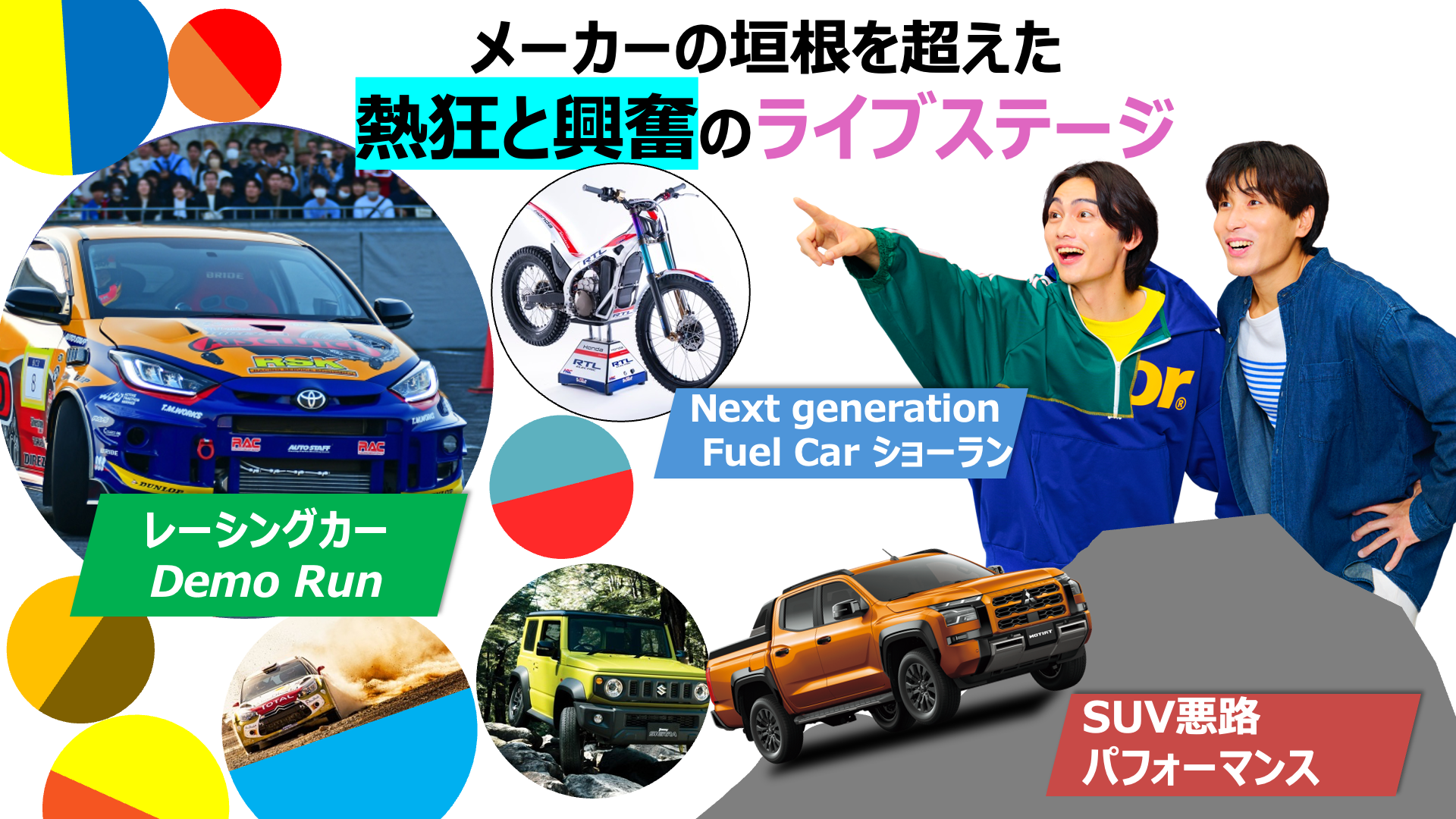 非常に多くのプログラムをご紹介し、盛りだくさんの内容となりましたが、クルマやバイク好きの方はもちろん、お子さまも、大人も、家族でも、誰もがお楽しみいただけるイベントになっておりますので、ご来場をお待ちしております。