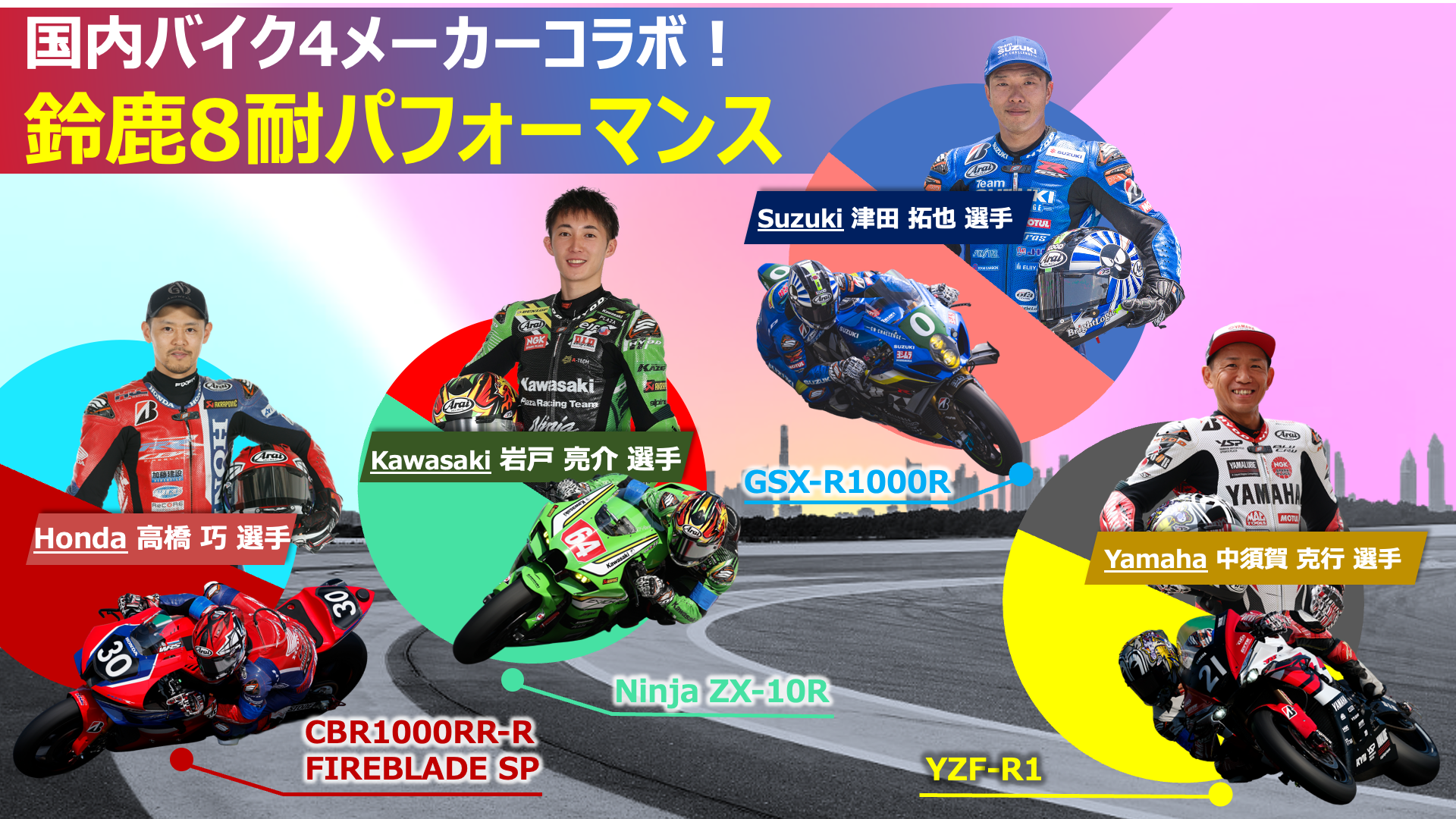 さらに、国内バイク4メーカーのコラボによる鈴鹿8耐パフォーマンスも開催いたします。8耐を戦い抜いたマシンとライダーが、特別にモビショーに登場。普段、サーキットに馴染みがない方も、響き渡る轟音、ライダーの熱気、マシンの躍動をぜひこの機会に、体感してください。