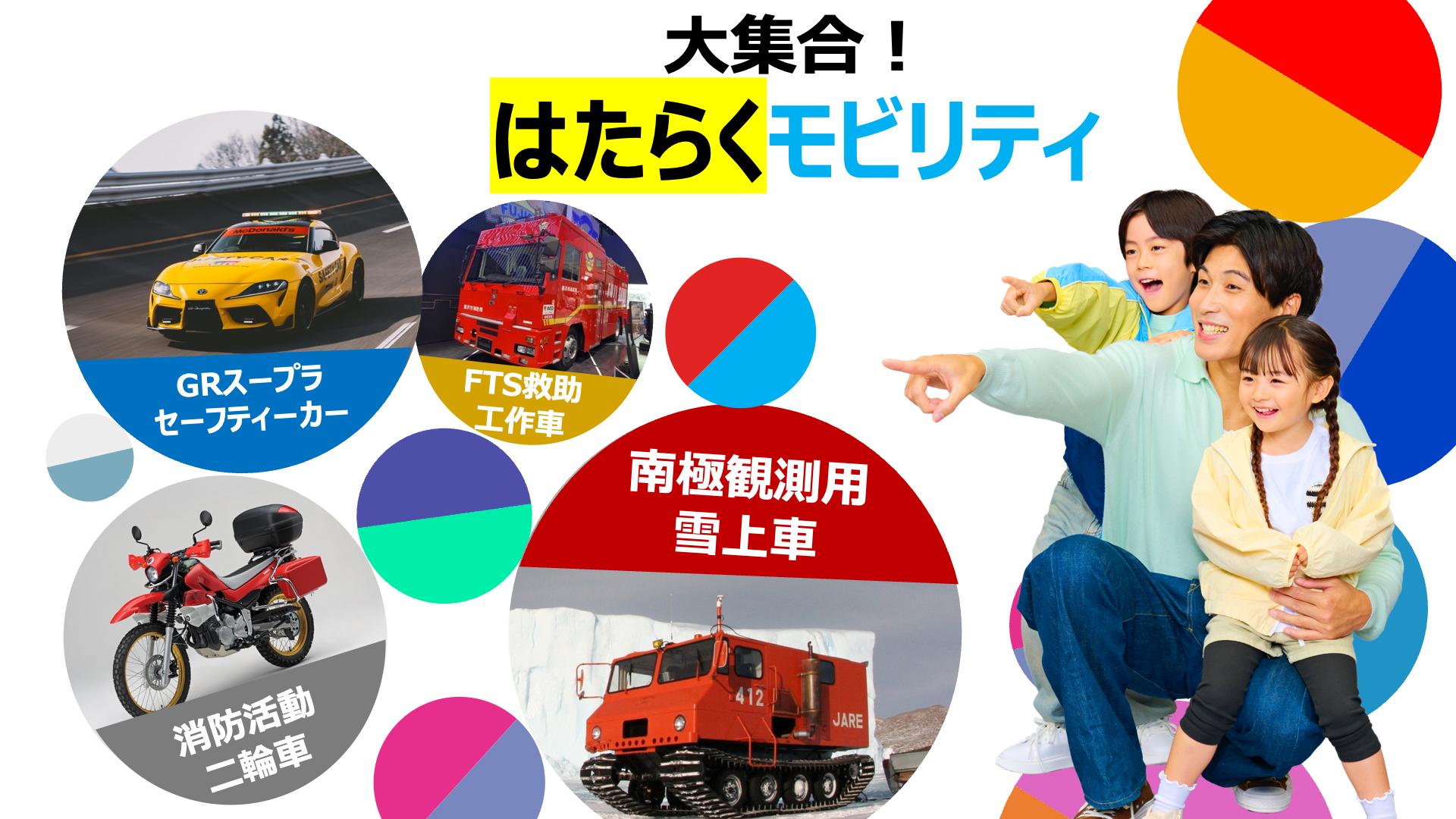 はたらくモビリティとして、「消防活動二輪車」 や 「救助工作車」など、いざという時を支えるモビリティや、「南極観測用 雪上車」 など 「はたらく」 を拡張するモビリティも展示されます。子どもから、大人、家族みんなで、頼もしさとワクワクが同居する空間をお楽しみください。