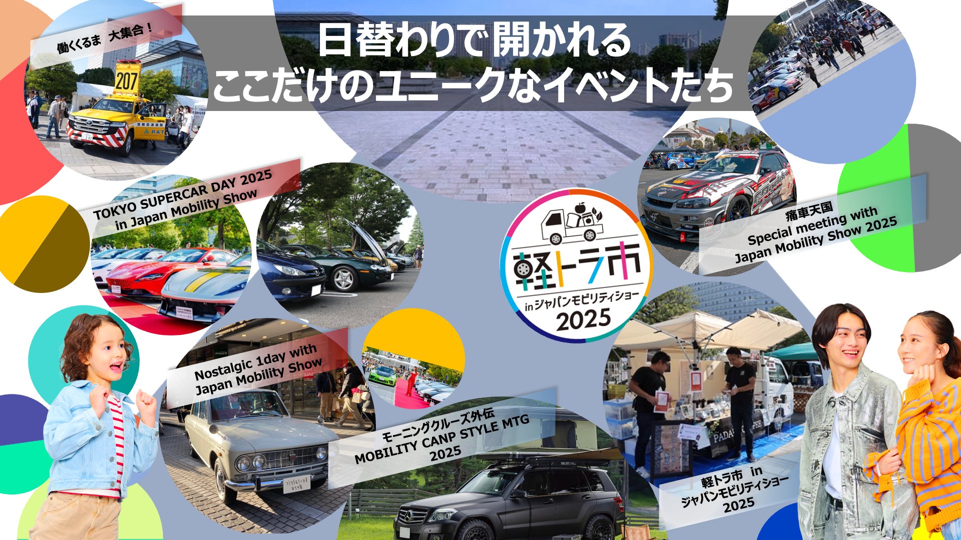 最後に、レギュラーイベントではありませんが、ユニークな日替わり展示も開催いたします。日本全国の特産品を軽トラで運び、集う、軽トラ市。スーパーカーが一堂に会する特別な展示イベント。国内外で注目されるデコカーが集う痛車天国など、無料でお楽しみいただけるイベントもございます。是非、ご来場ください。