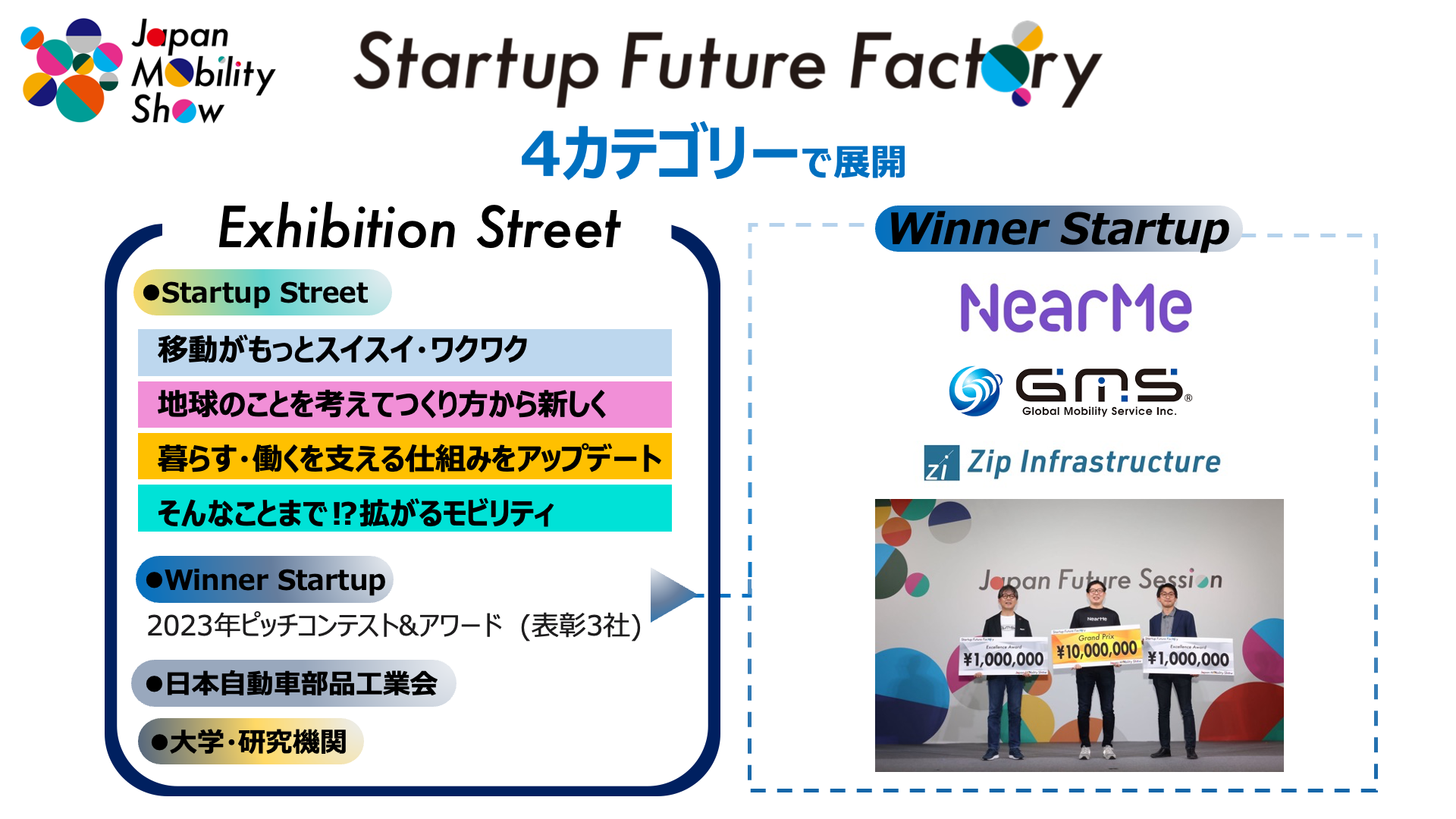 「Startup Future Factory」は、共創の輪を広げ、未来に向けて新たな挑戦を増やし、モビリティ産業が拡張していくための非常に重要な企画です。今回は、スタートアップ企業や、大学研究機関を含め、延べ129社が様々なプロダクトやサービス、技術を展示してくださいます。