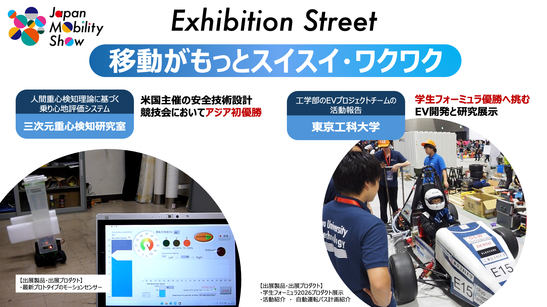 こちらのカテゴリーでは、小さなモーションセンサー1つで、大型トレーラーの横転防止や、乗車時の乗り心地評価を行い、国際会議でも評価を得ている、「三次元重心検知研究室」。EVフォーミュラカー開発プロジェクトを推進する「東京工科大学」の学生チームも参加。