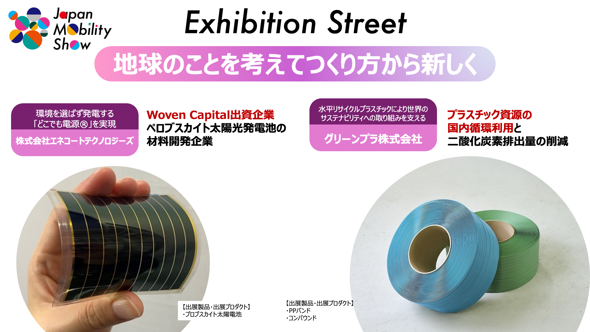 2つ目のカテゴリーでは、今、注目の集まるペロブスカイト太陽光発電池の材料を開発し、環境を選ばず発電する 「どこでも電源」 を実現した「株式会社 エネコートテクノロジーズ」。プラスチック資源の国内循環利用を実現する「グリーンプラ 株式会社」。