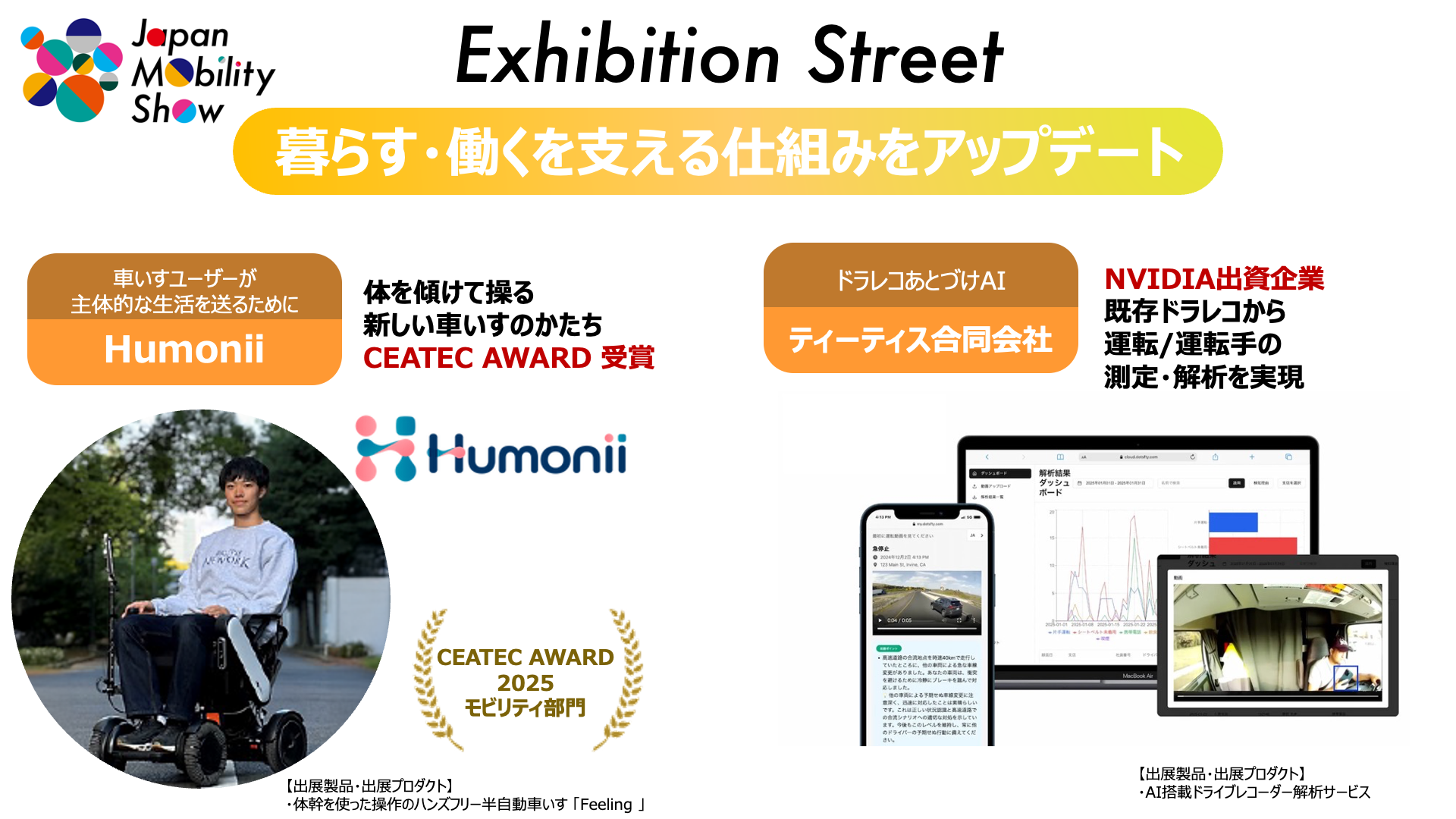 つづいてのカテゴリーでは、「Humonii」は、体を傾け、直感的に操作可能な車いす 「Feeling」 を展示します。こちらは、「CEATEC AWARD 2025 モビリティ部門」を受賞された、注目のプロジェクトです。また、simカードを挿入するだけで、運転の測定をAIが解析するサービスを提供する「ティーティス合同会社」。
