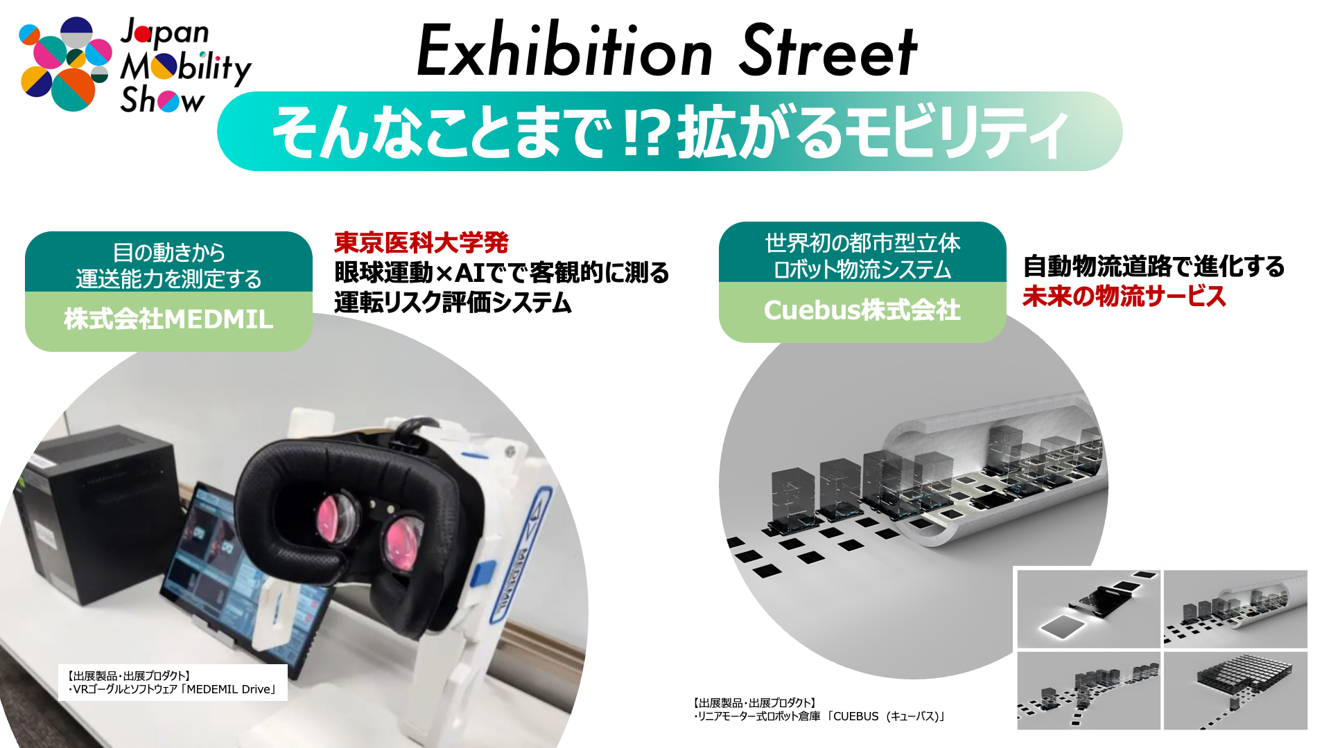 最後のカテゴリーでは、眼球運動とAIを組み合わせ、運転リスクを科学的に測定する「株式会社 MEDMIL」。世界初の都市型立体ロボット物流システムを提供する「Cuebus株式会社」 等々、一部のみのご紹介になりますが、最先端のモビリティ技術から、モビリティの枠を超えた挑戦が感じられる「Exhibition Street」 へぜひお立ち寄りください。
