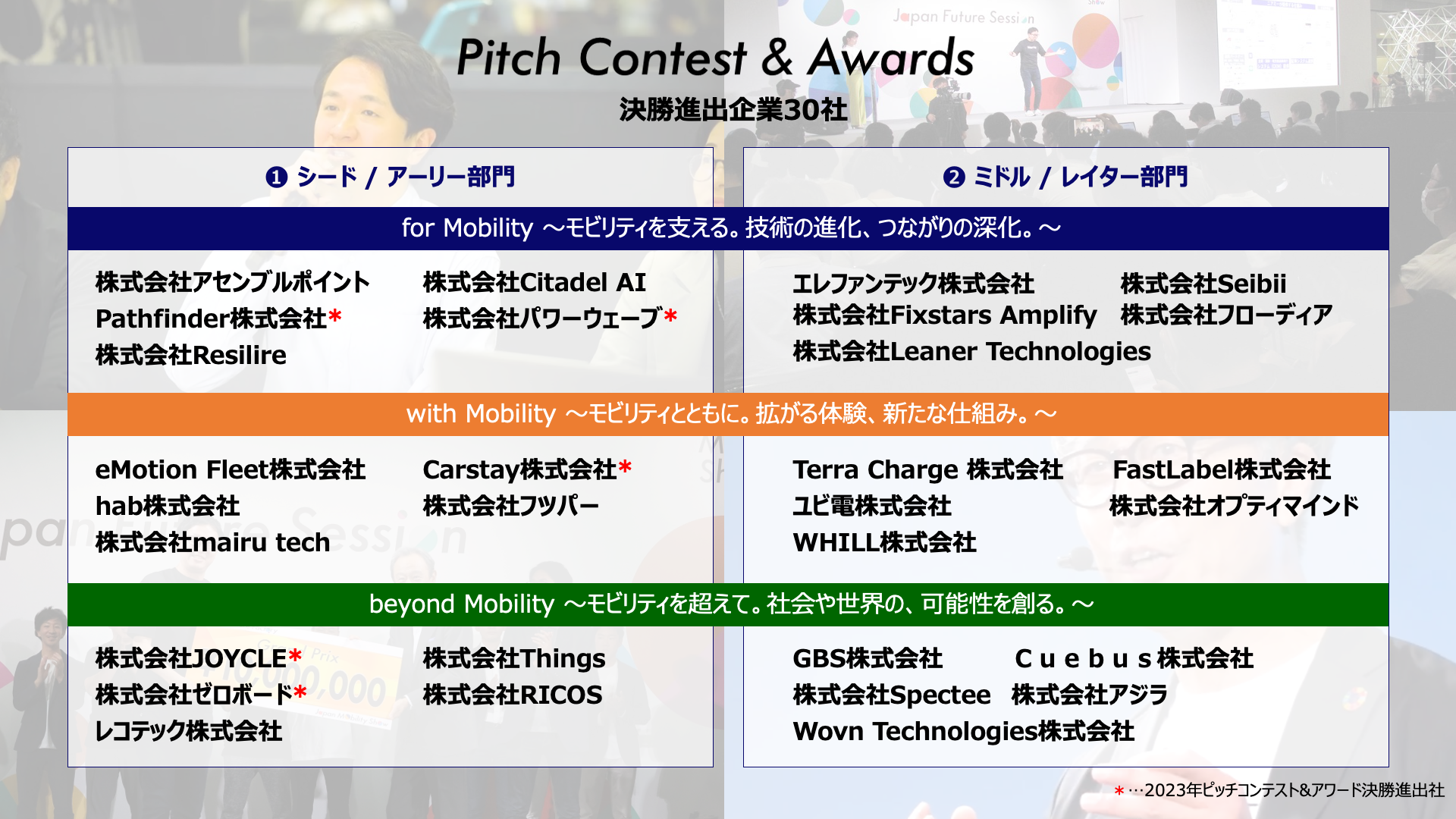 続いては、「ピッチコンテスト」です。未来を担うスタートアップ企業30社がシード/アーリー部門、ミドル/レイター部門の2部門で決勝ピッチを行います。新たな挑戦と、さらなる飛躍にご注目ください。