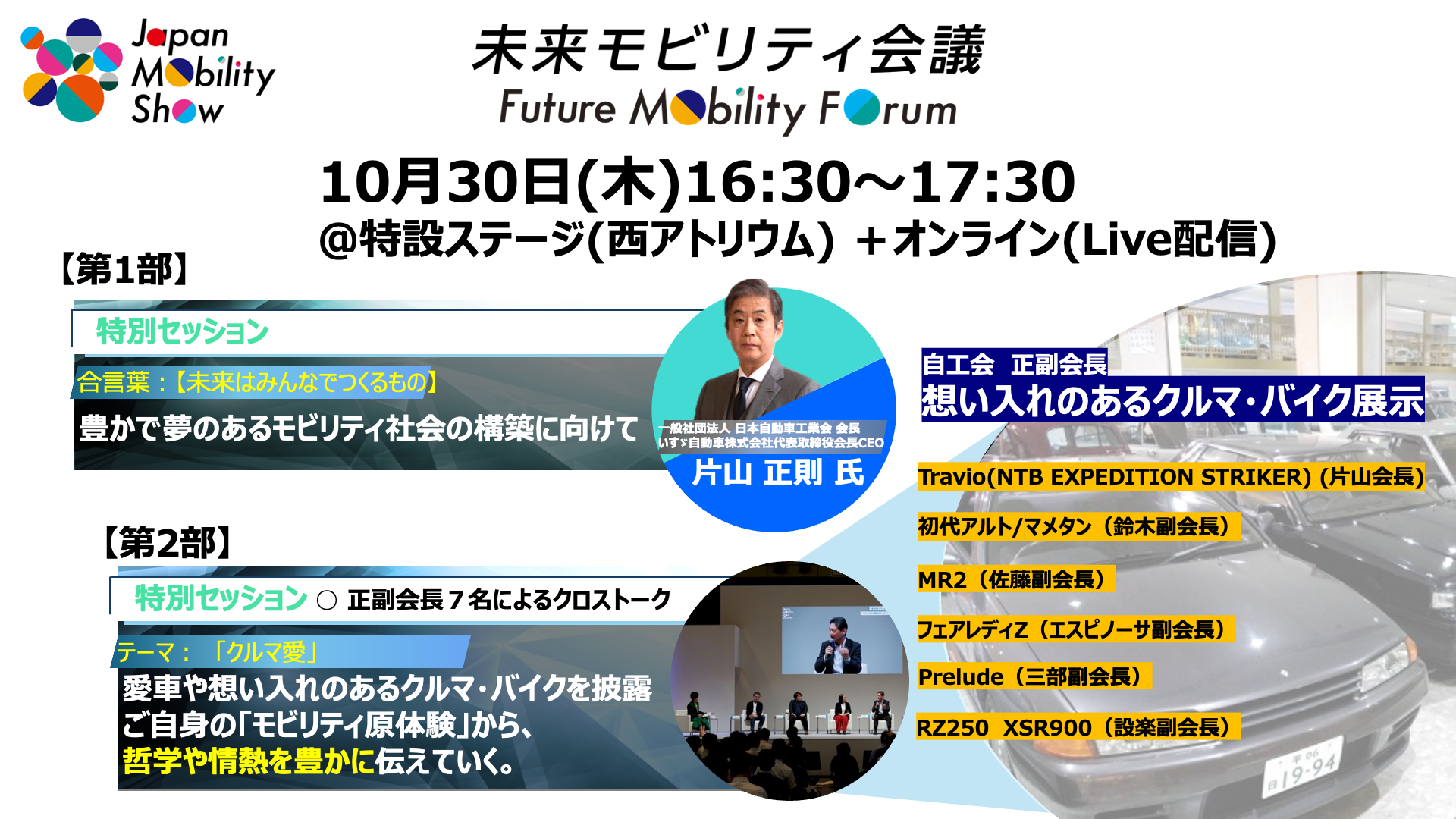 今回、「未来モビリティ会議」のスタートを切る 特別セッションは、10月30日16時30分より開催します。会場にお越しいただけない方もオンラインでご視聴が可能です。第1部では、自工会会長の片山が登壇し、ジャパンモビリティショーの意義やモビリティ社会の未来について、お話させていただきます。続く、第2部では、正副会長7名による“クルマ愛” をテーマにしたクロストークを開催。会場には、ご自身の愛車や、想い入れのあるクルマやバイクを展示し、それぞれの哲学と情熱を語りあっていただきます。メーカーの垣根を超え、各社トップの素の一面を垣間見れる、貴重なクロストークは必見です。