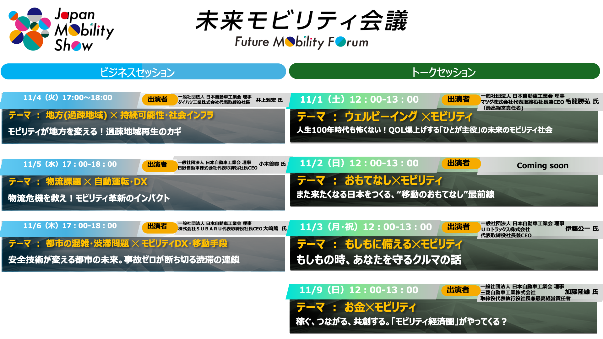 そして、自工会理事が登壇し、「モビリティの未来」 に関する、様々なビジネス視点のセッションや、身近な話題をテーマにした、フランクなセッションが行われます。この他にも、日替わりで、様々な企業・団体様のトークステージを予定しています。詳細は、本日のリリースおよび公式WEBサイトでご確認をお願いいたします。