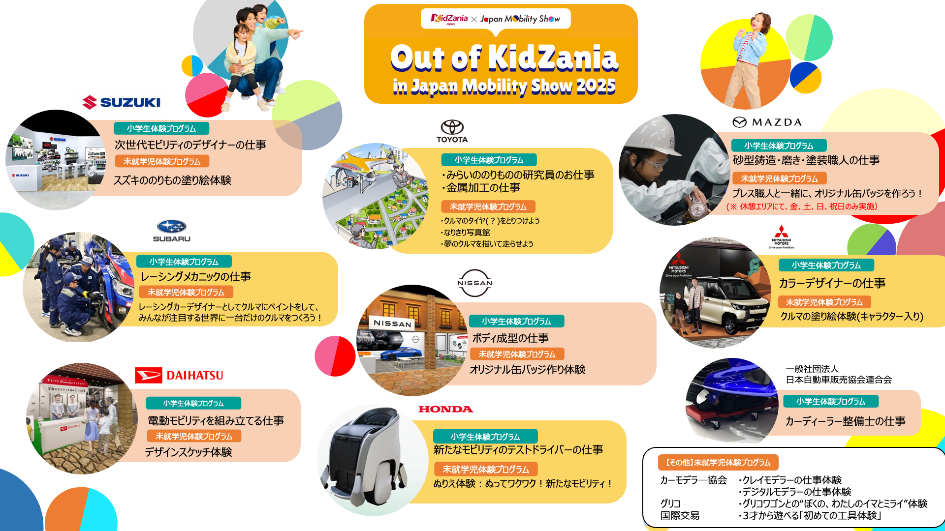 お子さま向けには、毎回ご好評の「Out of KidZania in Japan Mobility Show」での、モビリティに関わる職業体験をオススメしております。未就学のお子さまから小学生まで、幅広い職業体験をご用意しております。実際に手を動かし、考え、創り出し、楽しく学ぶ体験は、きっと未来を考えるきっかけになることと思います。なお、モビショー公式アプリでの事前予約が必要となりますので、お早めにご予約ください。