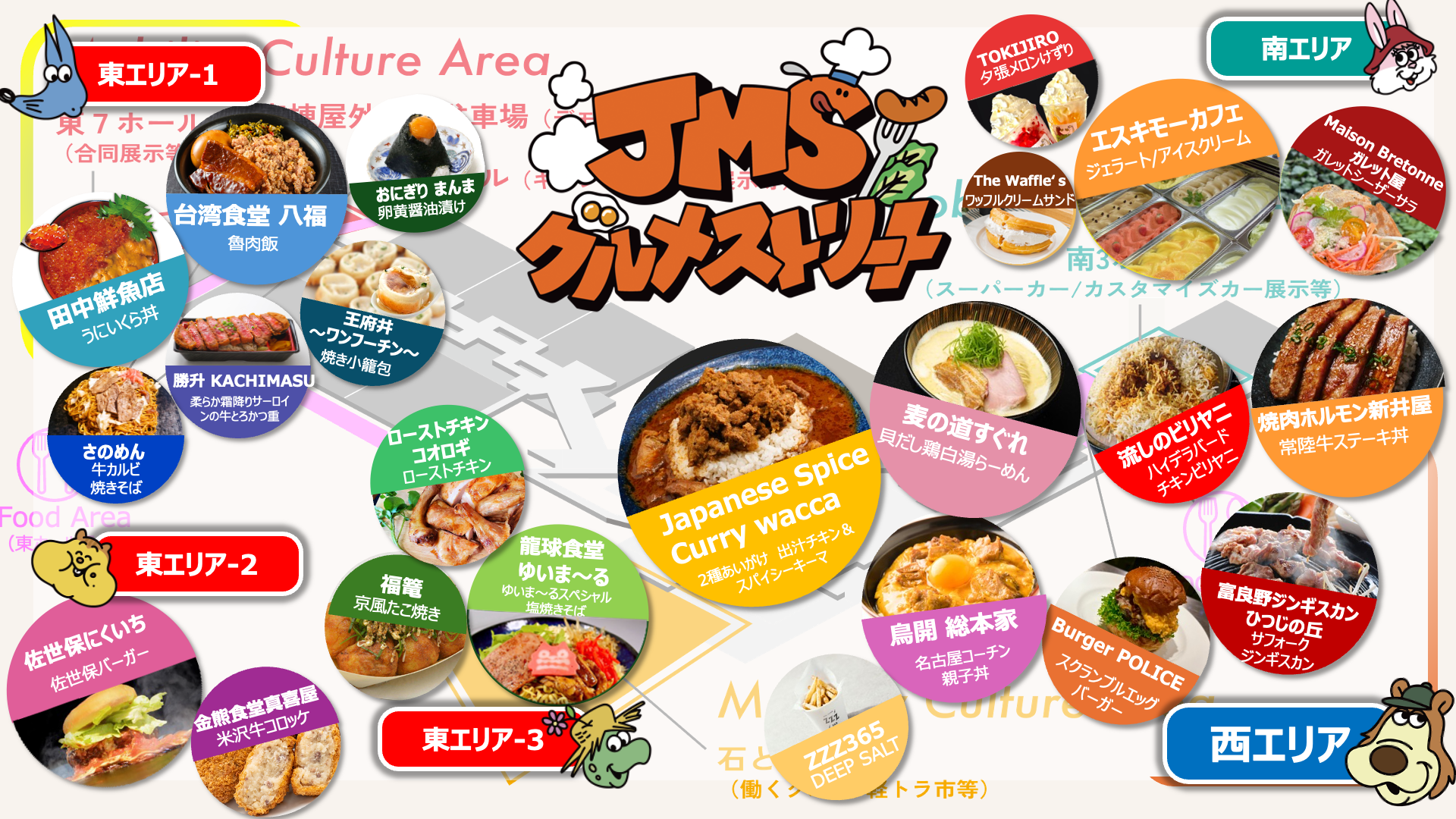 お食事も豊富に揃えてございます。40店舗以上が会場の至る所に軒を連ねる「JMSグルメストリート」では、世界各国の味や、ボリューム満点の料理、モビショーだけでしか味わえない、メニューなど盛りだくさんです。家族や友人とシェアしながら、食の旅を満喫できる、特別なストリートになっております。