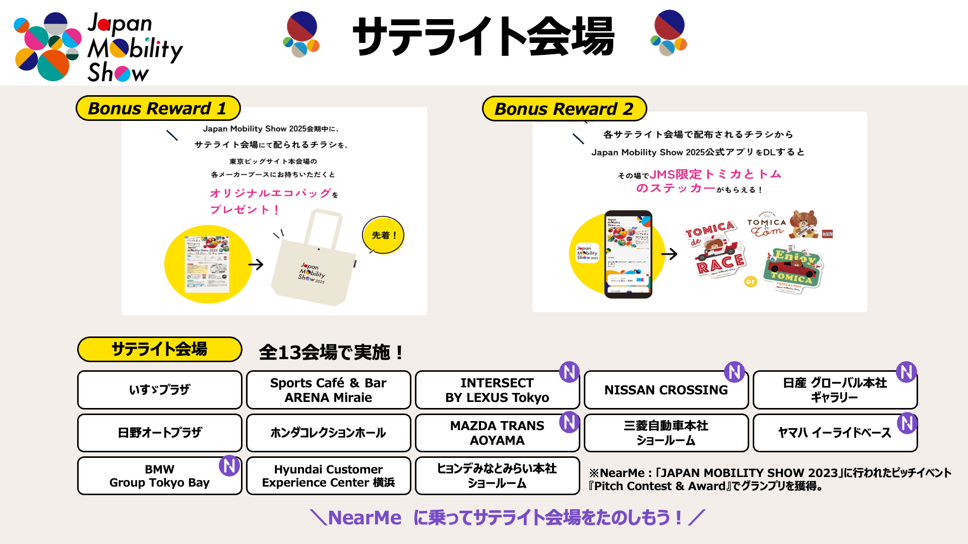 また、会場外でも、モビショーをお楽しみいただける機会もございます。今回は13施設が「サテライト会場」として実施予定です。「モビショーオリジナルエコバッグ」や「トミカとトムの限定ステッカー」がもらえるキャンペーンも実施しますので、是非お近くの会場へ足をお運びください。