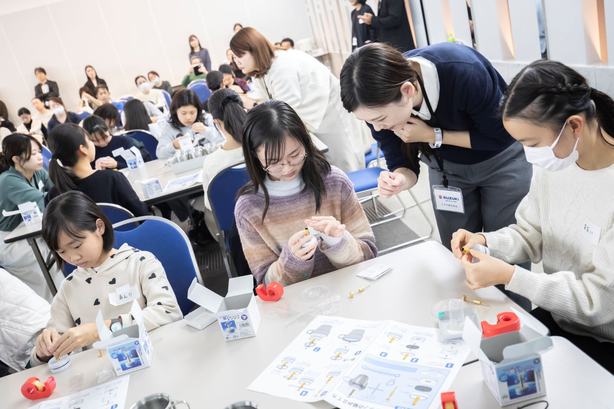 その後、メーカー各社のエンジニアと一緒に、科学の面白さを実際に体感できるワークショップ「中学生×エンジニア ワークショップ(実験工作体験)」を6グループに分けて実施。講師が「クルマは何で動きますか?」と質問すると、学生からは「ガソリン」「電気」「水素」と即答が相次いでいました。