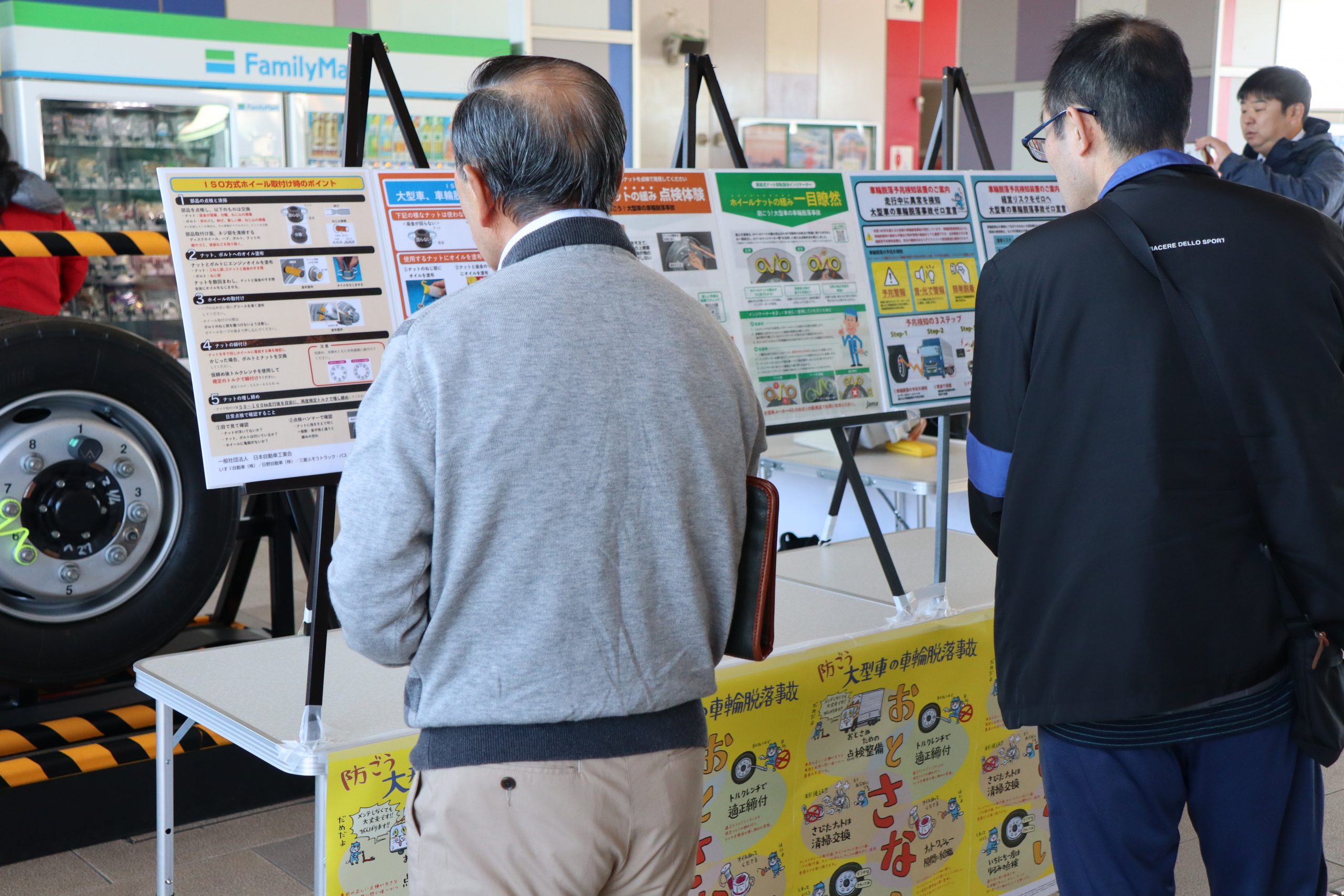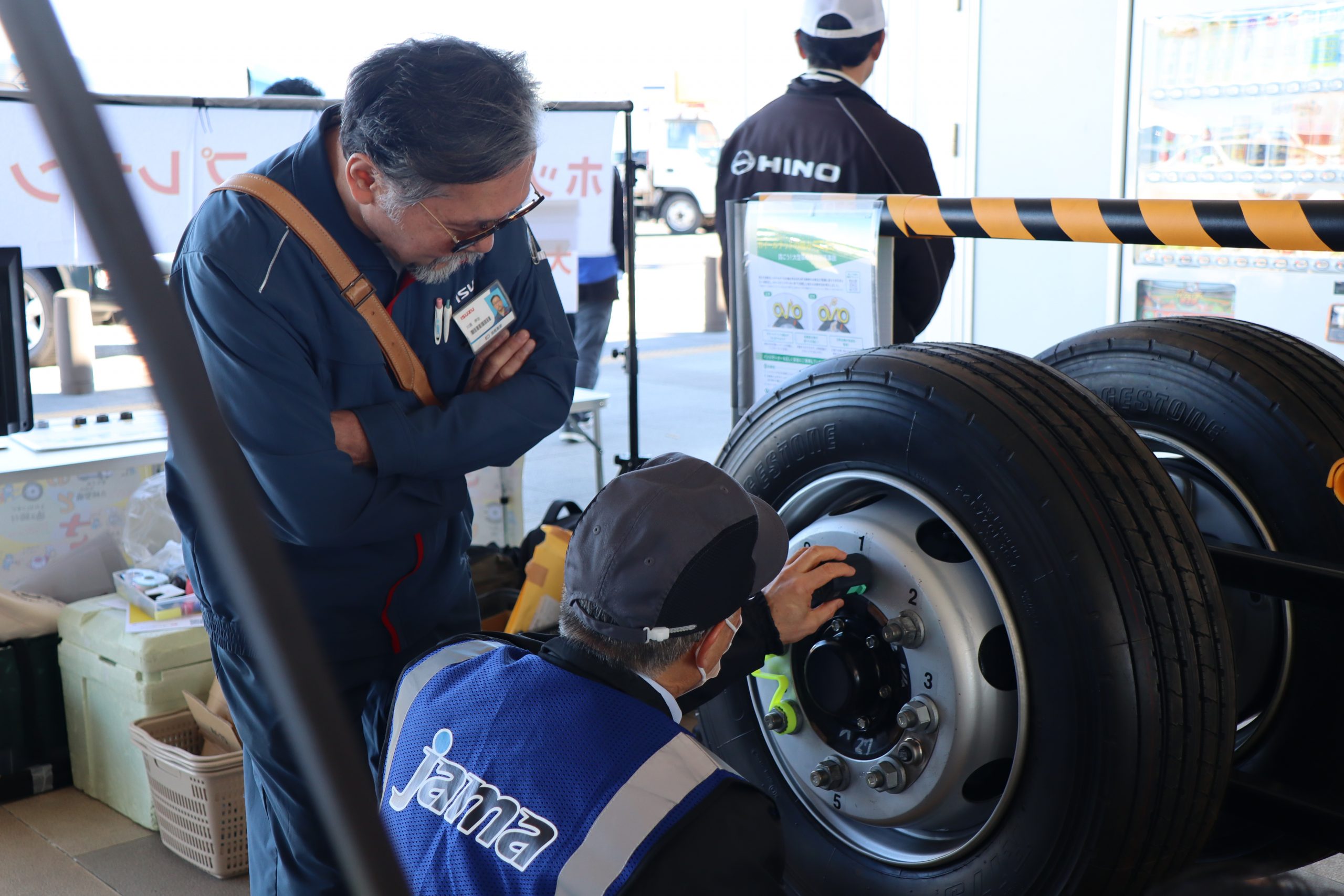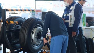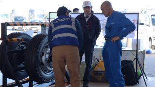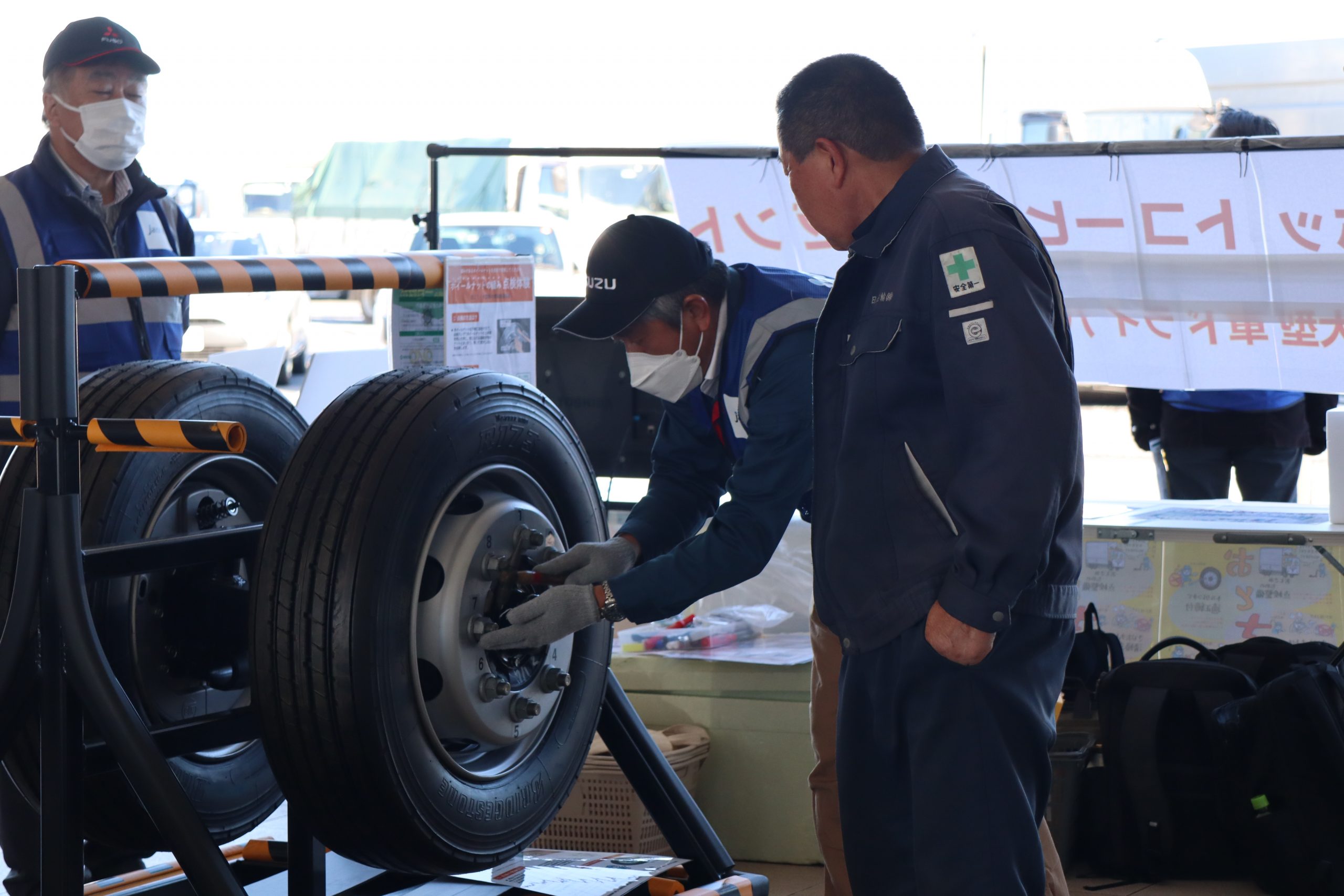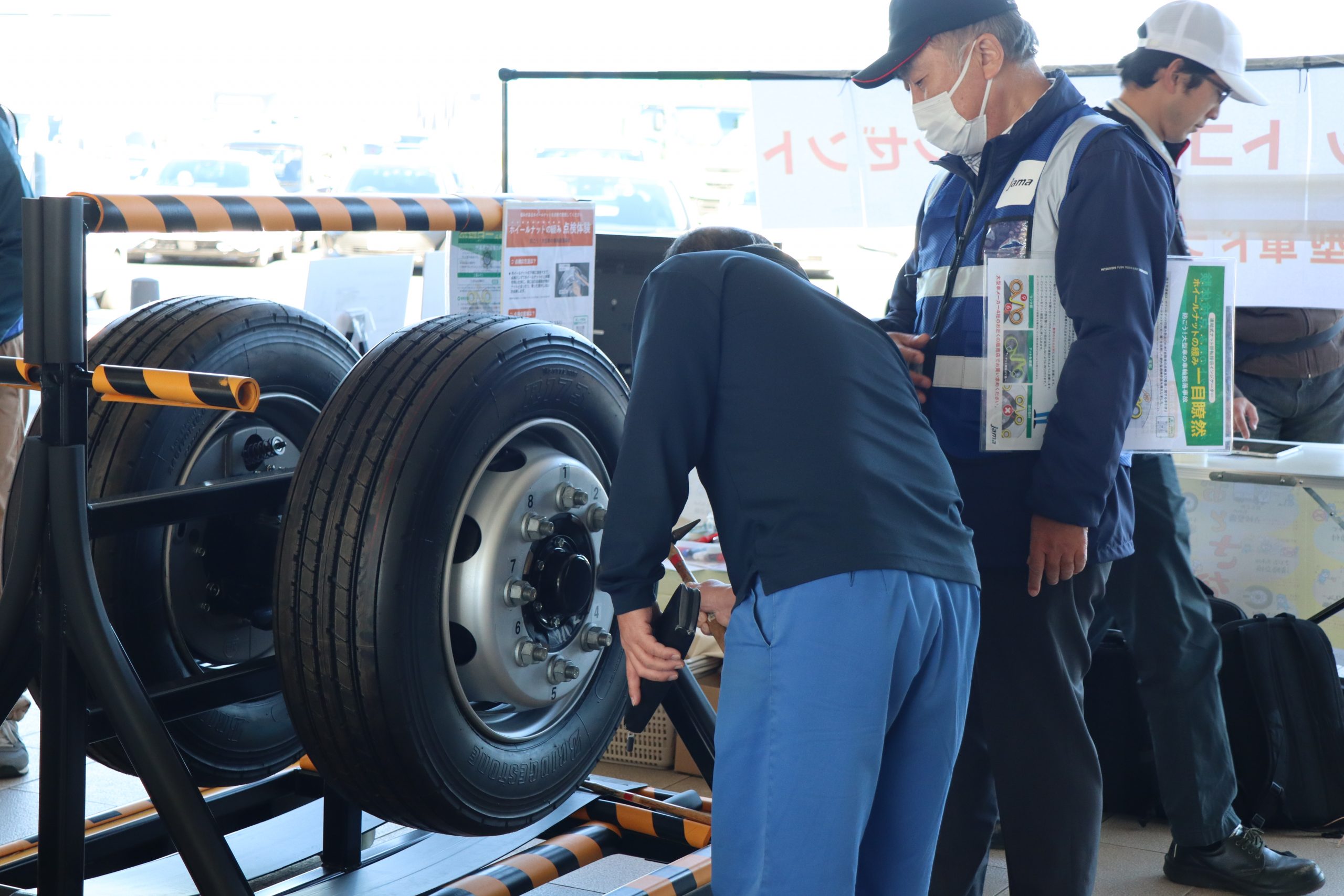 多くの参加者のみなさんにアンケートにご協力いただいた他、ハンマーを使用したボルトナットの緩み点検体験や、インジケーターの展示を行いました。また、今年の啓発活動では、(株)東海理化協力のもと車輪脱落予兆検知システムをご紹介。このシステムは車輪に取り付けられた装置がナットの緩みを検知すると、運転席の受信機に電波を送信し、ドライバーに危険を伝える装置で、日常点検に加え、最新技術による防止策の紹介に、参加した大型車ドライバーも関心を持って耳を傾けていました。