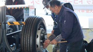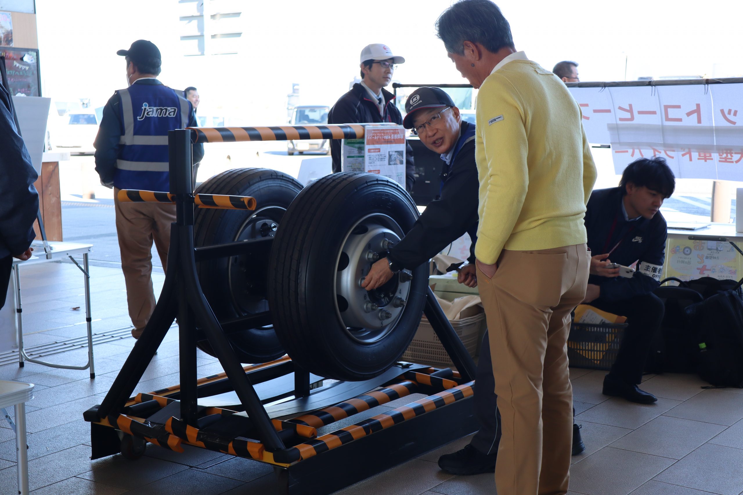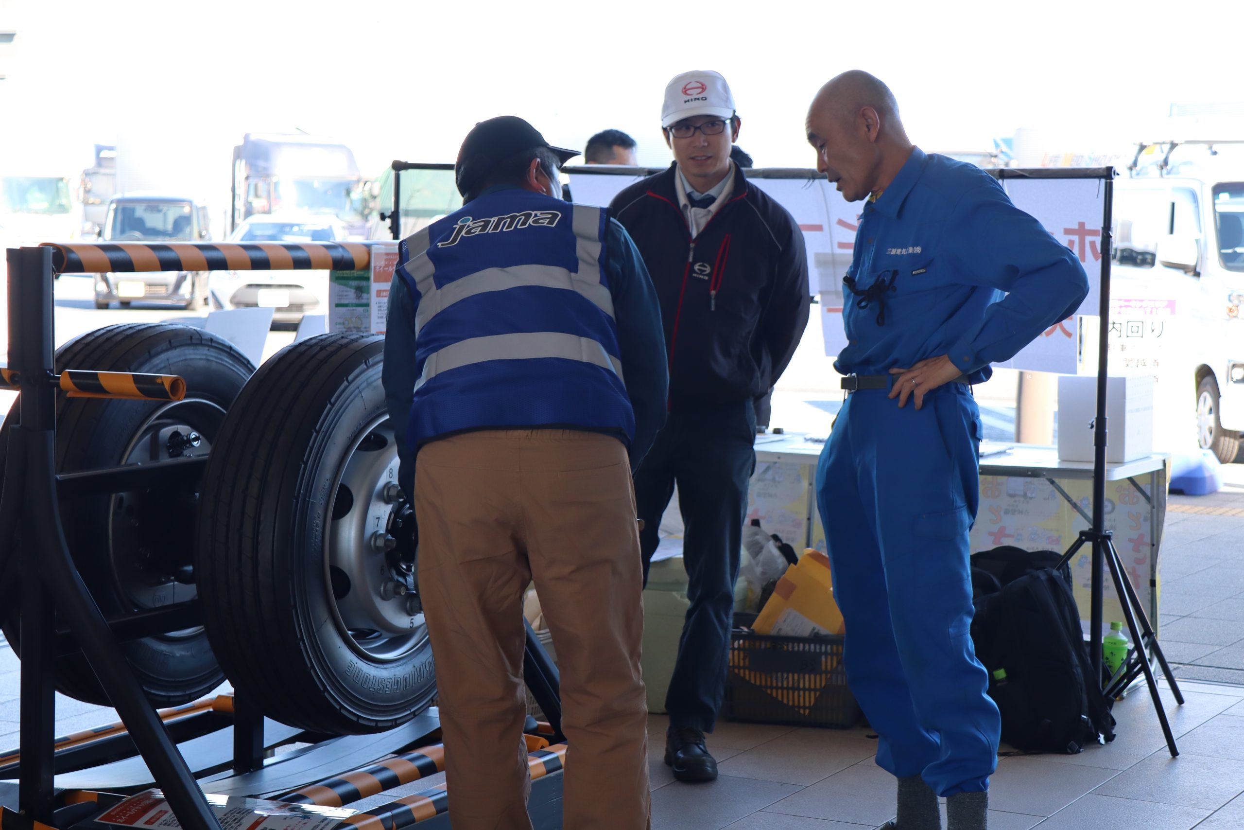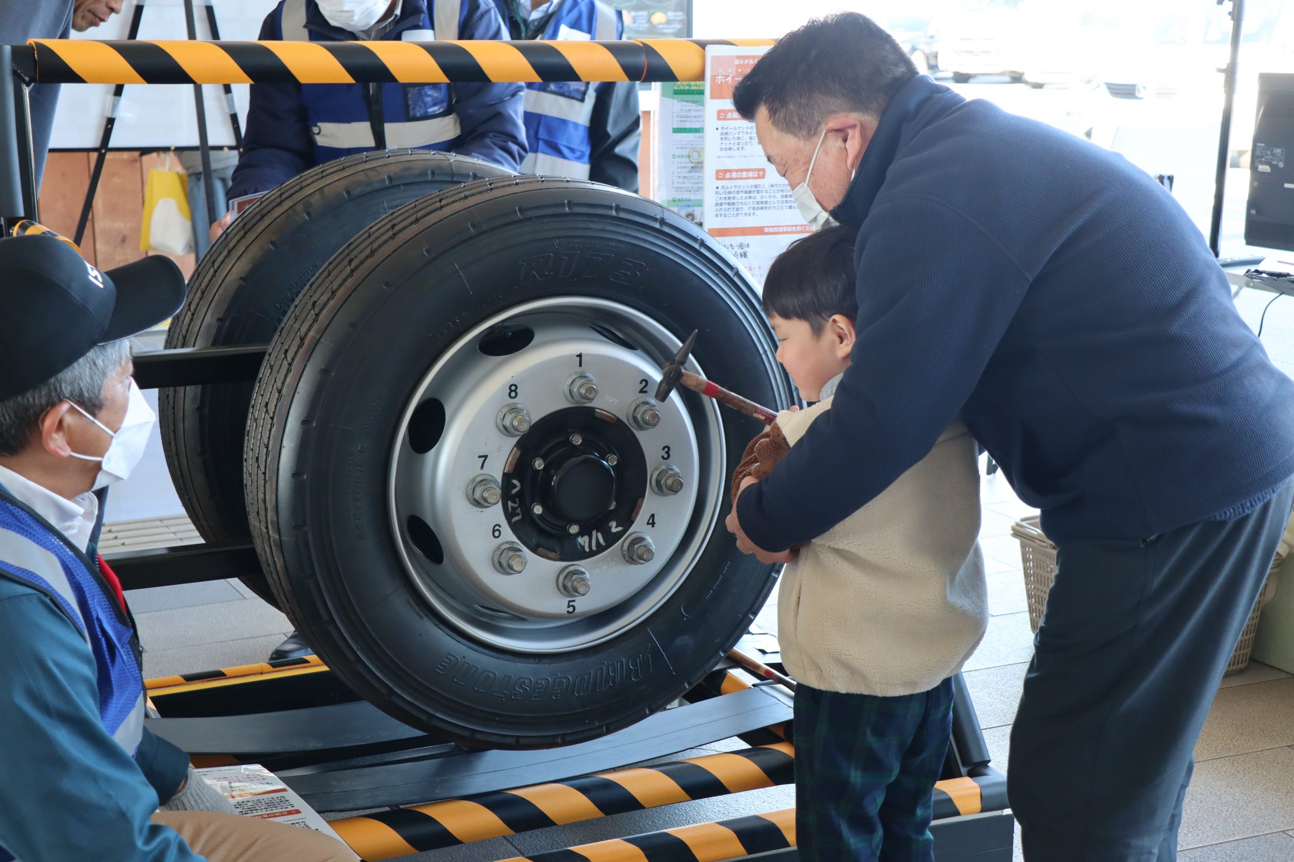 多くの参加者のみなさんにアンケートにご協力いただいた他、ハンマーを使用したボルトナットの緩み点検体験や、インジケーターの展示を行いました。また、今年の啓発活動では、(株)東海理化協力のもと車輪脱落予兆検知システムをご紹介。このシステムは車輪に取り付けられた装置がナットの緩みを検知すると、運転席の受信機に電波を送信し、ドライバーに危険を伝える装置で、日常点検に加え、最新技術による防止策の紹介に、参加した大型車ドライバーも関心を持って耳を傾けていました。