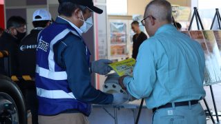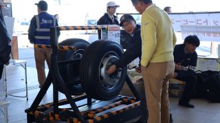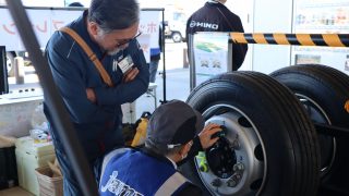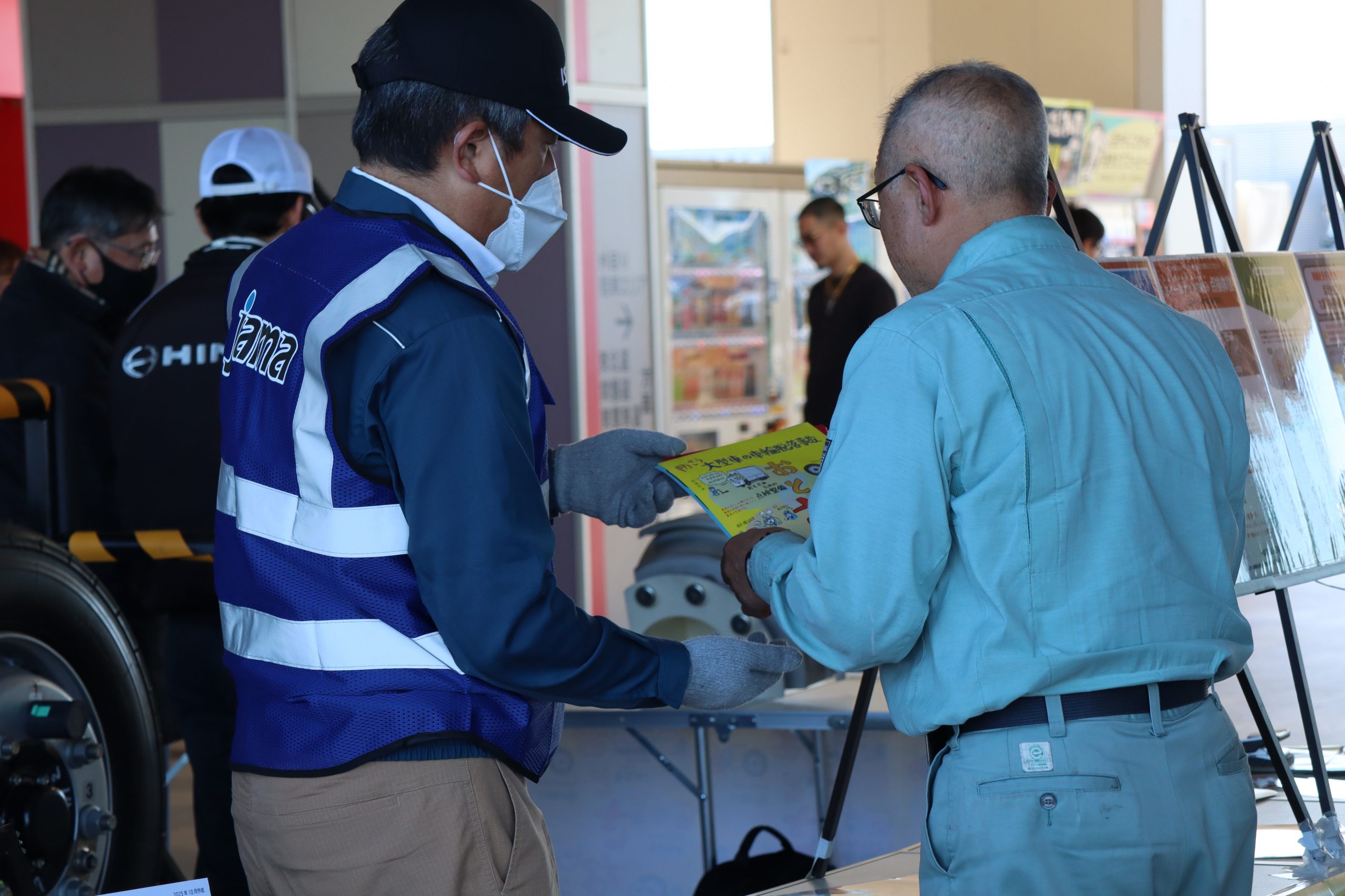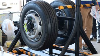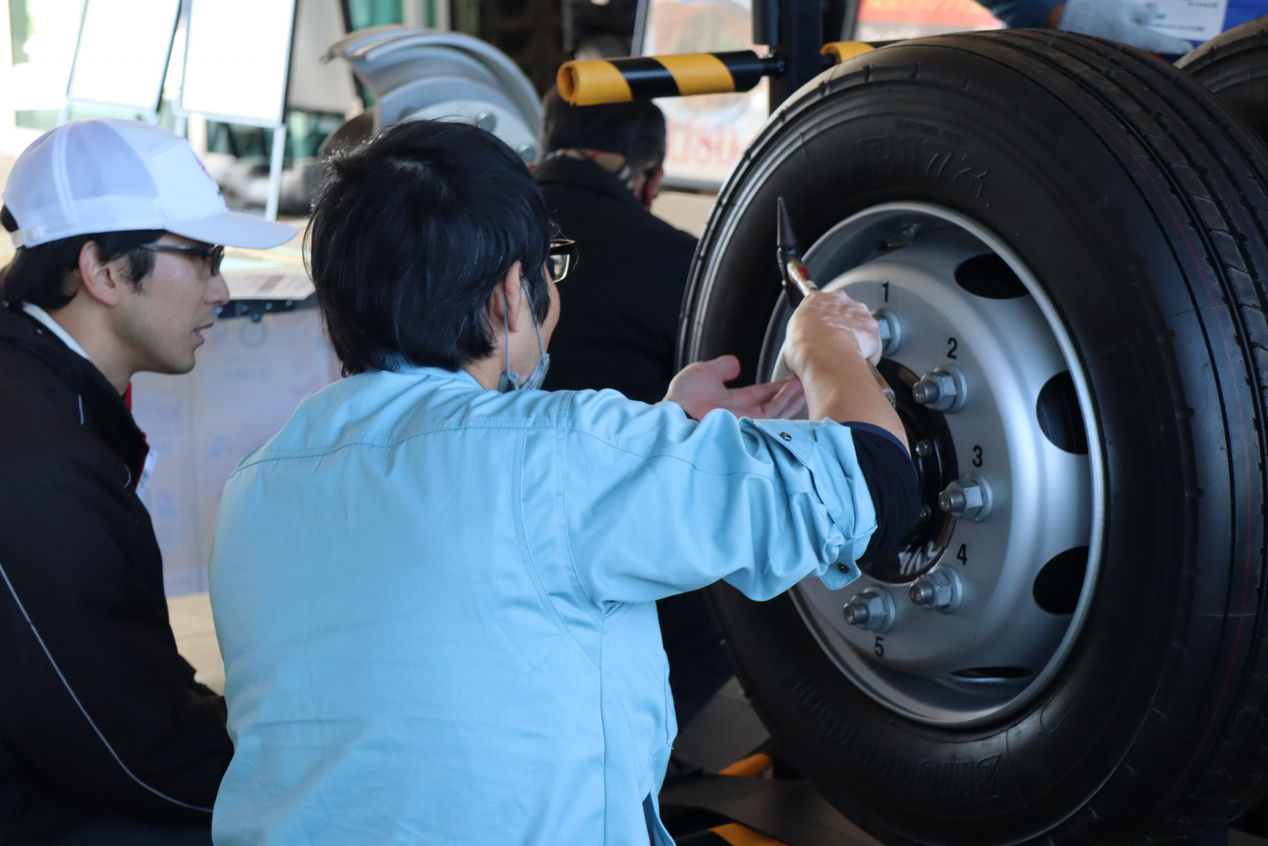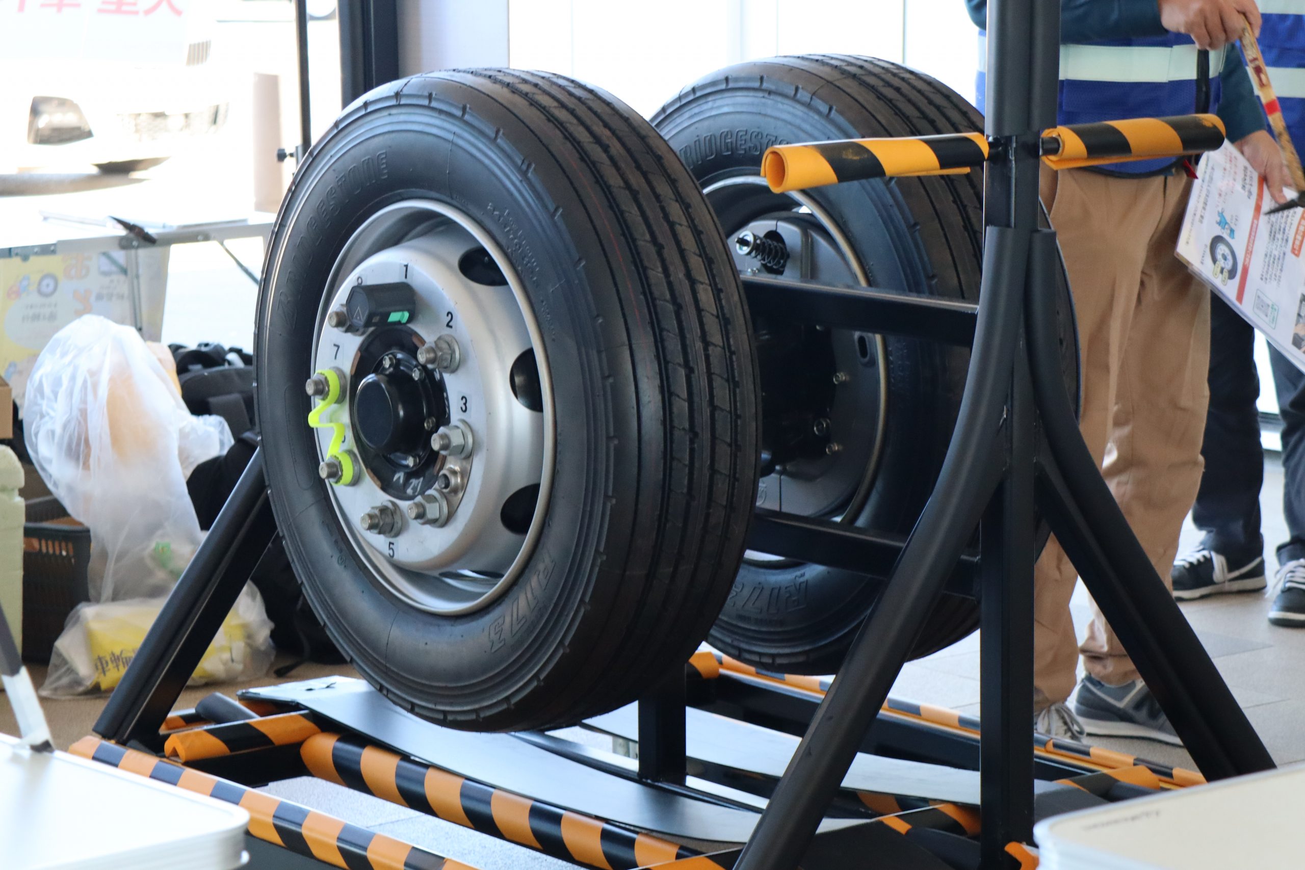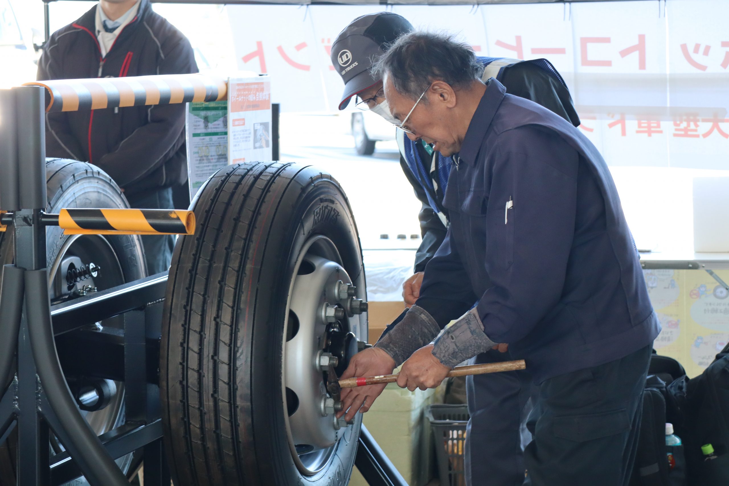 多くの参加者のみなさんにアンケートにご協力いただいた他、ハンマーを使用したボルトナットの緩み点検体験や、インジケーターの展示を行いました。また、今年の啓発活動では、(株)東海理化協力のもと車輪脱落予兆検知システムをご紹介。このシステムは車輪に取り付けられた装置がナットの緩みを検知すると、運転席の受信機に電波を送信し、ドライバーに危険を伝える装置で、日常点検に加え、最新技術による防止策の紹介に、参加した大型車ドライバーも関心を持って耳を傾けていました。