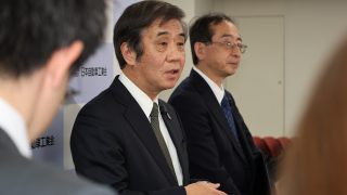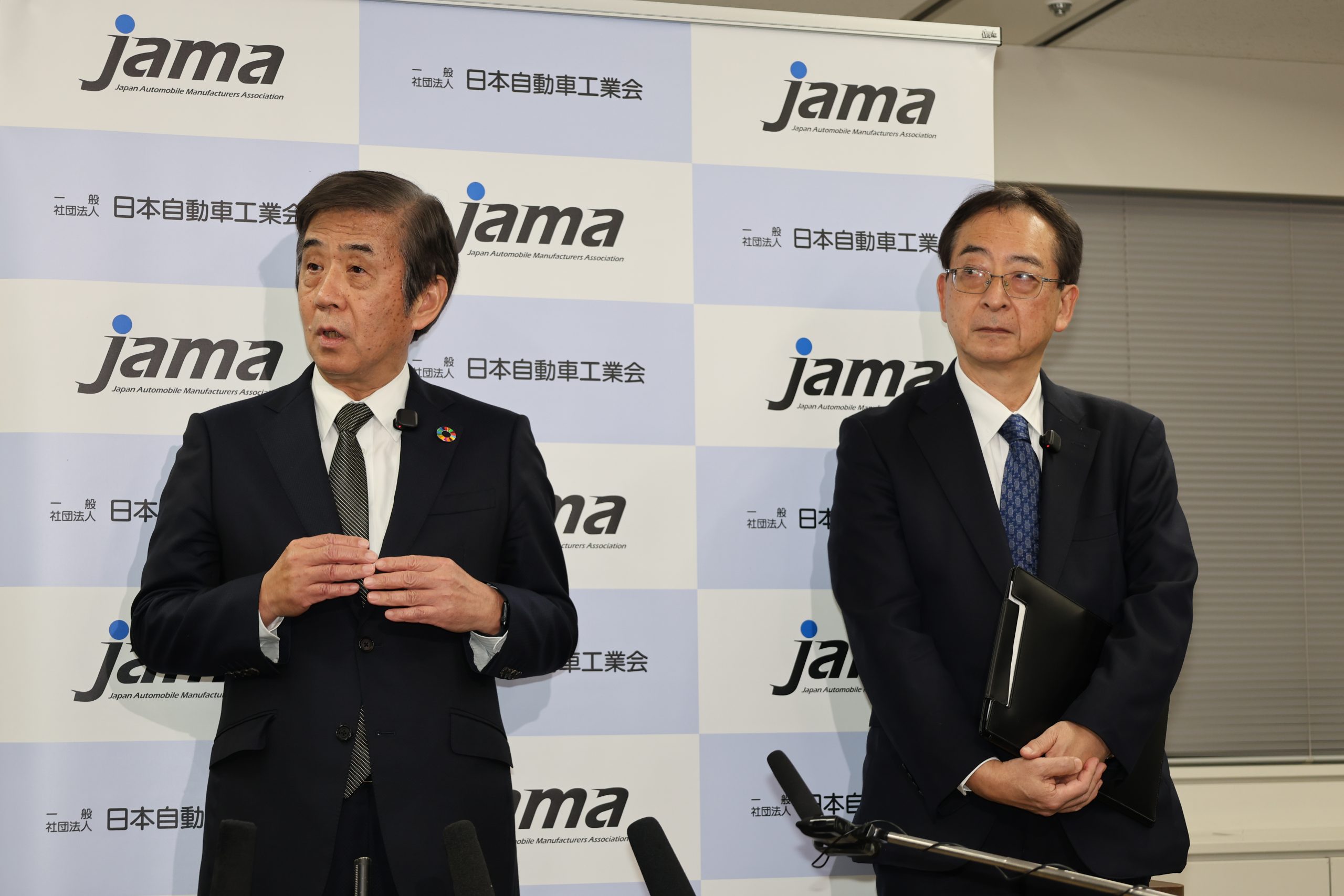 - (左から)会長 片山正則(いすゞ自動車株式会社代表取締役会長 CEO)と副会長 松永明(自工会 専務理事)