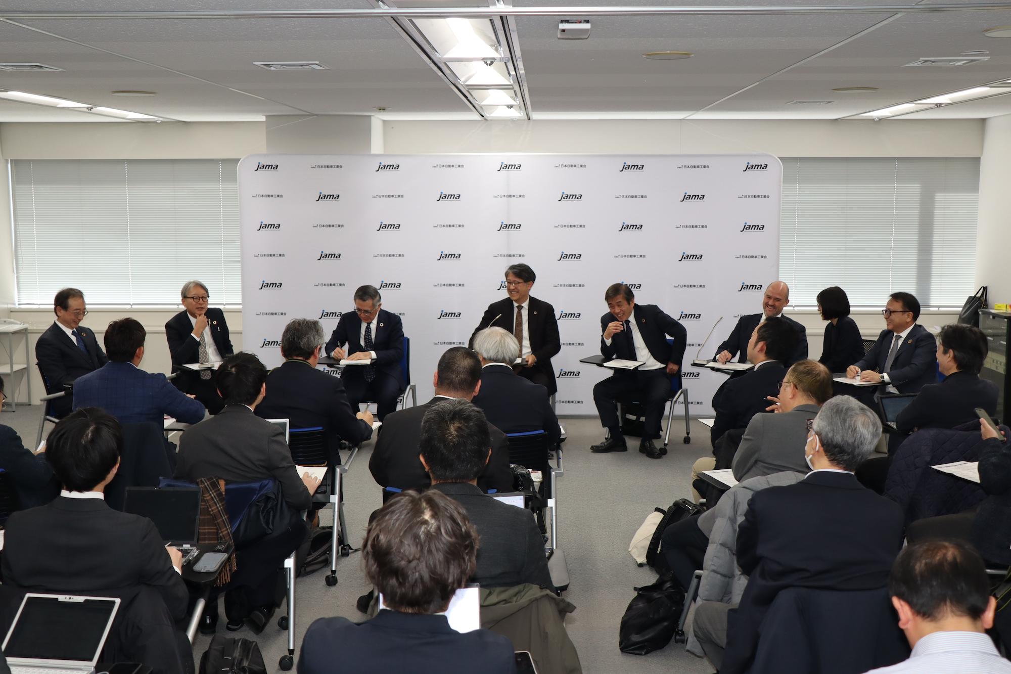 1/22、自工会は自動車産業担当の報道陣を対象に「新7つの課題」をはじめとした今年の方針を紹介する説明会を開催しました。本イベントでは、まず会長の佐藤から新体制初の理事ミーティングの議論について説明があったほか、国内外のモビリティ業界を取り巻く課題について、幅広く意見交換が行われました。