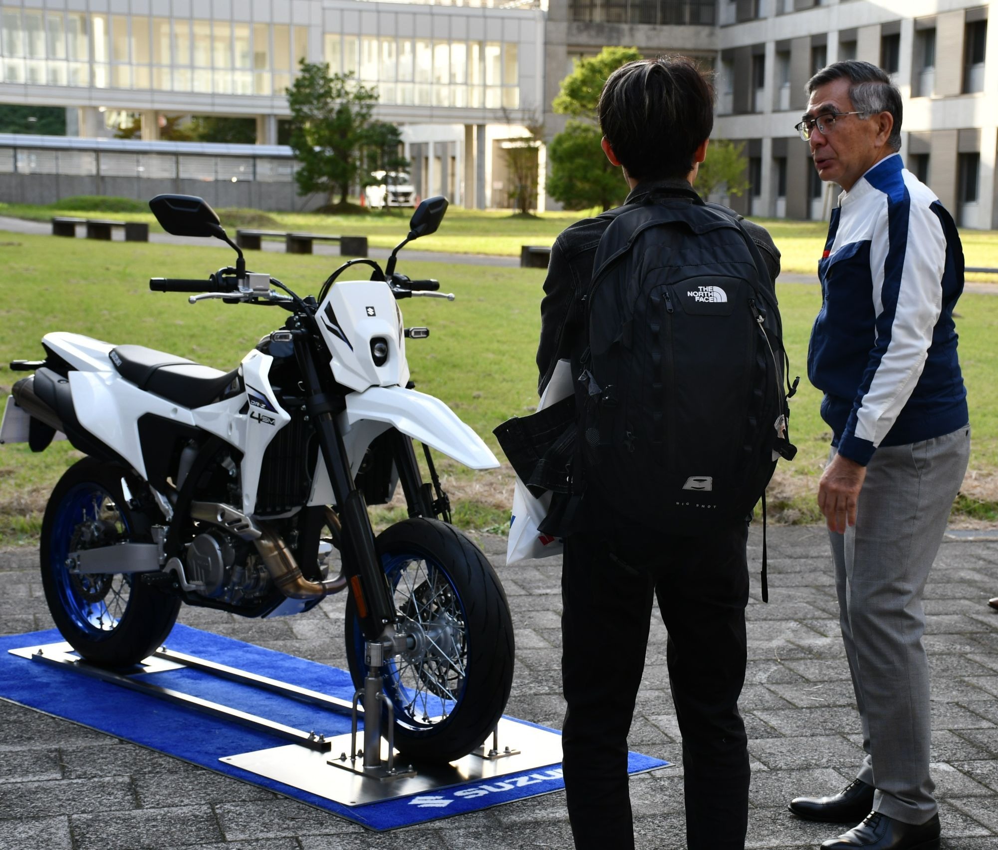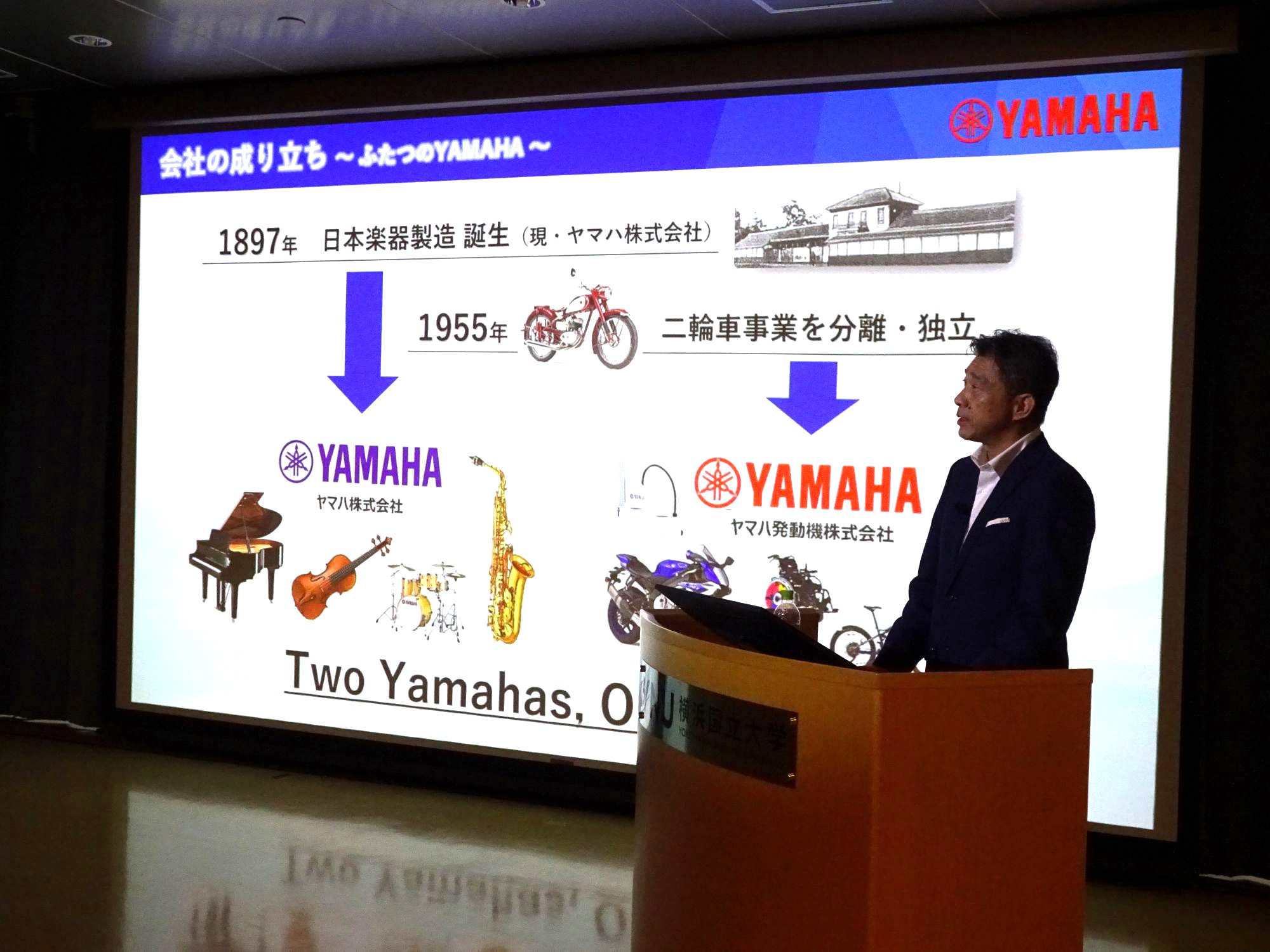 冒頭、楽器メーカーのヤマハと起源は同じ、現在はそれぞれ独立している経緯を学生に分かりやすく説明。ヤマハ発動機は2025年で創立70周年を迎え、「今ではオートバイだけでなく、ボート船外機や電動アシスト自転車、電動車いすなどさまざまな事業を展開している」と話しました。