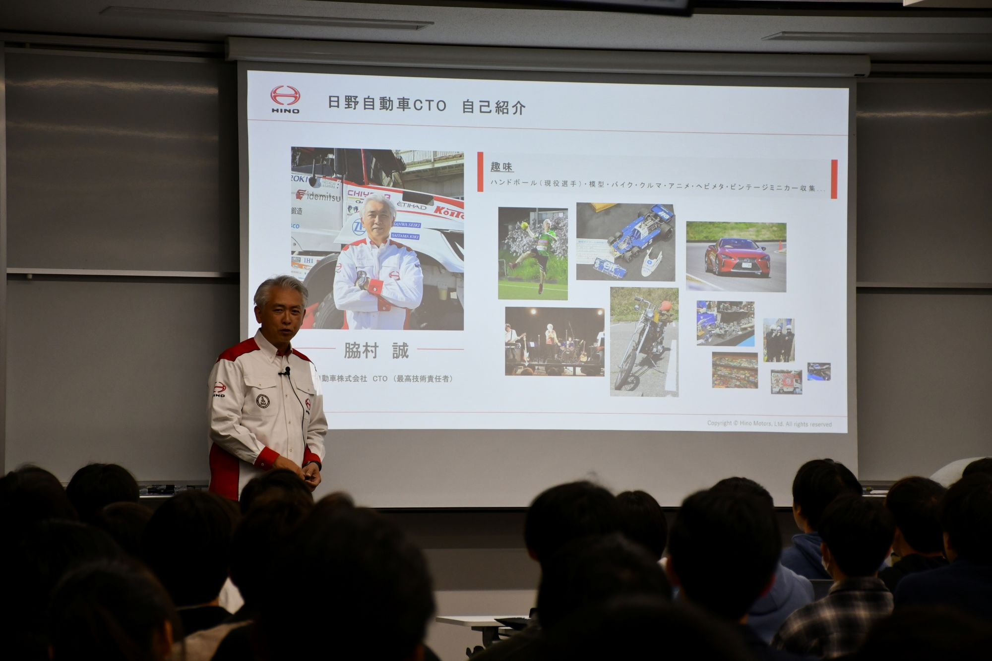 日野自動車の脇村誠氏(最高技術責任者=CTO、当時)は10月22日、東京都立大学日野キャンパス(東京都日野市)で講演しました。テーマは「大型トラック、誕生の舞台裏。CTOが語る挑戦と技術」でプロフィアを一例に、大型トラック開発の流れや裏話を披露し、学生に商用車開発の魅力などを発信。また、商用車は、乗用車に比べてモデルサイクルが長いことから開発の責任の重大さを指摘しました。