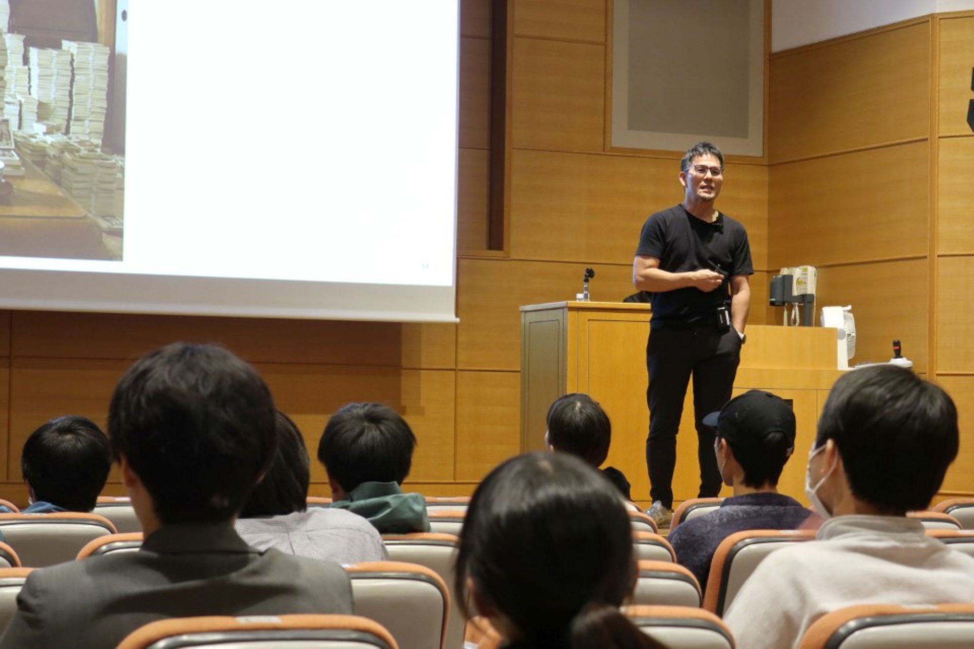 自身の大学時代も振り返り、「仲の良い友人が8人いた。この8人で授業を受けたり、課題に取り組んだりしたのはいい思い出。数年前に集まったが、当時と変わらない雰囲気だった。学生時代の仲間は本当に一生の友だ。ぜひ良い友人をつくってください」と学生を激励しました。
