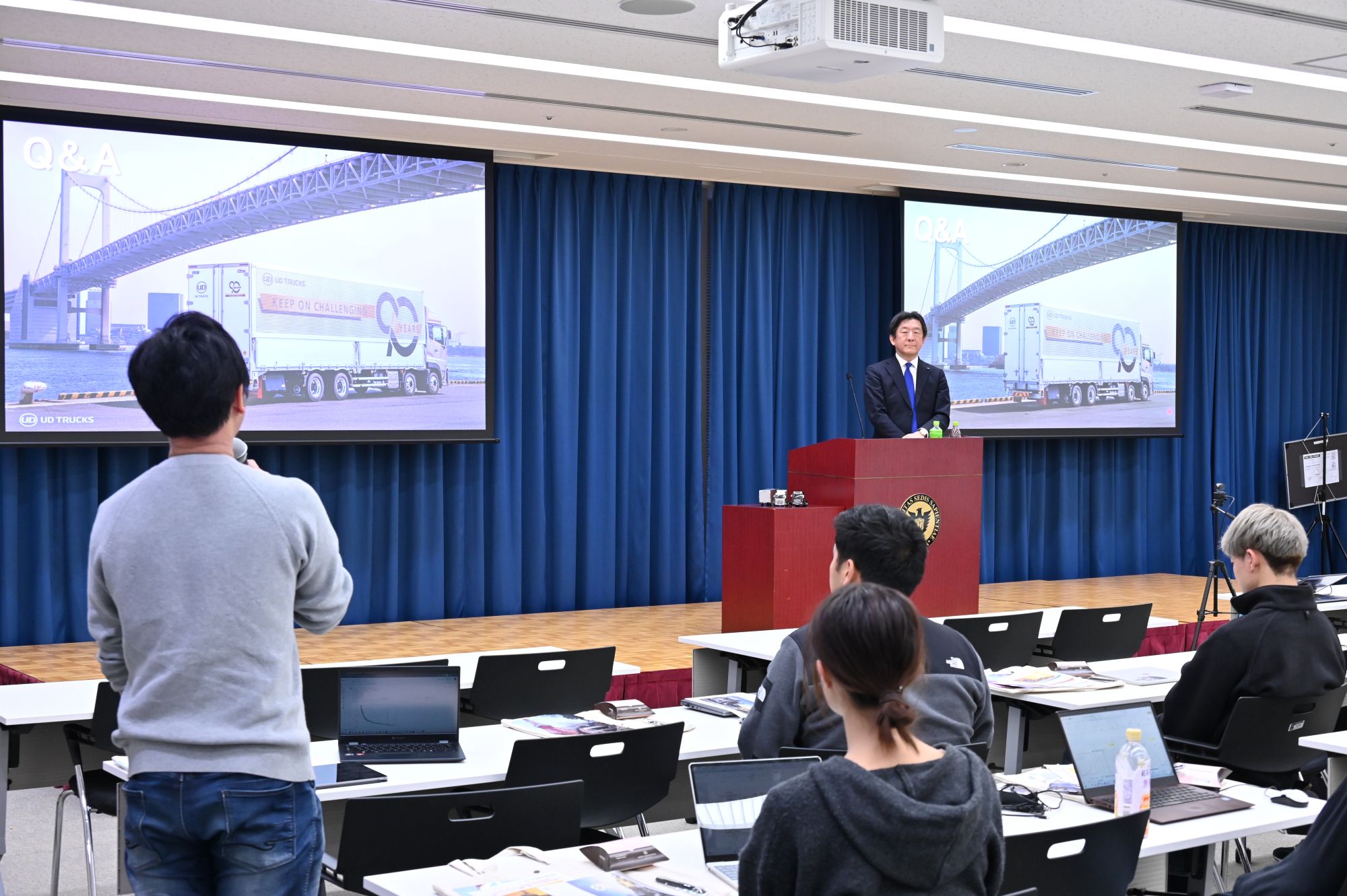 三菱ふそうトラック・バスの副社長兼開発本部長の安藤寛信氏は12月19日、明治大学生田キャンパス(川崎市多摩区)で「正解のない時代を生きる皆さんへ 商用車業界の開発現場から考える『働く』ことの意味」をテーマに講演。「社会人にとって一番重要な能力は」「人生における成功とは」などの設問にスマートフォンで参加者が投票する工夫も取り入れ、学生と議論も交わしていました。