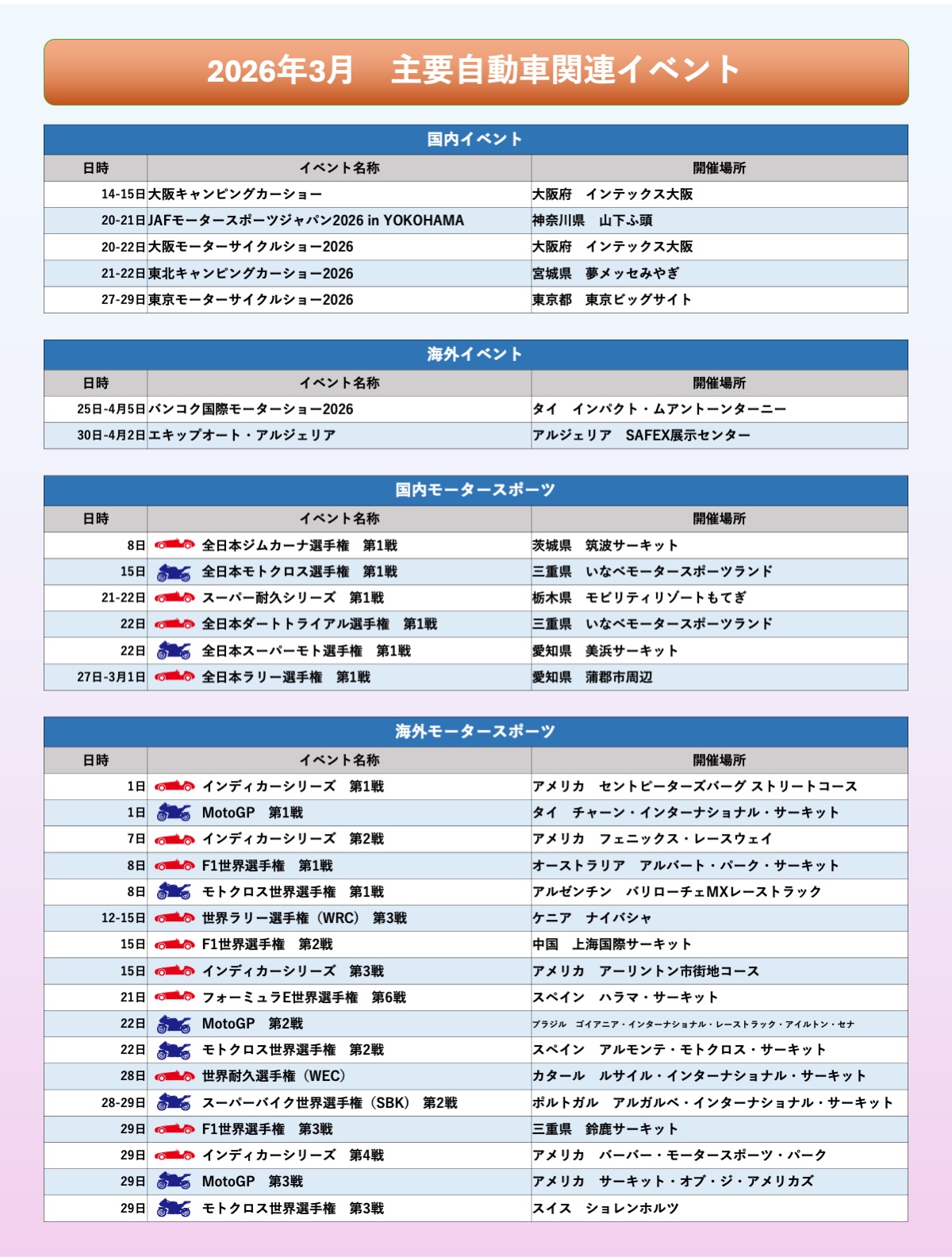 | 2026年3月 主要自動車関連イベント | ||