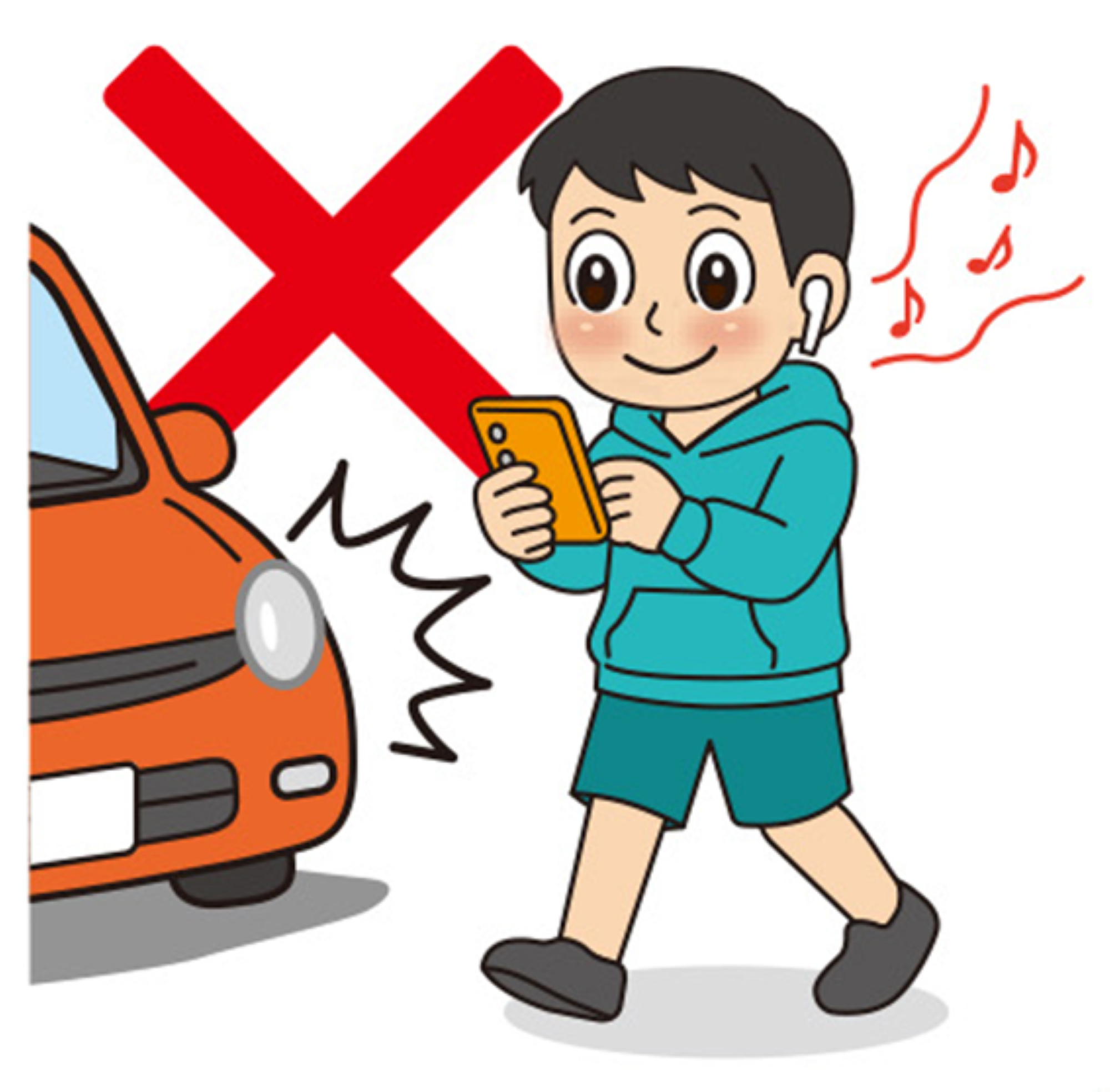 ・「歩きスマホ」やイヤホンで音楽を聞きながらの歩行は注意力が散漫になり、車の接近や周囲の状況に気付くのが遅れるので大変危険です。