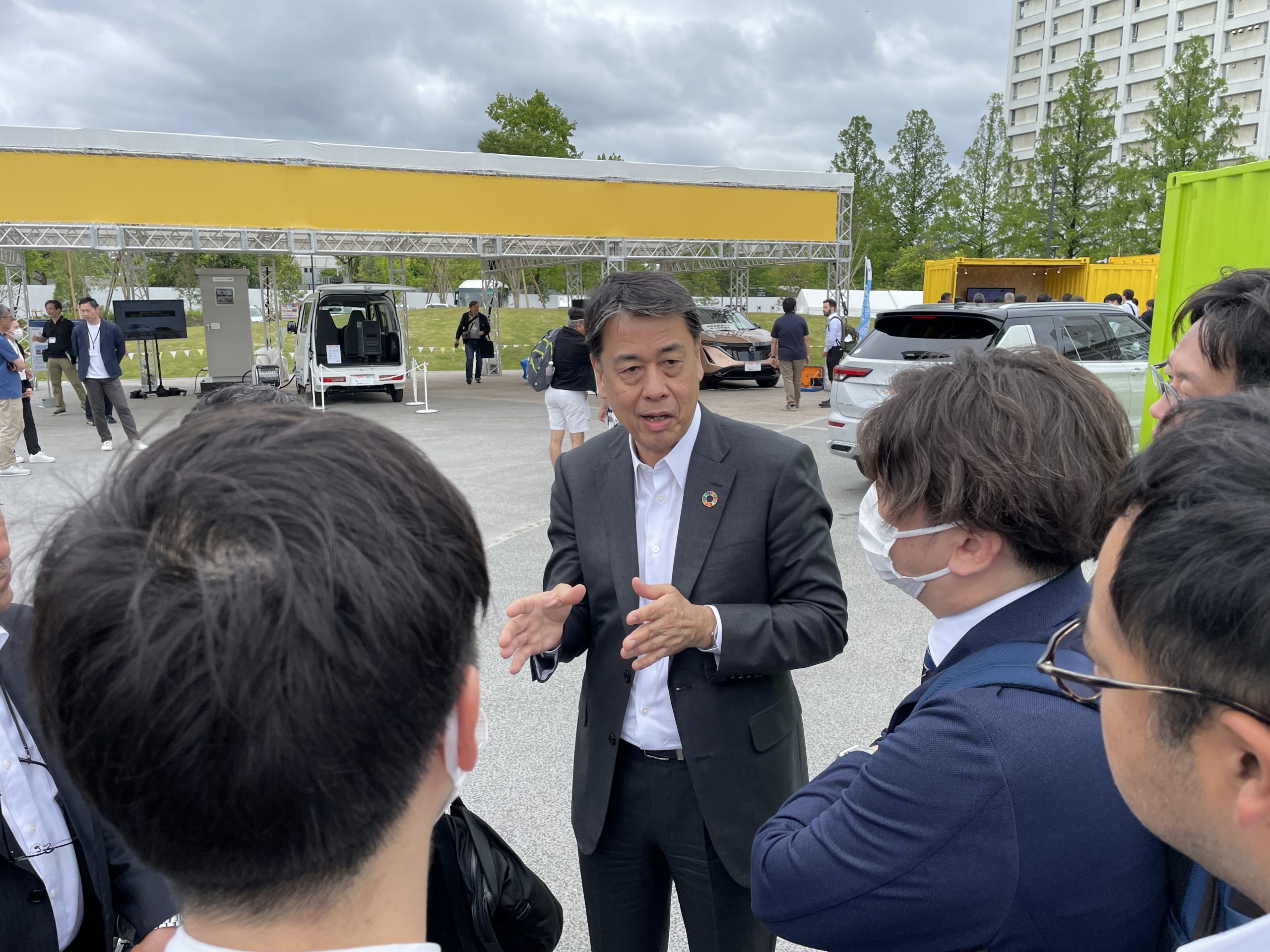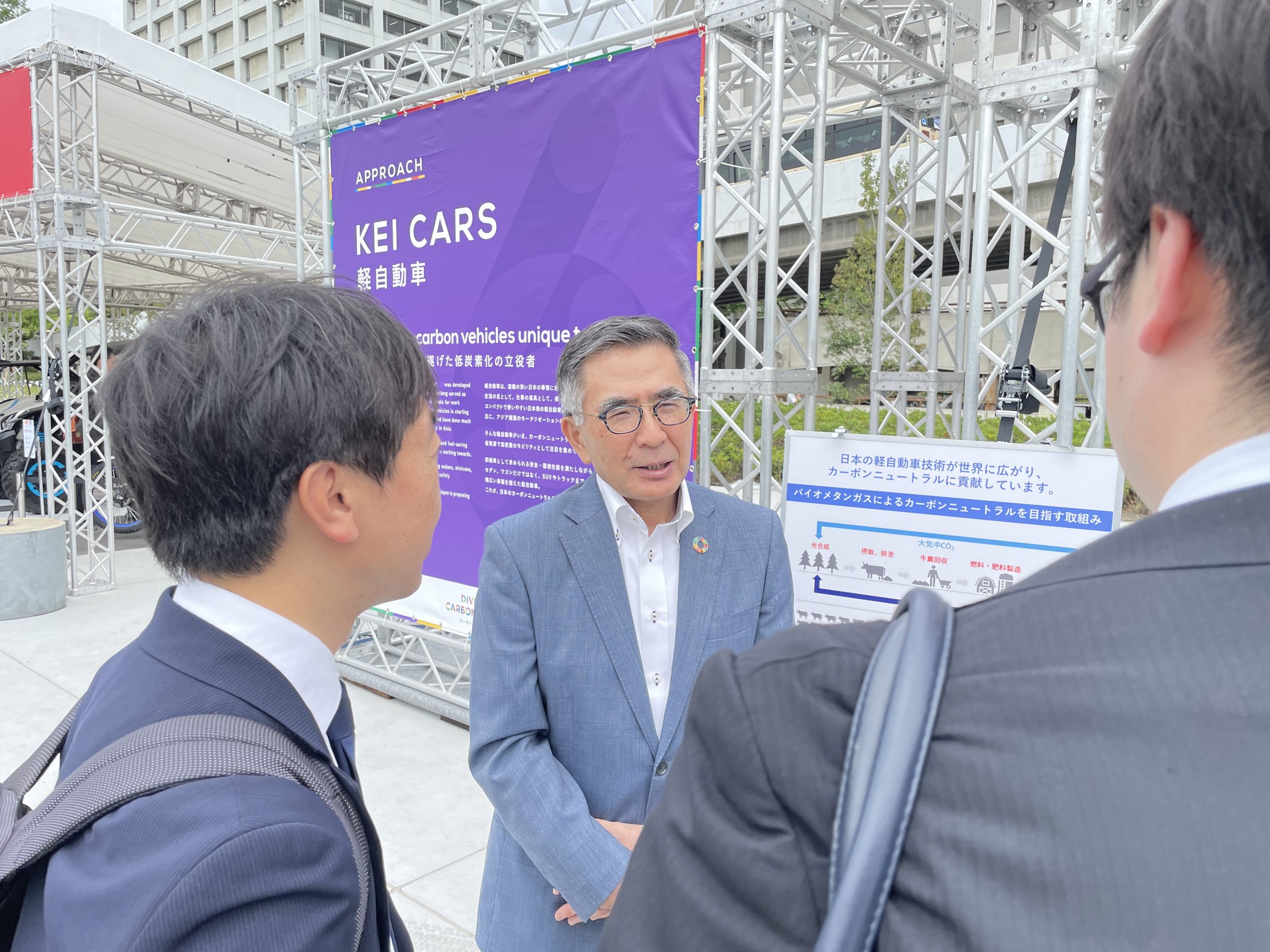 広島ゲートパークプラザの展示会場では、自工会会員各社および異業種との協業などによる様々な車両や技術が紹介され、「山の登り方は一つではない」というカーボンニュートラルへの多様な選択肢の具体例を提案しました。2日目となる19日には副会長7人および理事で地元広島のマツダ社長である丸本明が駆けつけ、報道陣からのインタビューに応じたり展示の概要やそれぞれの思いを語りました。