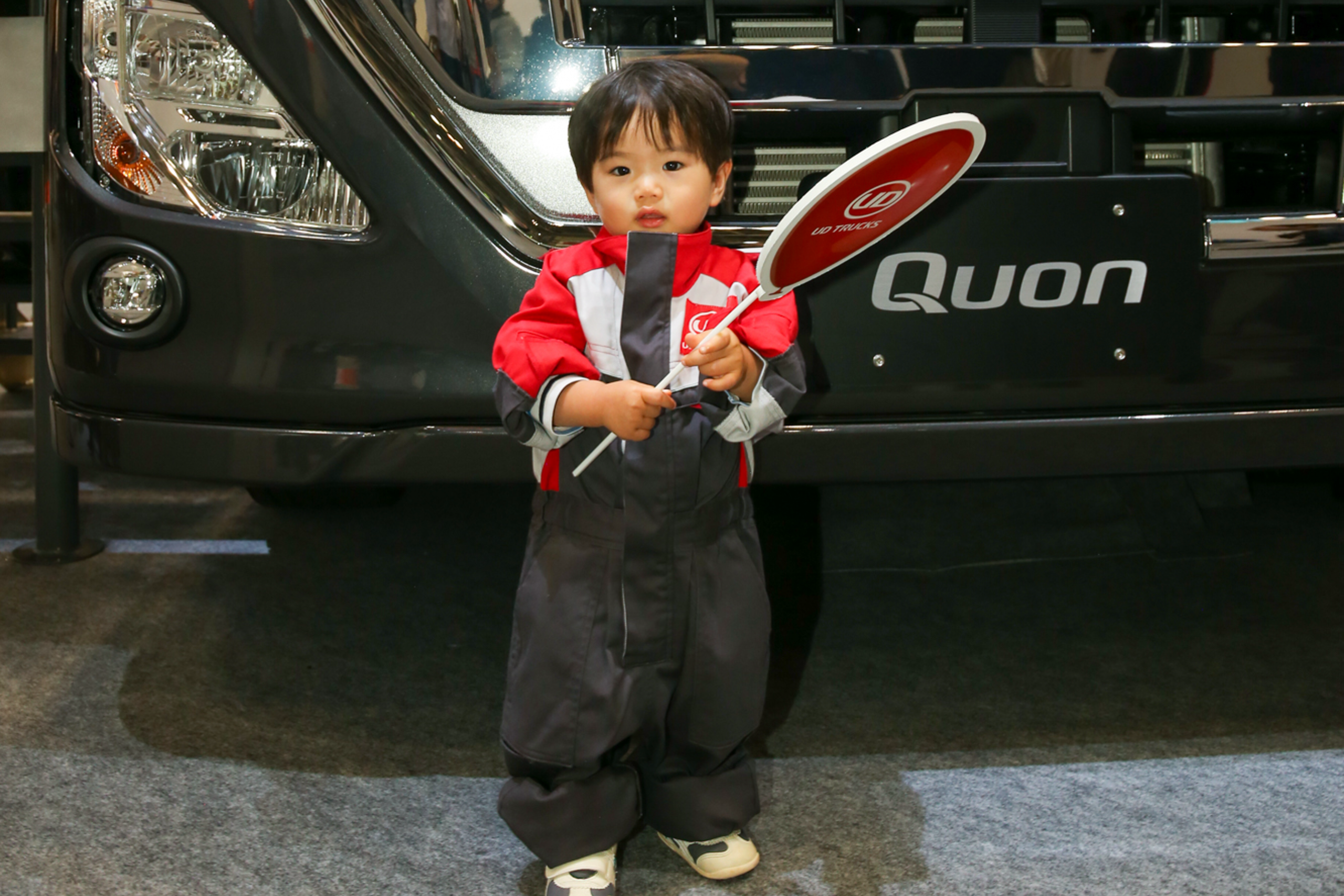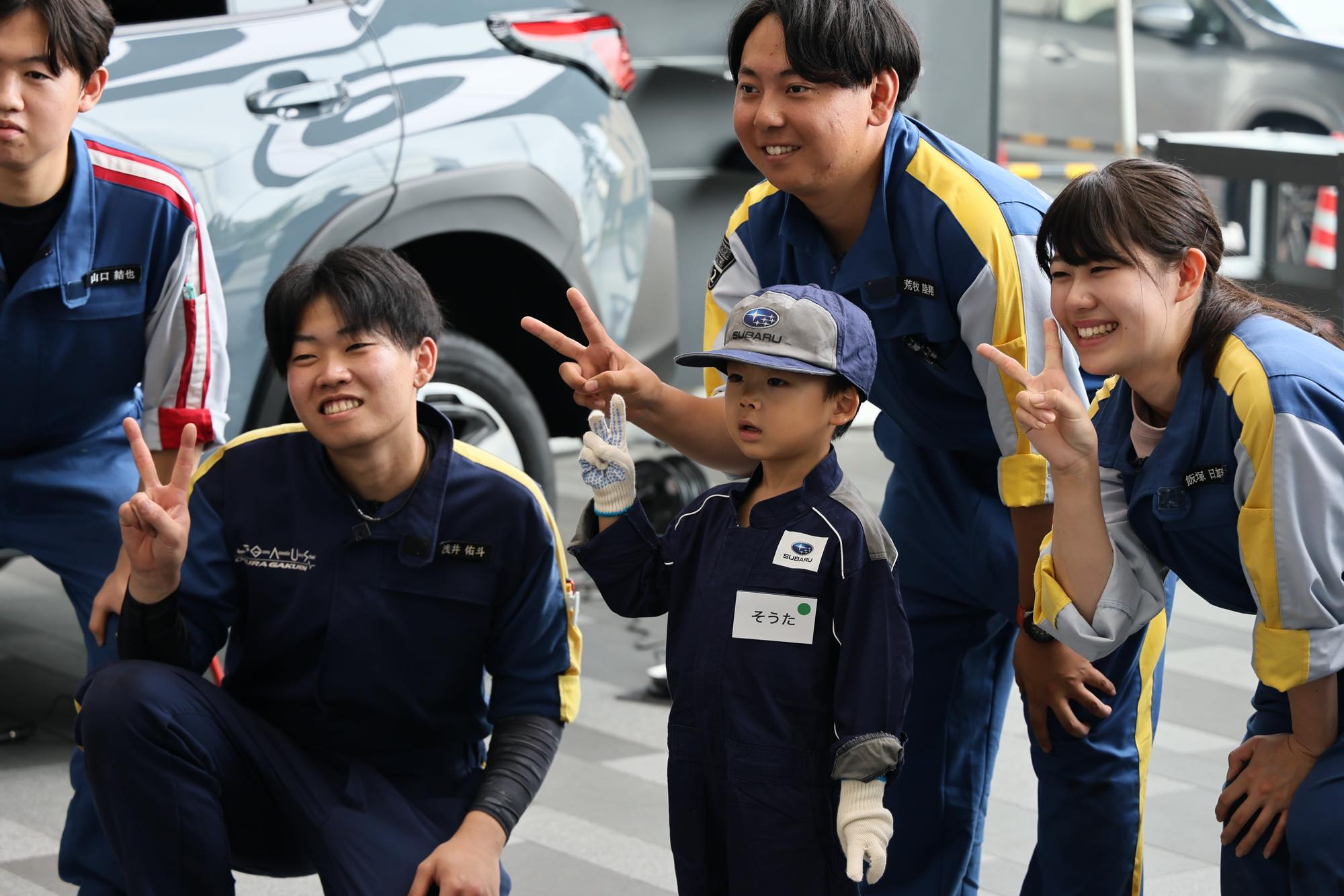 SUBARU・UDトラックスのメカニックスーツを着て記念写真を撮影します。メカニックなったつもりでかっこよくポーズを決めよう!