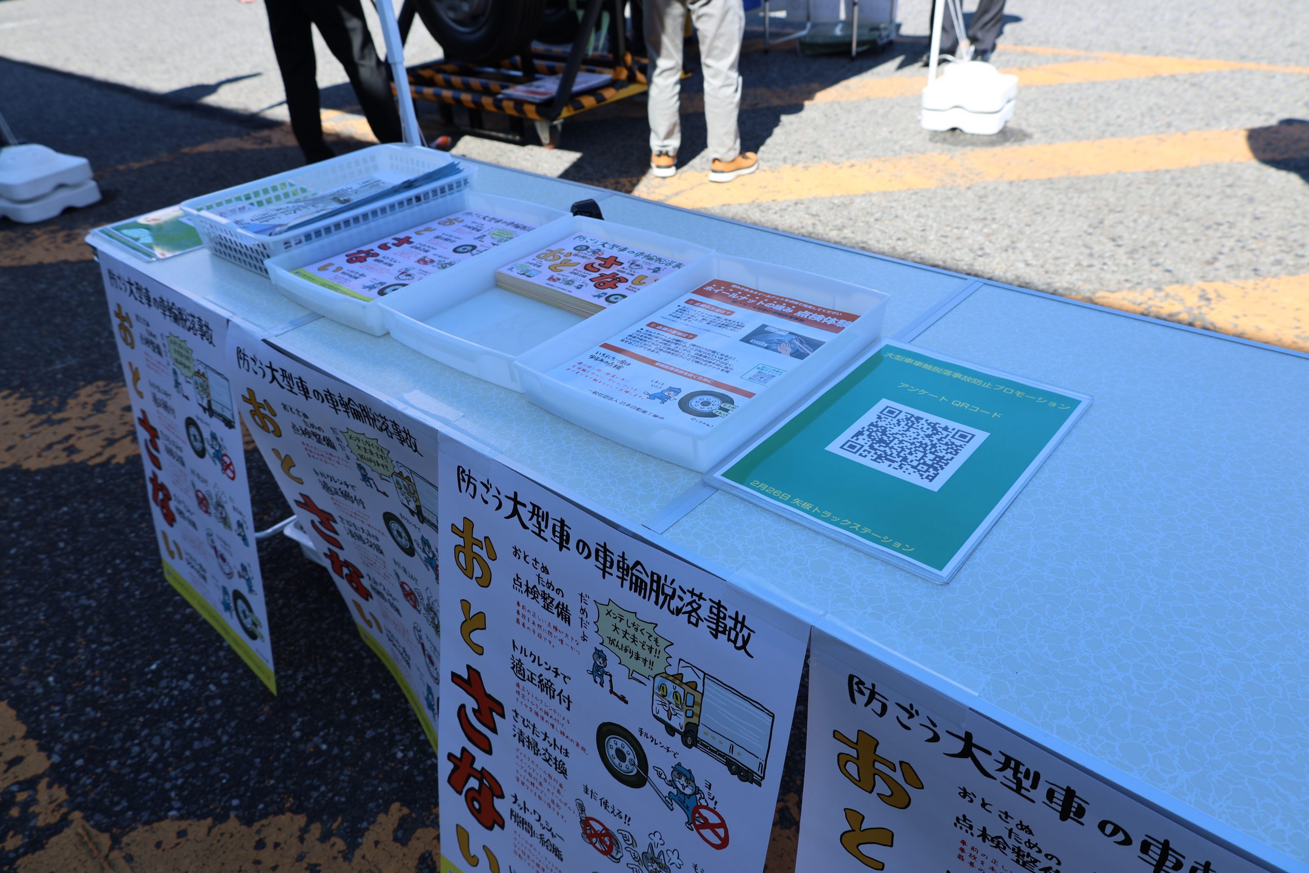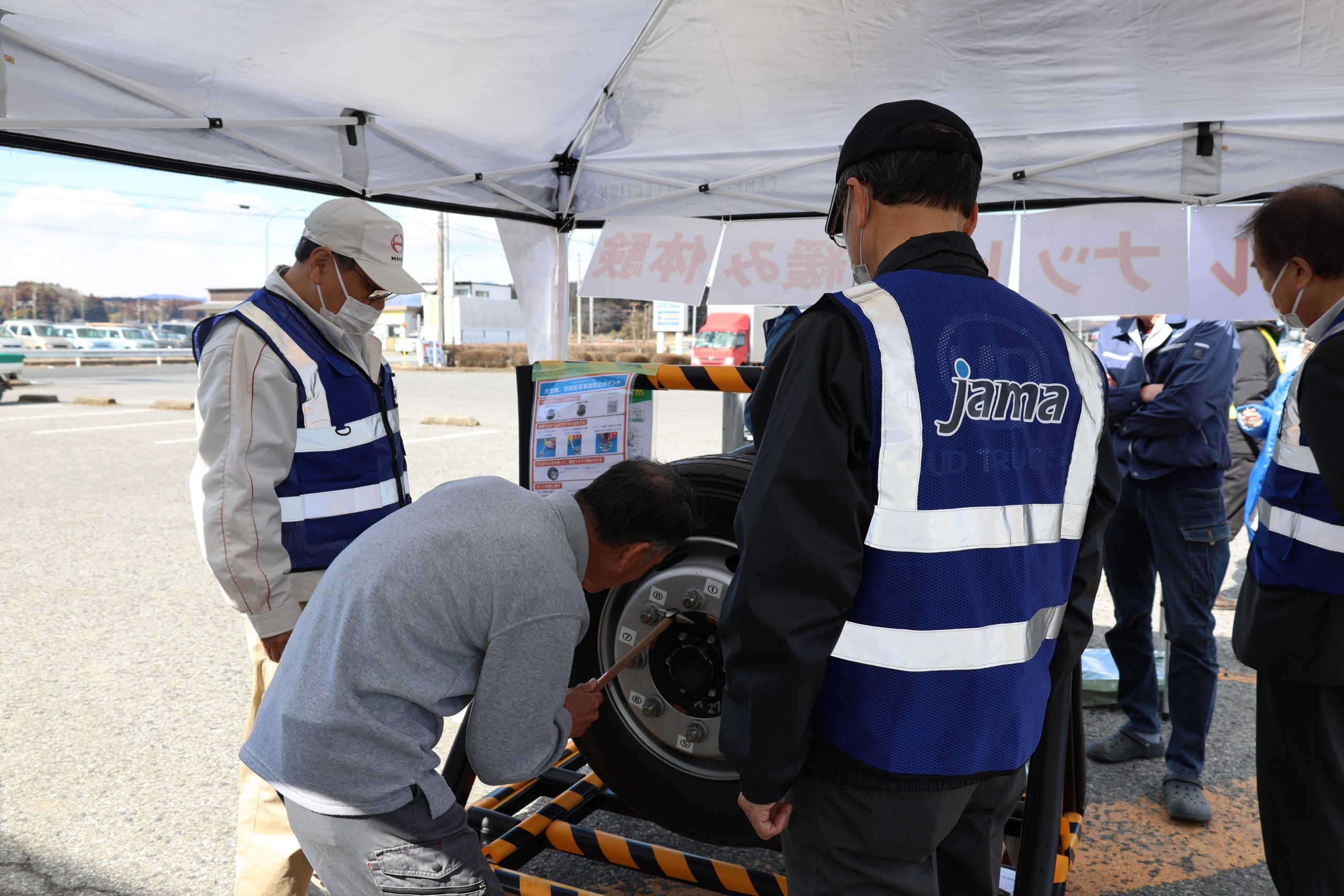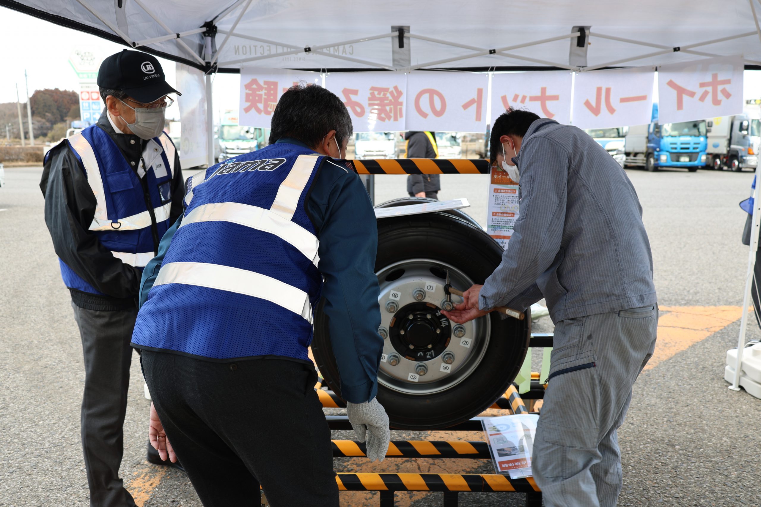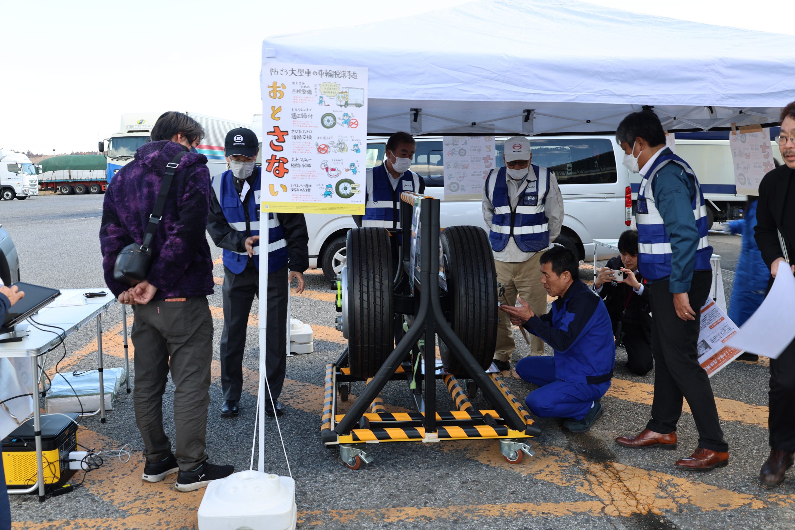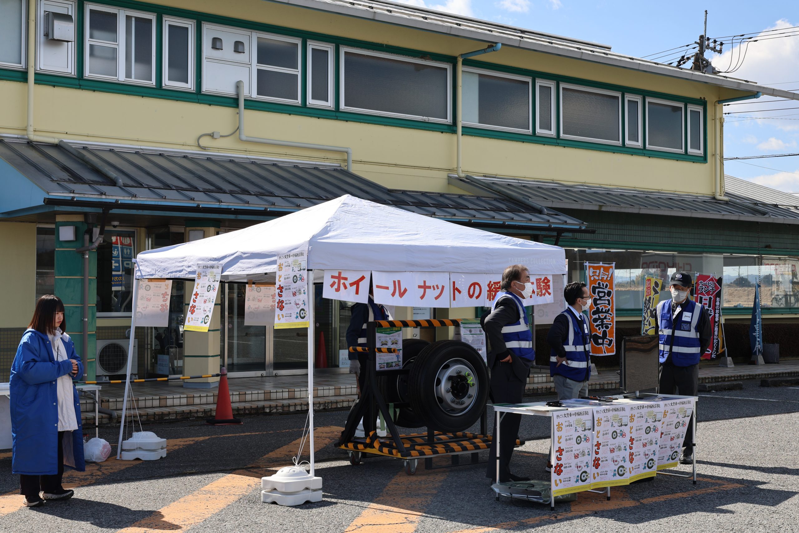 今年度最後となる6回目の街頭啓発活動が、2月26日に矢板トラックステーションにて開催されました。ナットの緩み点検コーナーを設け、実際の点検作業を体験いただくなど、多くの大型車ユーザーに日常点検の重要性を伝えました。
