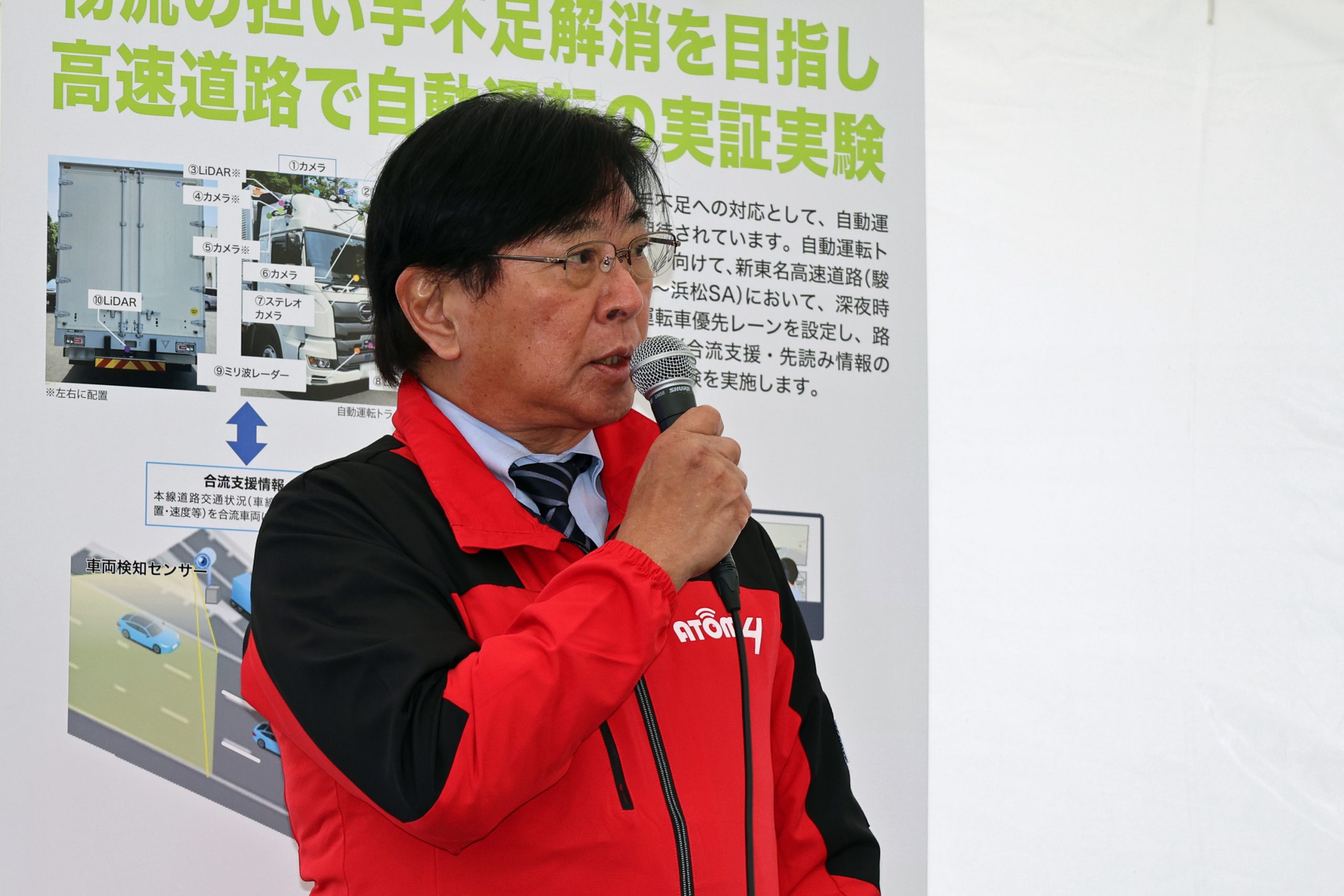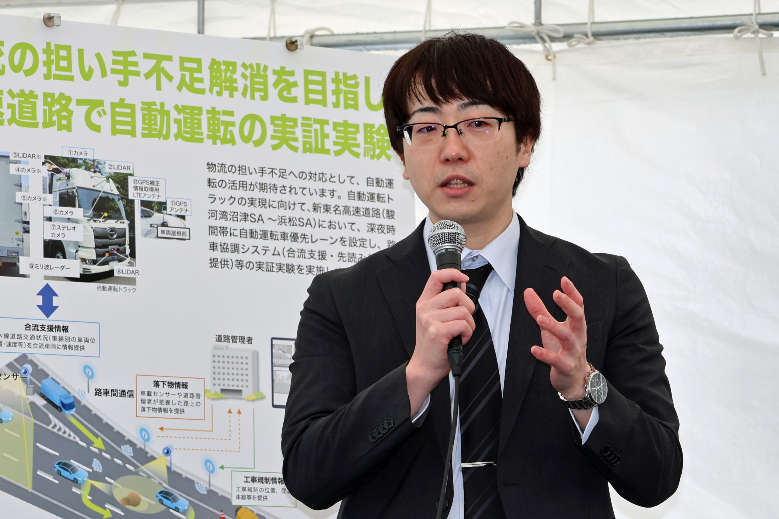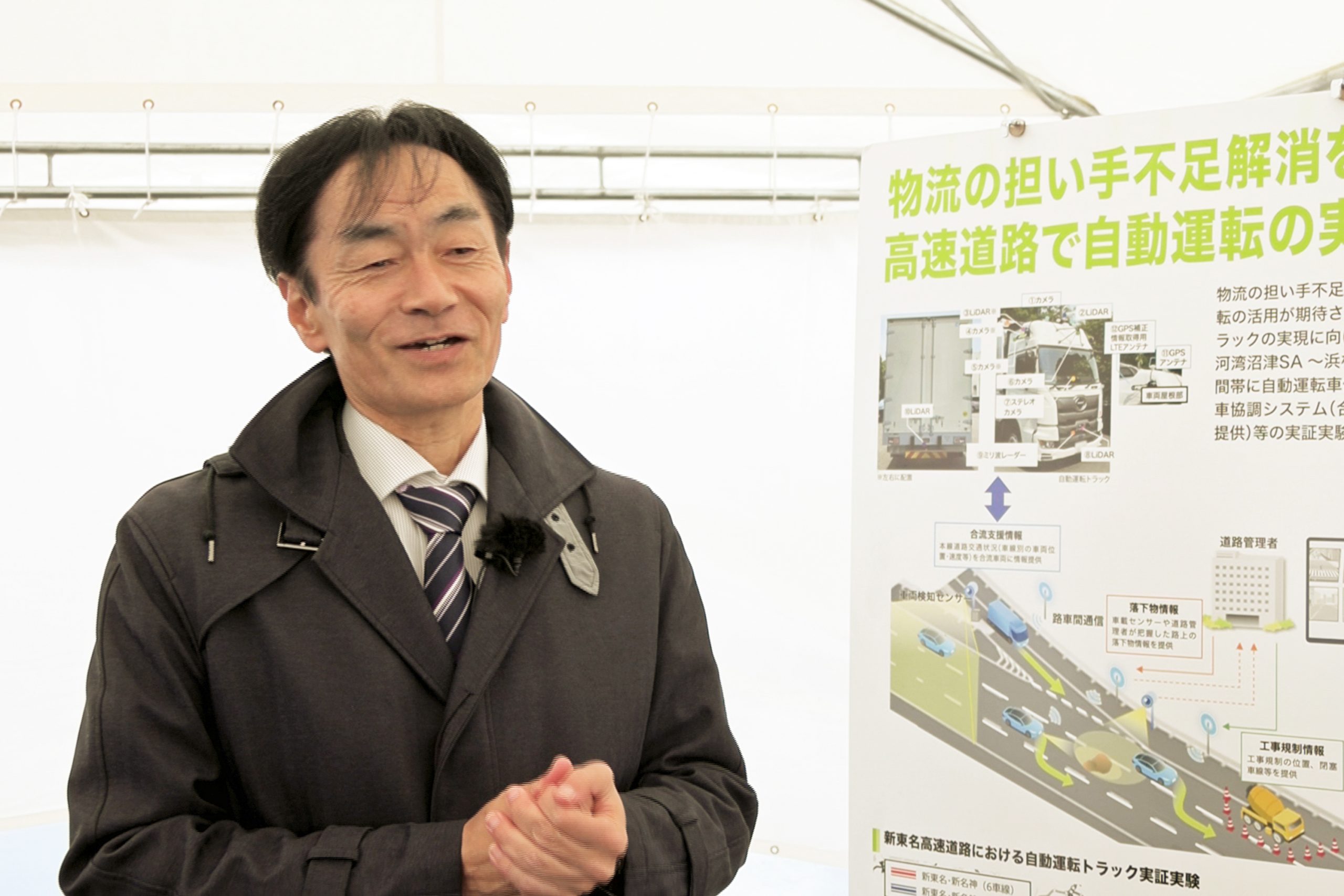 (今回の実証実験では)駿河湾沼津SAから浜松SA間で自動運転を優先的に走らせるレーンを設けています。このレーンの中では、様々なインフラと車が連携して、より安全な自動運転が行えるインフラ設備が整っています。この実証実験では、長期間インフラを常設していただくことで夜間や雨など様々な環境で実証実験が行うことができ、自動運転の進歩に非常に役立つと思っています。