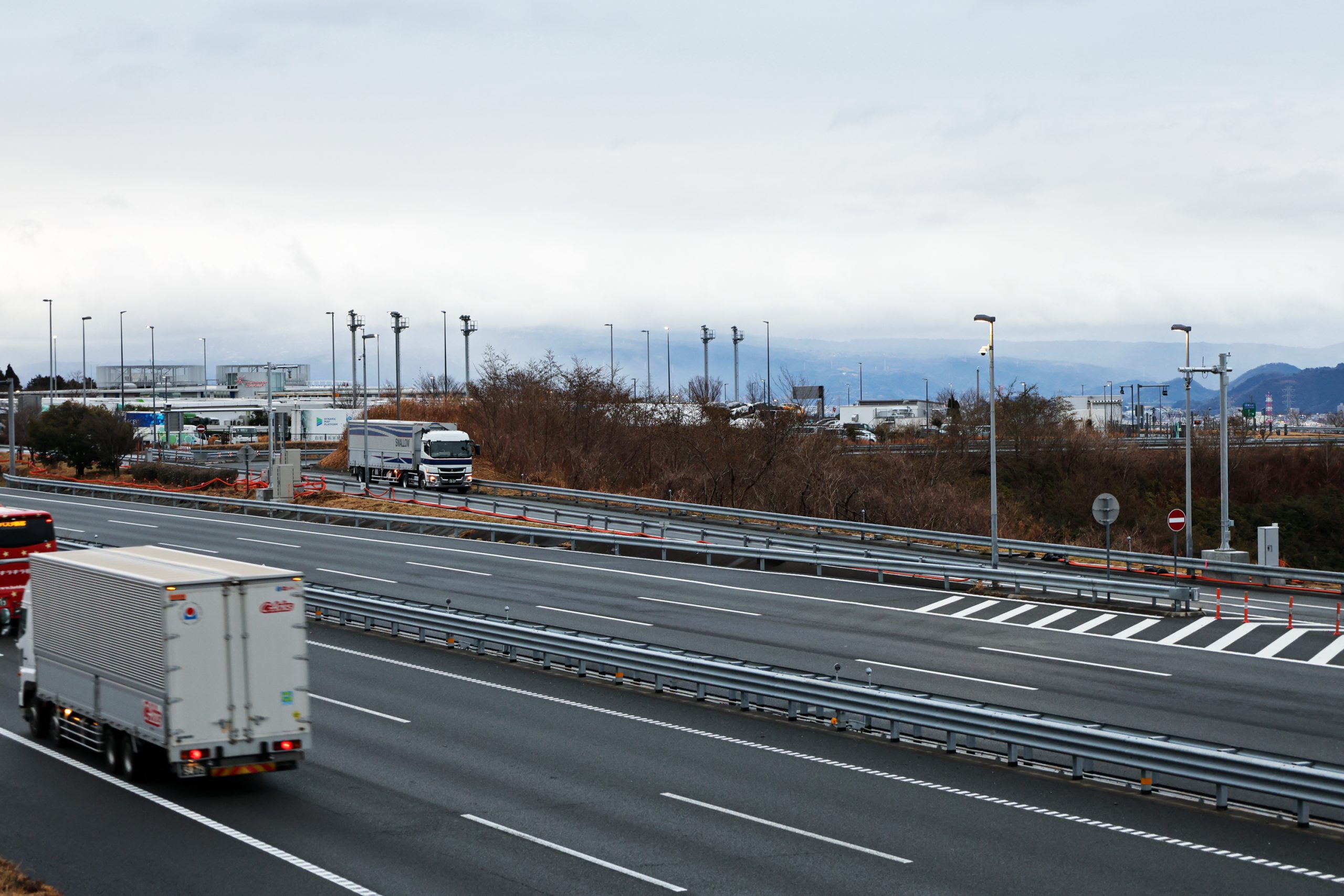 今回の取材イベントでは、自動運転車優先レーン及び合流支援情報や先読み情報を提供するインフラ設備などを本線上で見学するツアーが行われ、実際に自動運転トラックが普通通行車両とともに走行する様子を報道陣が熱心に取材しました。